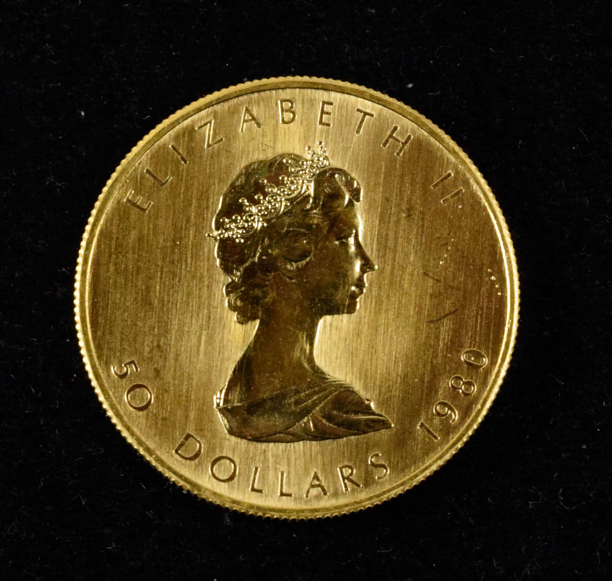 1980 Canadian Maple Leaf (1) ounce gold coin (EX) Popular bullion coin struck in (1) ounce of gold. Hint of light storage wear: EX ($2,000-$3,000)
