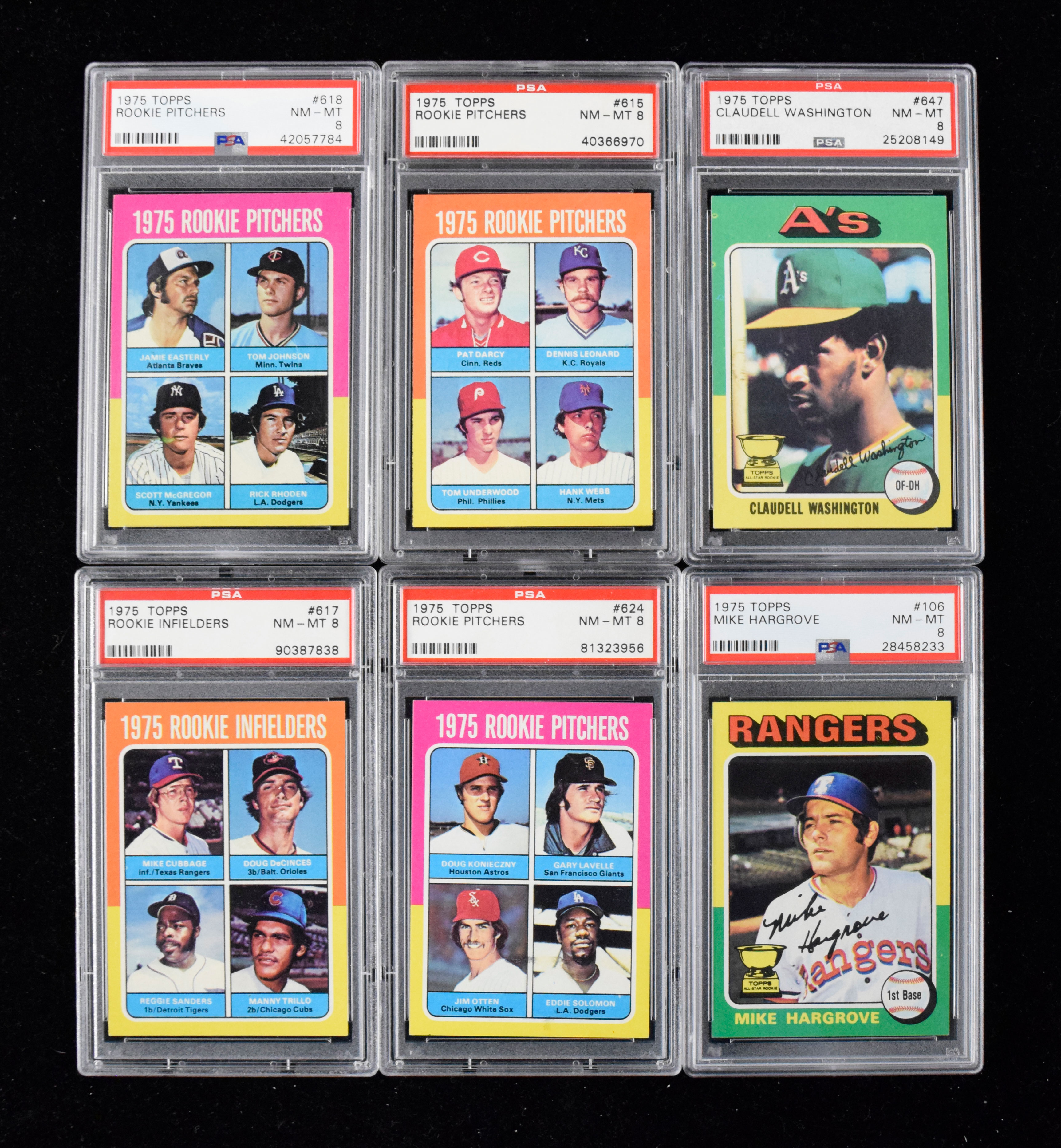 Description:Lot of (15) 1975 Topps cards, including Claudell Washington & rookies, all graded PSA 8 (NM/MT). Outstanding lot of high-grade 1975 Topps cards, each of which has been graded PSA 8 NM/MT. Includes #s 647 Claudell Washington, 51 Bob Forsch, 407 Herb Washington, 143 Cliff Johnson, 481 Will McEnaney, 302 Rick Burleson, 392 Bruce Bochte, 615 Darcy/Leonard/Underwood/Webb, 106 Mike Hargrove, 567 Jim Sunberg, 628 Ron LeFlore, 624 Konieczny/Lavelle/Otten/Solomon, 618 Easterly/Johnson/McGregor/Rhoden/619 Ayala/Nyman/Smith/Turner, and 617 Cubbage/DeCinces/Sanders/Trillo: PSA 8 NM/MT.