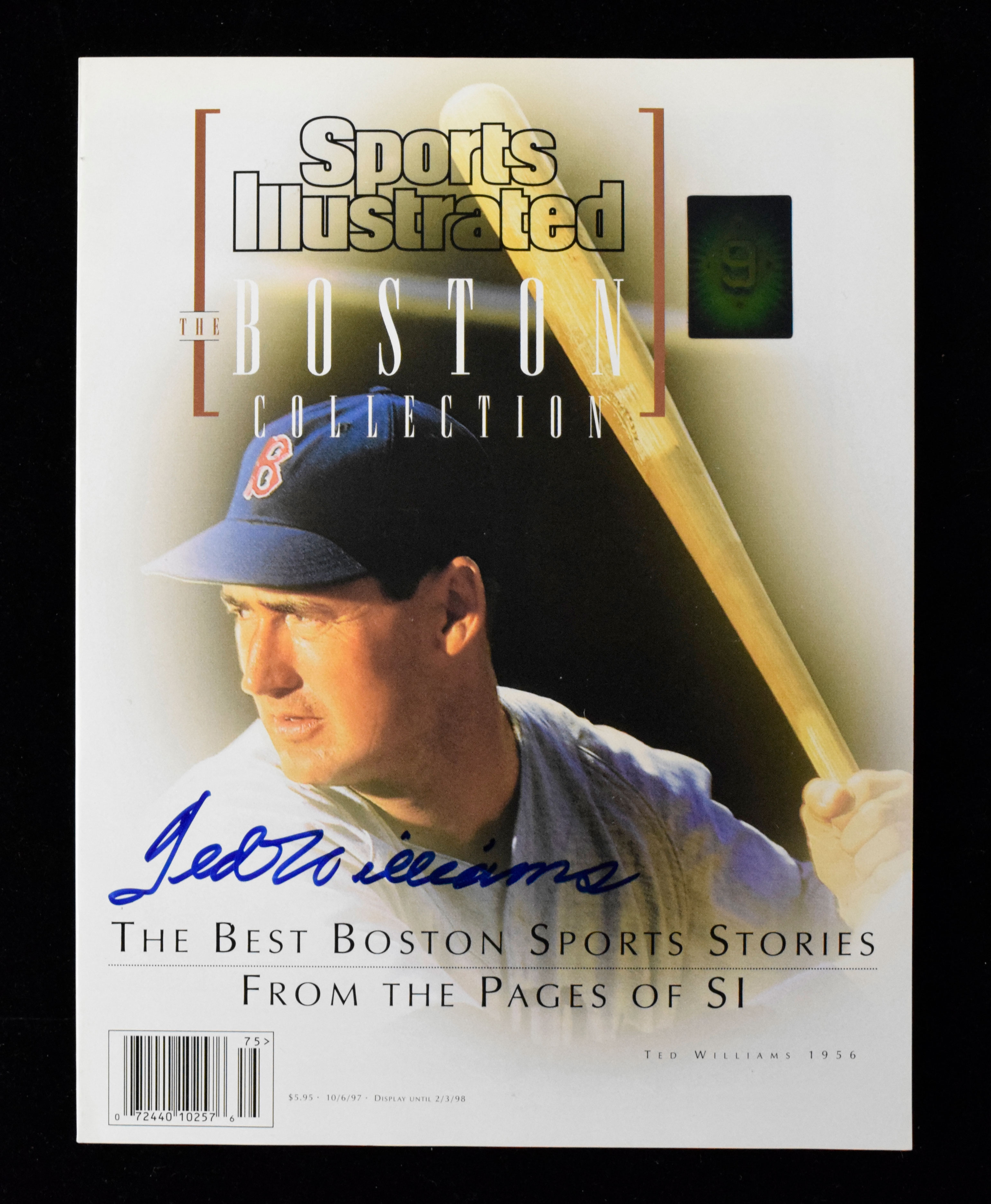Description:Ted Williams autographed Sport Illustrated (Green Diamond) (NM) Bold blue marker autograph rating 9 out of 10 appears on magazine showing little mentionable wear. Includes Green Diamond COA and their hologram is affixed: NM