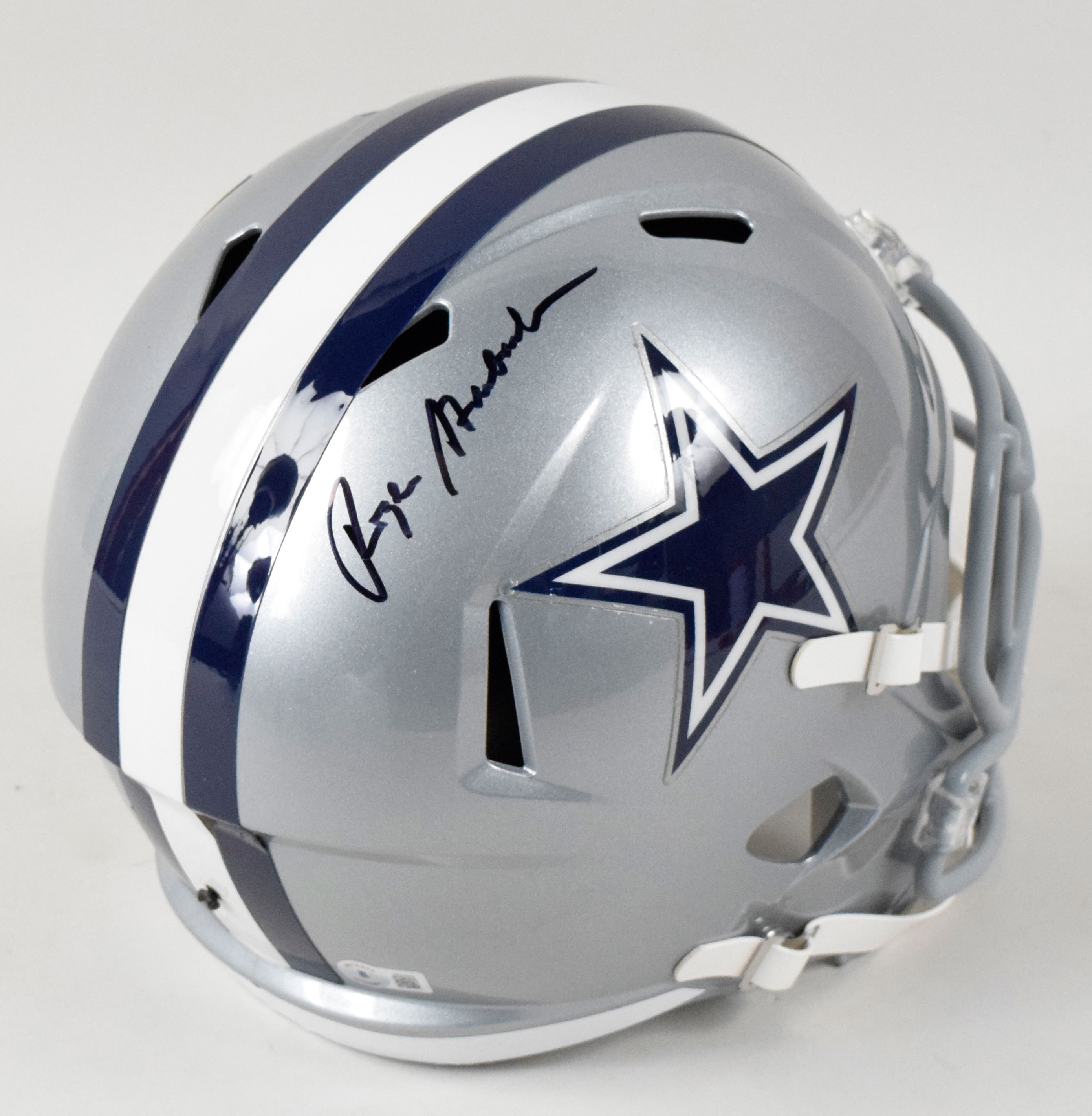 Description:Roger Staubach signed Dallas Cowboys full size helmet - Beckett Witnessed (NM). Riddell full size Cowboys replica helmet signed by Staubach in black marker. Signature rates 8/9 out of 10. Beckett Witnessed serial #ed hologram sticker is on the helmet: NM