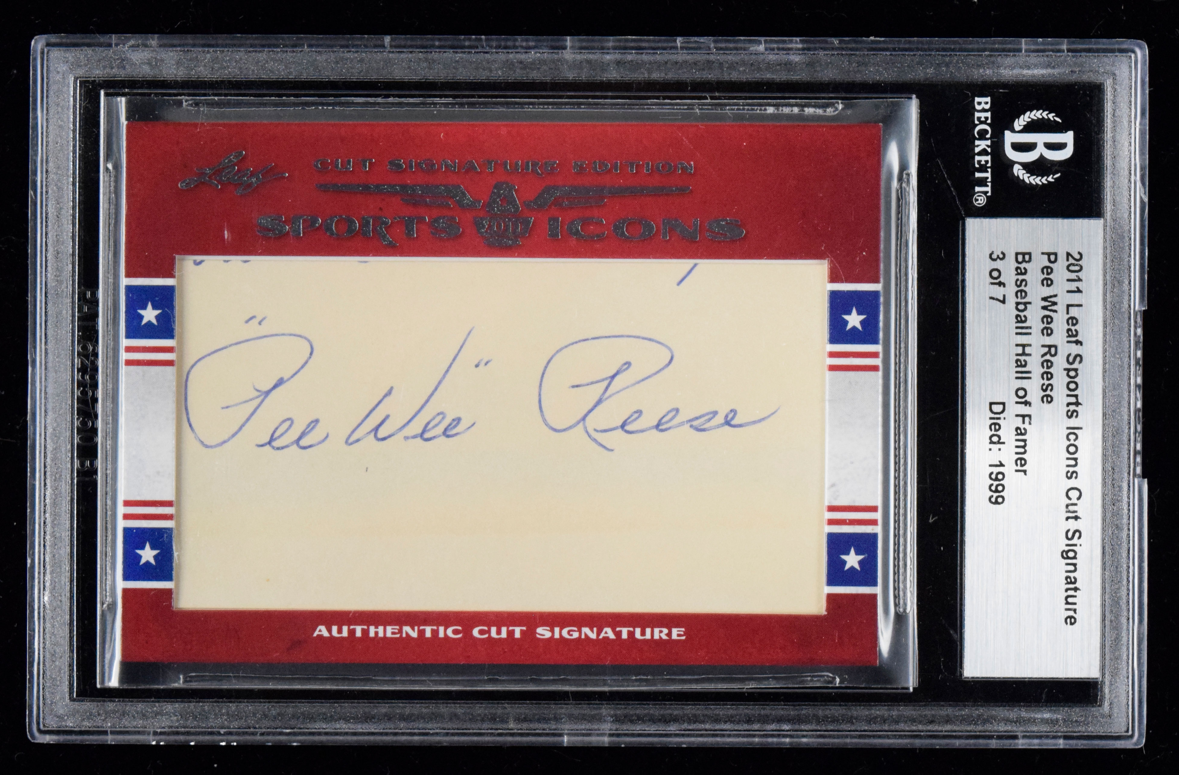 Description:Pee Wee Reese signed 2011 Leaf Cut Signature Edition insert card numbered 3/7 (NM/MT). 2011 Leaf Cut Signature Edition "Sports Icons" signed by Reese in blue ink. Signature rates 9/10 out of 10. Numbered 3 of 7: NM/MT