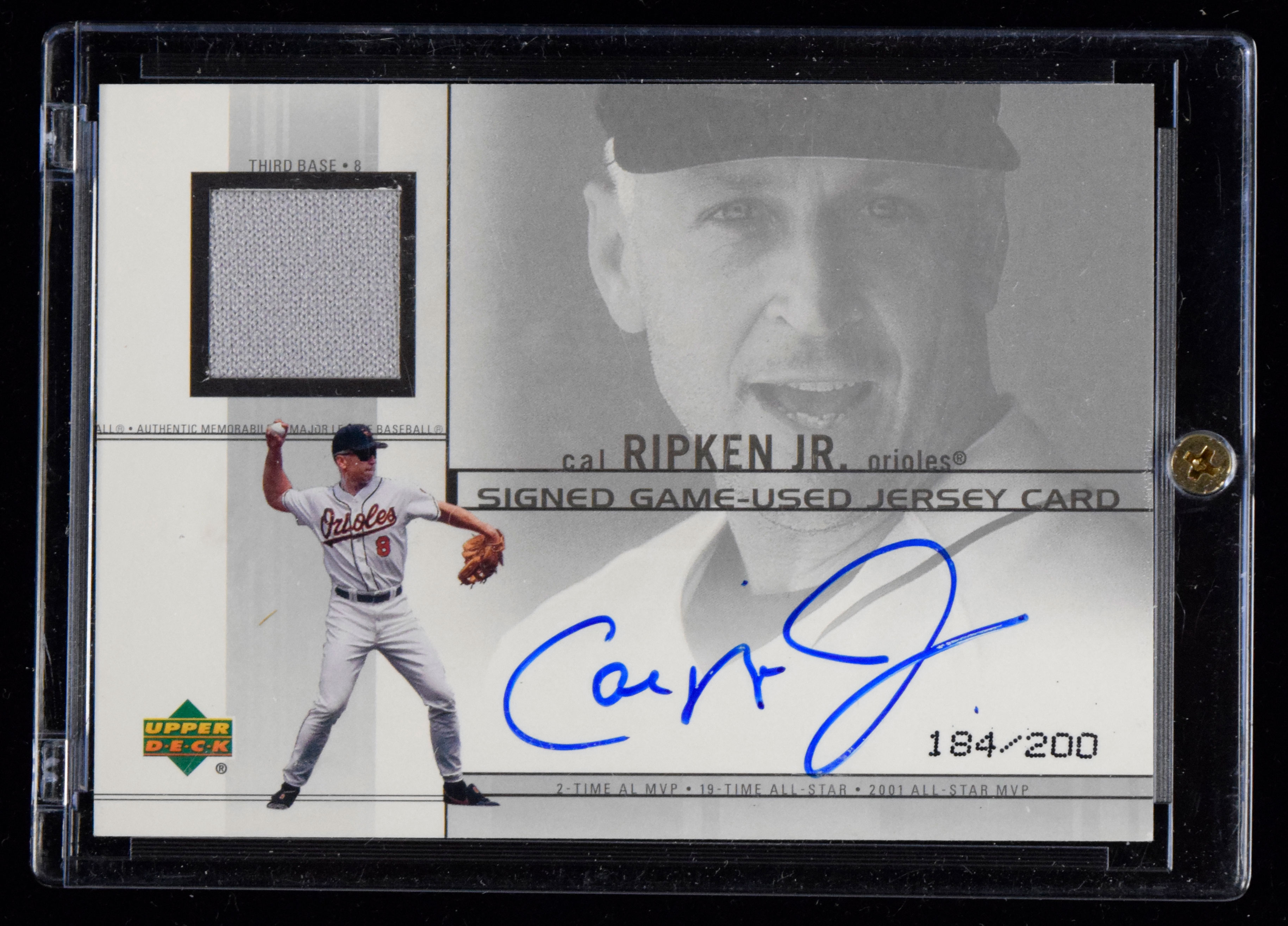 Description:Cal Ripken Jr. signed 2002 Upper Deck serial numbered jersey relic insert card (NM). 2002 Upper Deck "Signed Game-Used Jerseys" #J-CR signed by Ripken in blue marker. Signature rates 9 out of 10. The card is #ed 184/200: NM