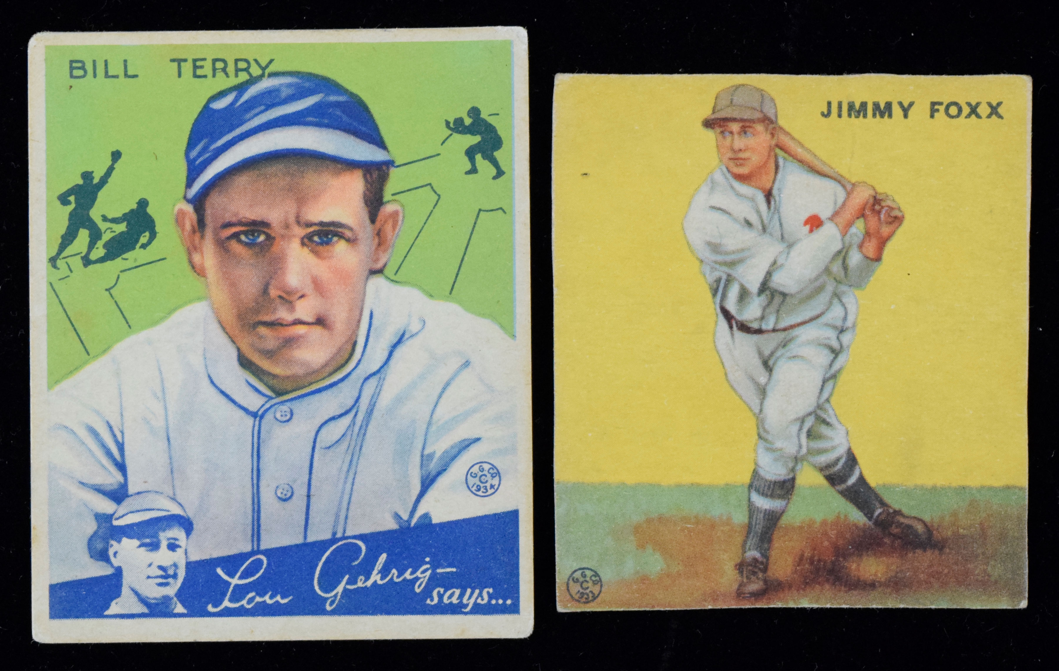 Description:Lot of (3) 1933 and 1934 Goudey HOFers, with Jimmie Foxx and Bill Terry (extremely trimmed - VG/EX). Lot of Hall of Famers includes 1933 Goudey #29 Jimmie Foxx (extremely trimmed on all four sides) and 1934 Goudey #21 Bill Terry (VG/EX). Range: Extremely trimmed - VG/EX.