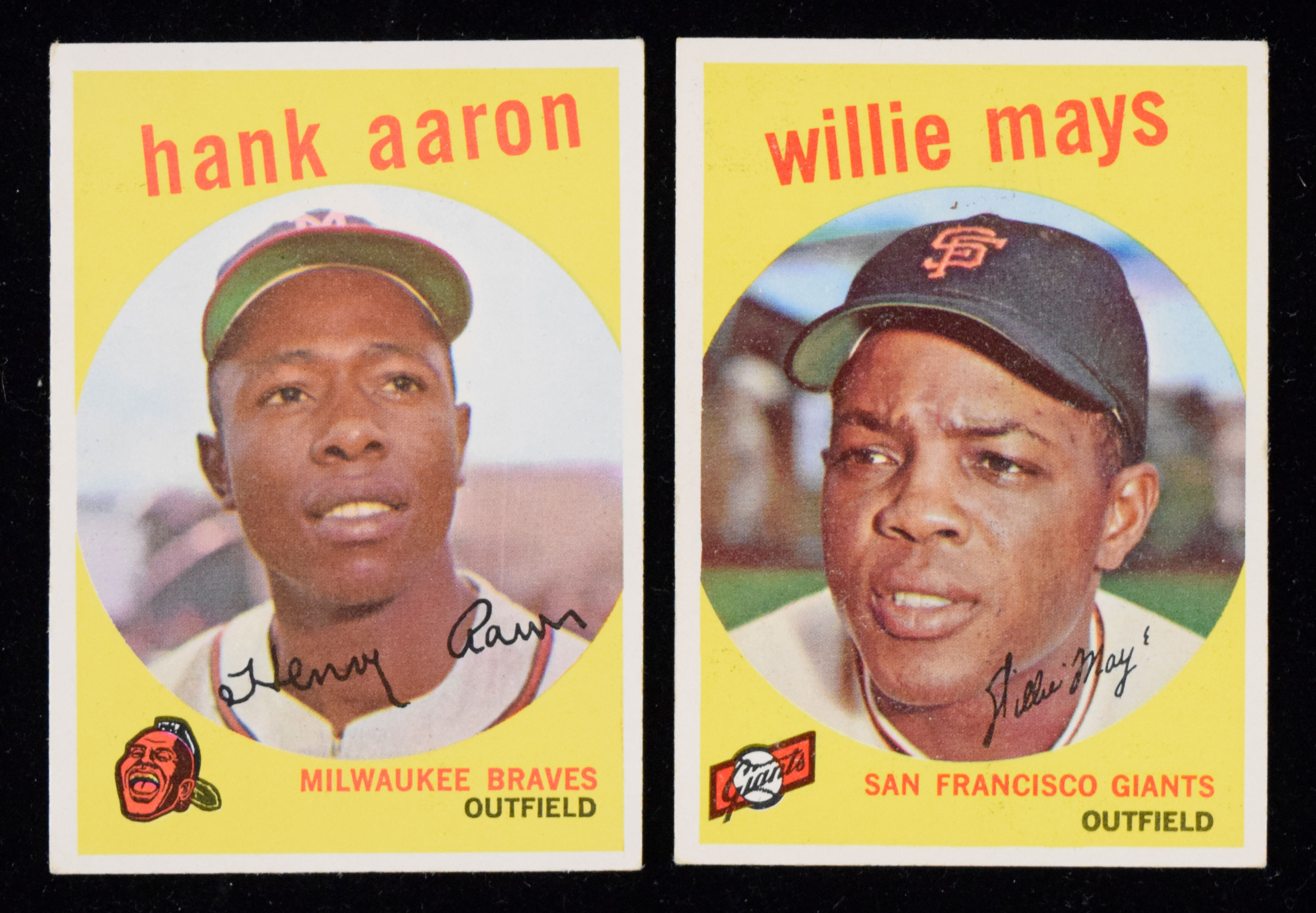 Description:Centered lot of (2) 1959 Topps key cards, with Willie Mays and Hank Aaron (VG/EX). Both cards are nicely centered and free of creases, with #380 Hank Aaron (VG/EX) and 50 Willie Mays VG/(EX). Both cards have corner and edge wear, and backs of both are clean. Range: VG/EX.