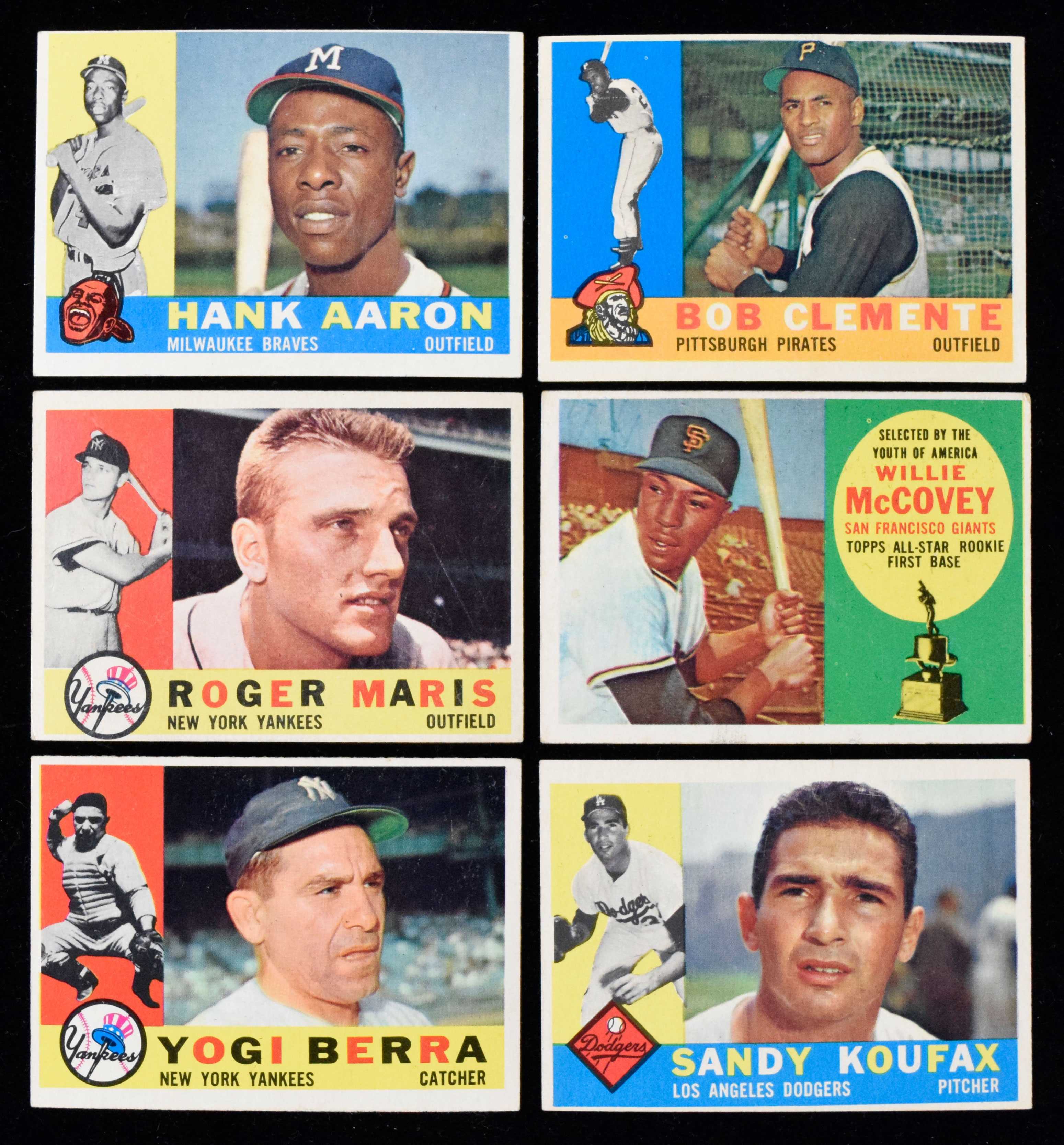 Description:Lot of (8) 1960 Topps HOFers, including Aaron, Clemente and Koufax (PR-EX OC). High-value but generally lower grade assortment of key cards from the 1960 Topps set includes #s 227 Casey Stengel (VG), 326 Roberto Clemente (VG OC), 490 Frank Robinson (EX OC), 377 Roger Maris (VG), 300 Hank Aaron (VG; miscut), 480 Yogi Berra (VG/EX), 316 Willie McCovey RC (GD) and 343 Sandy Koufax (PR). Range: PR-EX OC.