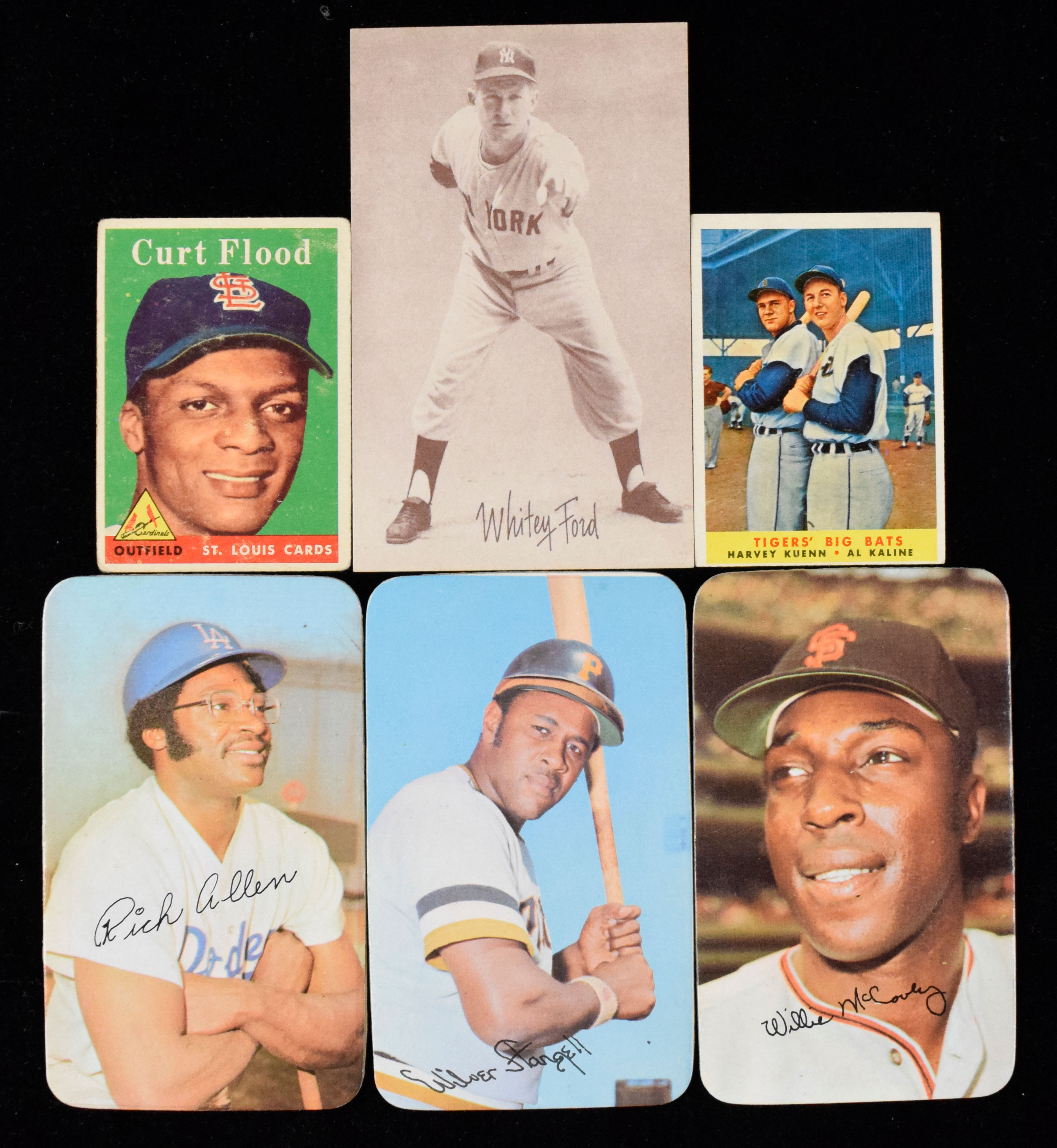 Description:Lot of (100+) 1944-1971 cards, including 1958 Topps and 1971 Topps Super (PR-EX). Includes (1) 1944-1966 Exhibits Whitey Ford; (72) 1958 Topps cards, with mostly commons and minor stars and few stars, such as #s 115 Jim Bunning (PR; writing and paper loss), 464 Curt Flood RC (PR; paper loss), 304 Harvey Kuenn/Al Kaline, 424 Larry Doby and five team cards; (29) 1971 Topps Super cards with mostly commons and minor stars and a few stars, such as #s 40 Richie Allen, 43 Willie Stargell and 46 Willie McCovey and (1) 1970 Topps Super Football #4 Len Dawson. Most cards appear VG-VG/EX with some better and some worse. Range: PR-EX.