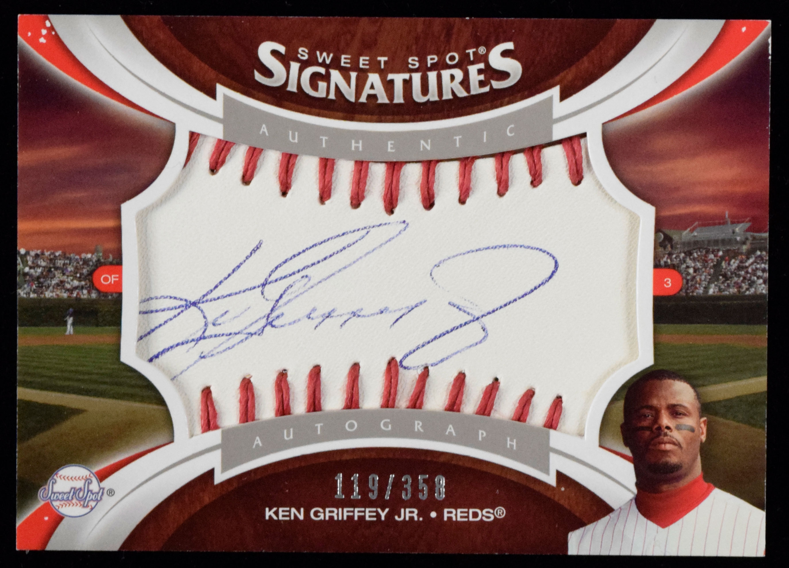 Description:Ken Griffey Jr. signed 2006 Upper Deck Sweet Spot Update serial numbered insert card (EX). 2006 Upper Deck Sweet Spot Update "Veteran Signatures Red Stitch Blue Ink" #SS-KG2 signed by Griffey in blue ink. Signature rates 8 out of 10. The card is #ed 119/358. Light surface wear near corners: EX