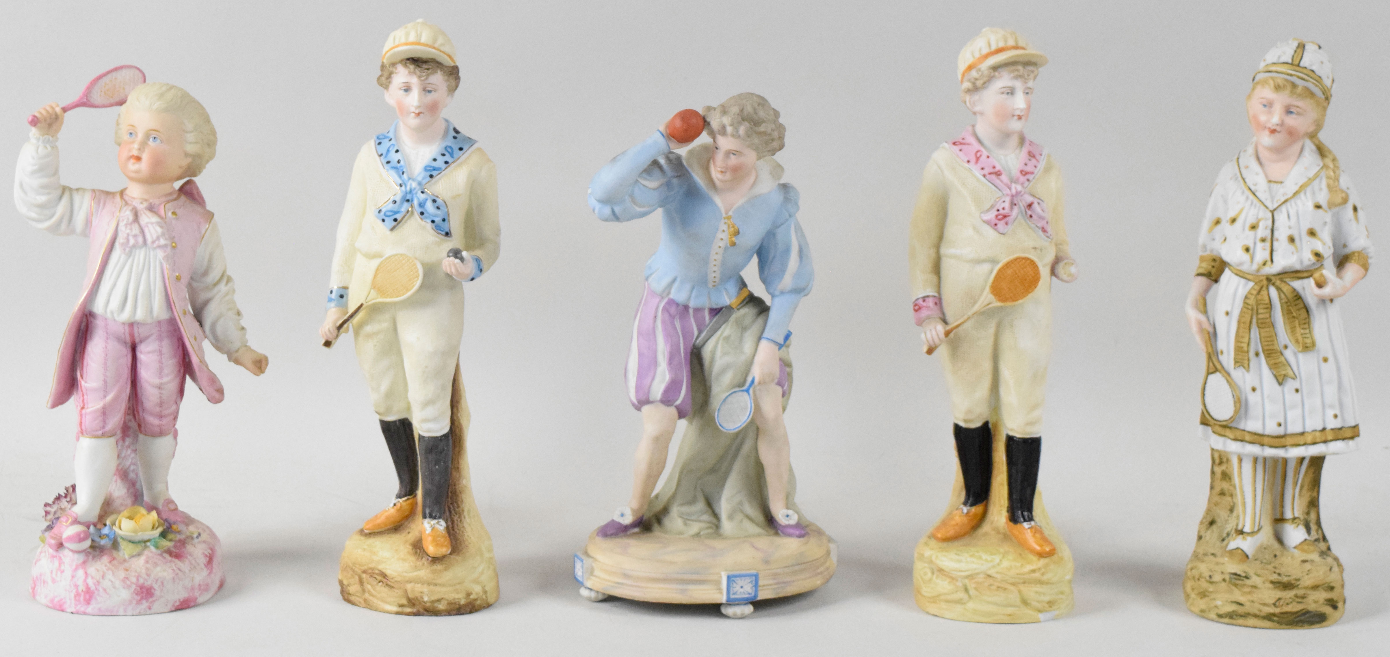 Description:Lot of (6) vintage German bisque porcelain tennis statues (GD-EX/MT). Heights range from 11.5" to 13" tall. Most appear to average EX overall with a few having some minor chips around the base, and one has its left hand broken off: GD-EX/MT