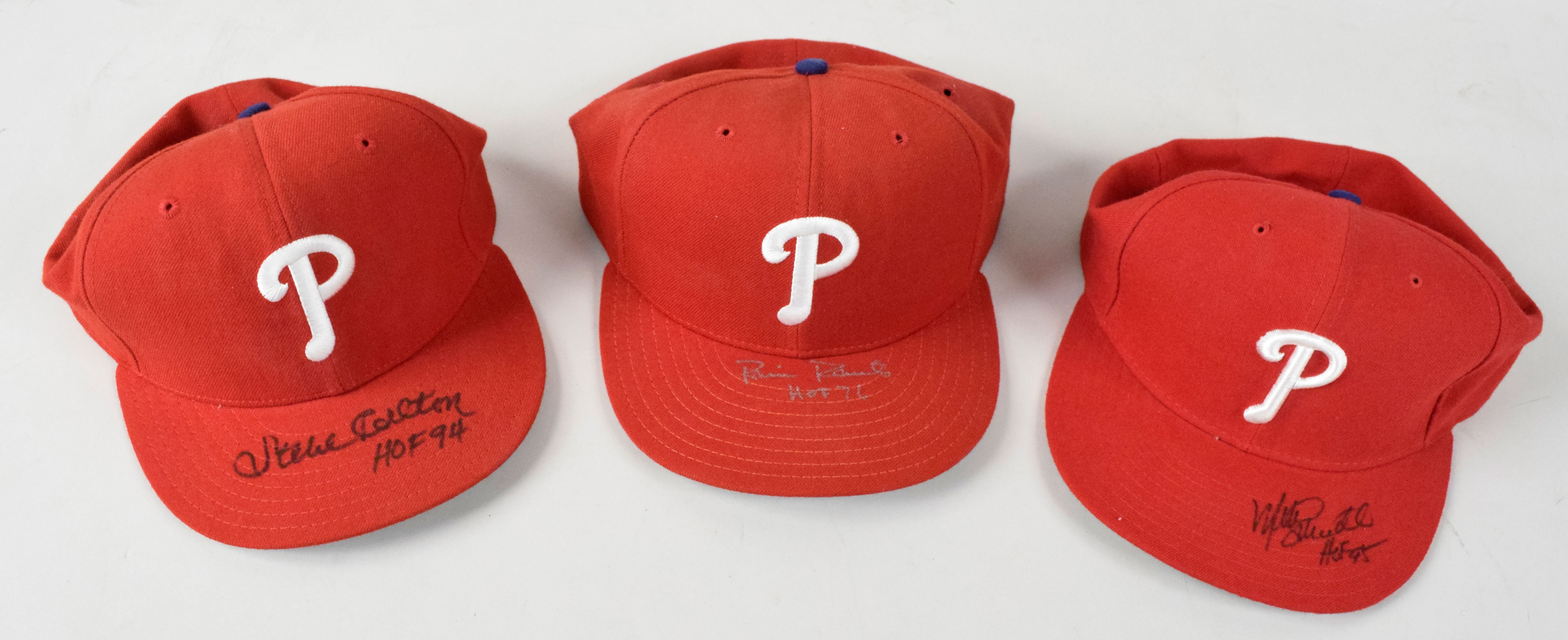 Description:Lot of (3) Philadelphia Phillies signed & HOF-year inscribed hats, with Schmidt, Carlton & Roberts (Sigs. NM-NM/MT). Each is a New Era 5950 Phillies lot hat, with each signed on the bill. Includes (1) signed by Robin Roberts with "HOF 76" inscription; (1) signed by Mike Schmidt with "HOF 95" inscription and (1) signed by Steve Carlton with "HOF 94" inscription. Signatures rate 7/8 out of 10, and hats are unused: NM.