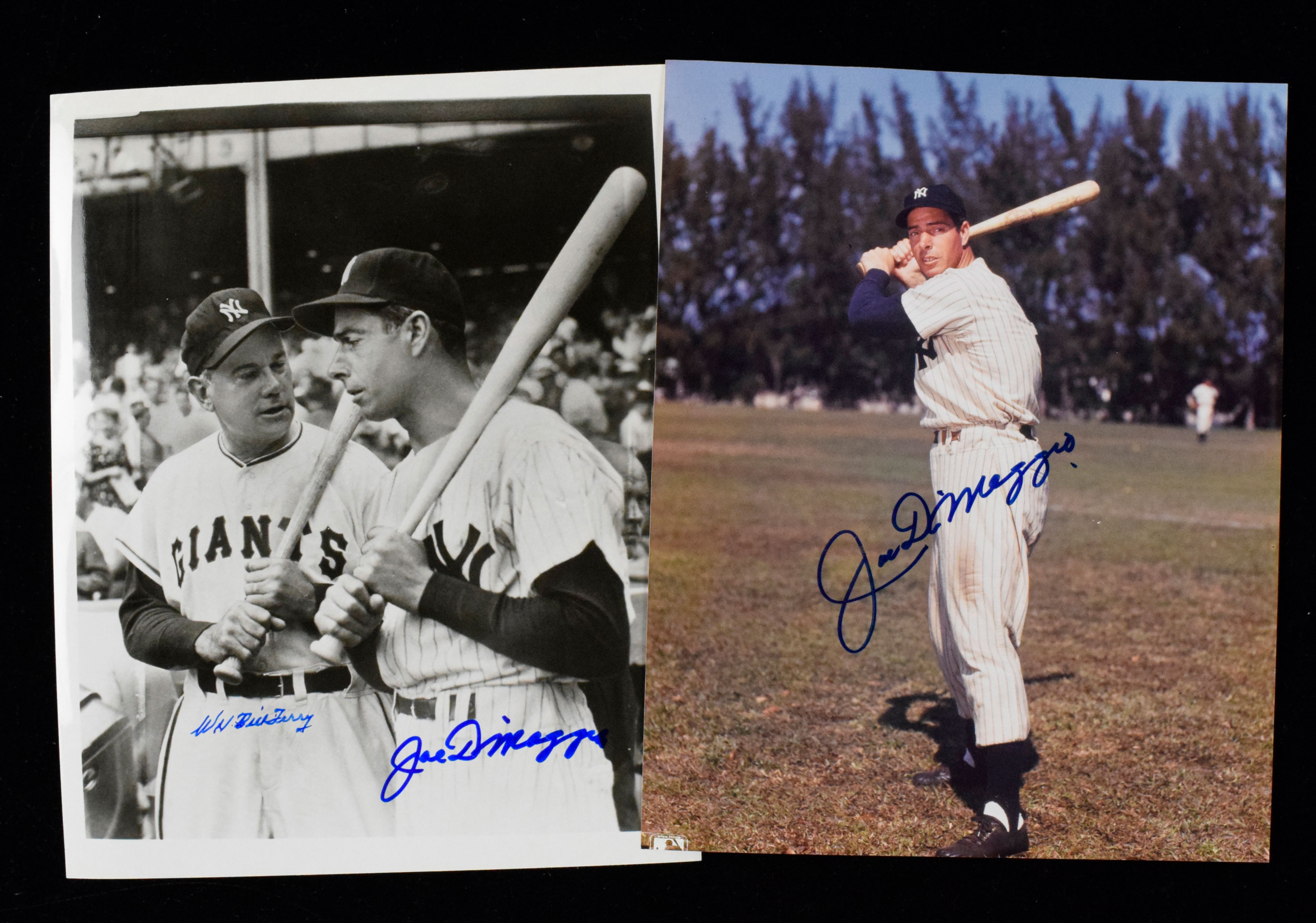 Description:Lot of (2) Joe DiMaggio autographed 8"x10" photos (Sigs. MT). Includes (1) color photo of Joe DiMaggio, signed by DiMaggio and (1) B&W photo of Bill Terry and Joe DiMaggio, signed by Terry and DiMaggio. Signatures rate 9 out of 10, and photos appear NM.