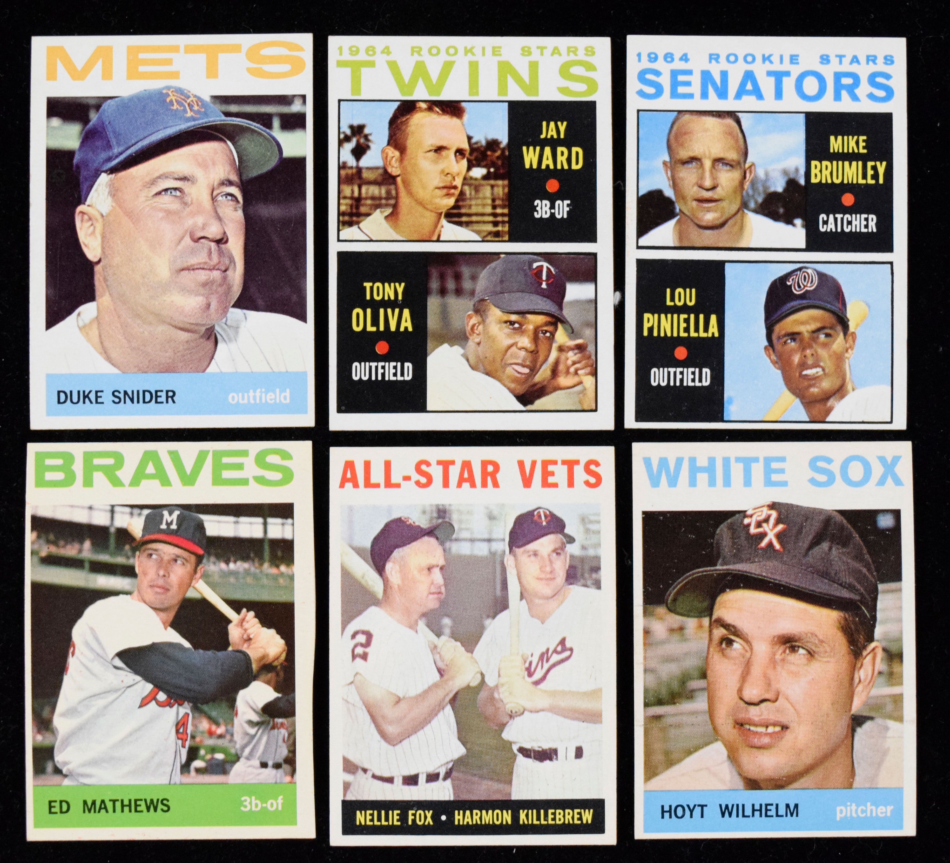 Description:Clean 1964 Topps partial set (246/587) with HOFers, including Tony Oliva, Duke Snider (Trimmed-EX/MT). Nice 1964 partial set features (246) different cards of the (587) issued, with card numbers ranging from #s 3 - 480 (no high numbers). Most cards have strong corners, though it should be noted that the majority appear to be off-center. Highlights include #s 167 Lou Piniella RC, 116 Tony Oliva, 155 Duke Snider, 81 Nellie Fox/Harmon Killebrew, 35 Eddie Mathews (trimmed/miscut), 100 Elston Howard, 13 Hoyt Wilhelm, (6) League Leader cards with Koufax, Aaron, Ford and others, and more. Most cards appear EX (with note on centering), with some better and some worse, including some badly miscut with no borders. Range: Trimmed-EX/MT.
