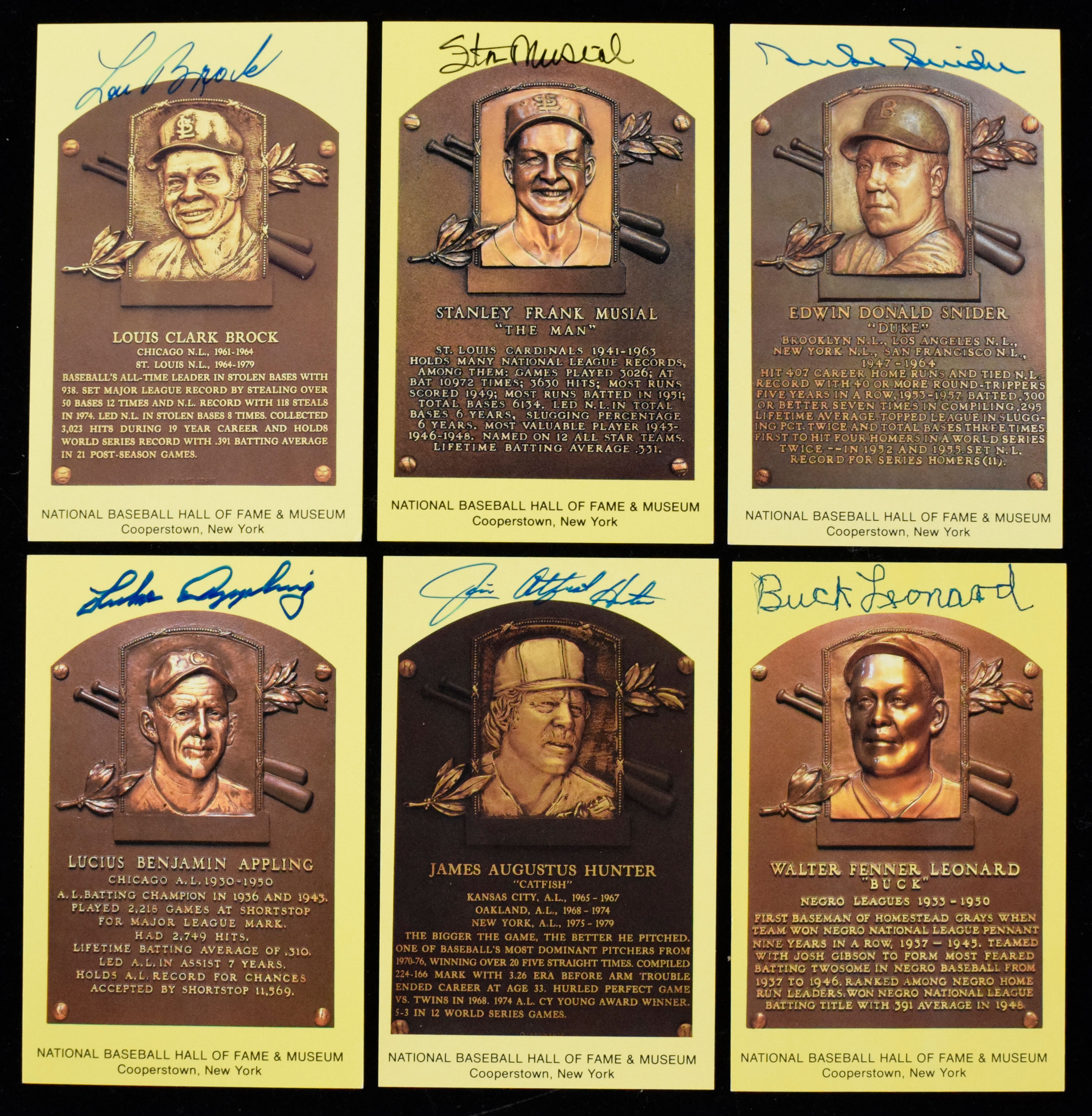 Description:Lot of (17) autographed HOF postcards, including Brock, Snider and Musial, all with JSA certs (Sigs. NM/MT-MT). Each Hall of Fame postcard has a JSA authentication sticker affixed, as well as a basic cert. All are signed on the front in marker. Includes Jim Catfish Hunter, Buck Leonard, Lou Brock, Rick Ferrell, Happy Chandler, Luke Appling, Enos Slaughter, (2) Brooks Robinson, Duke Snider, Robin Roberts, (2) Ralph Kiner, Warren Spahn, Stan Musial, Johnny Mize and Bob Feller. Signatures rate 8/9 out of 10, and postcards appear EX/MT-NM.
