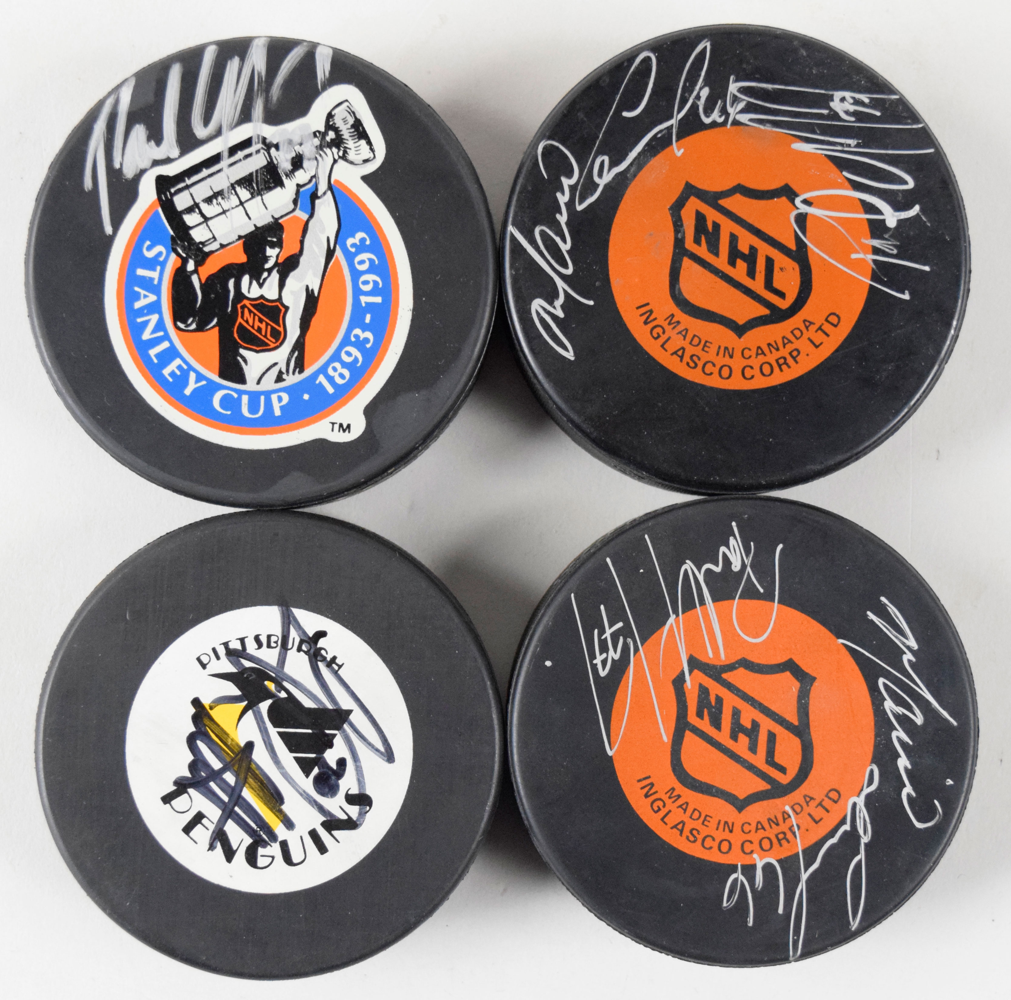 Description:Lot of (6) stars and HOFers signed hockey pucks (NM-NM/MT). Includes (2) Pittsburgh Penguins pucks dual-signed by Mario Lemieux and Paul Coffey, (2) 1993 Stanley Cup pucks signed by Paul Coffey, Penguins puck signed by Luc Robitaille, and NHL logo puck signed by Kelly Hrudey. Signatures rate 6/7 to 9/10 (avg 8) out of 10: NM-NM/MT