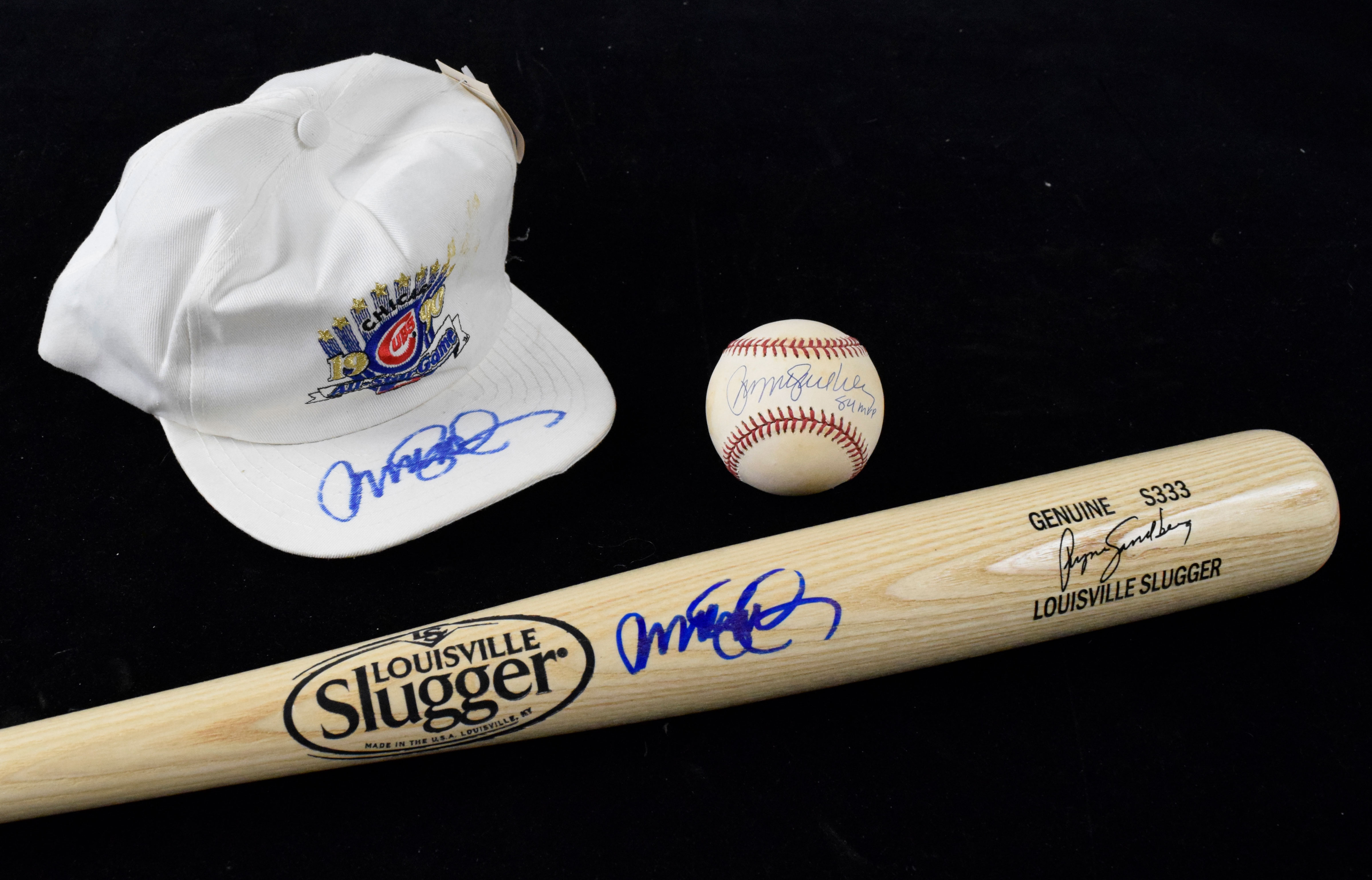 Description:Ryne Sandberg signed baseball, signed bat, and signed 1990 All-Star Game hat (VG/EX-NM). Includes L.Coleman NL ball (toning) signed by Sandberg with "84 MVP" inscription, 1990 All-Star Game hat signed by Sandberg (small stains), and 34" Louisville Slugger S333 Ryne Sandberg model bat signed by Sandberg. Signatures rate 8 to 9 out of 10: VG/EX-NM