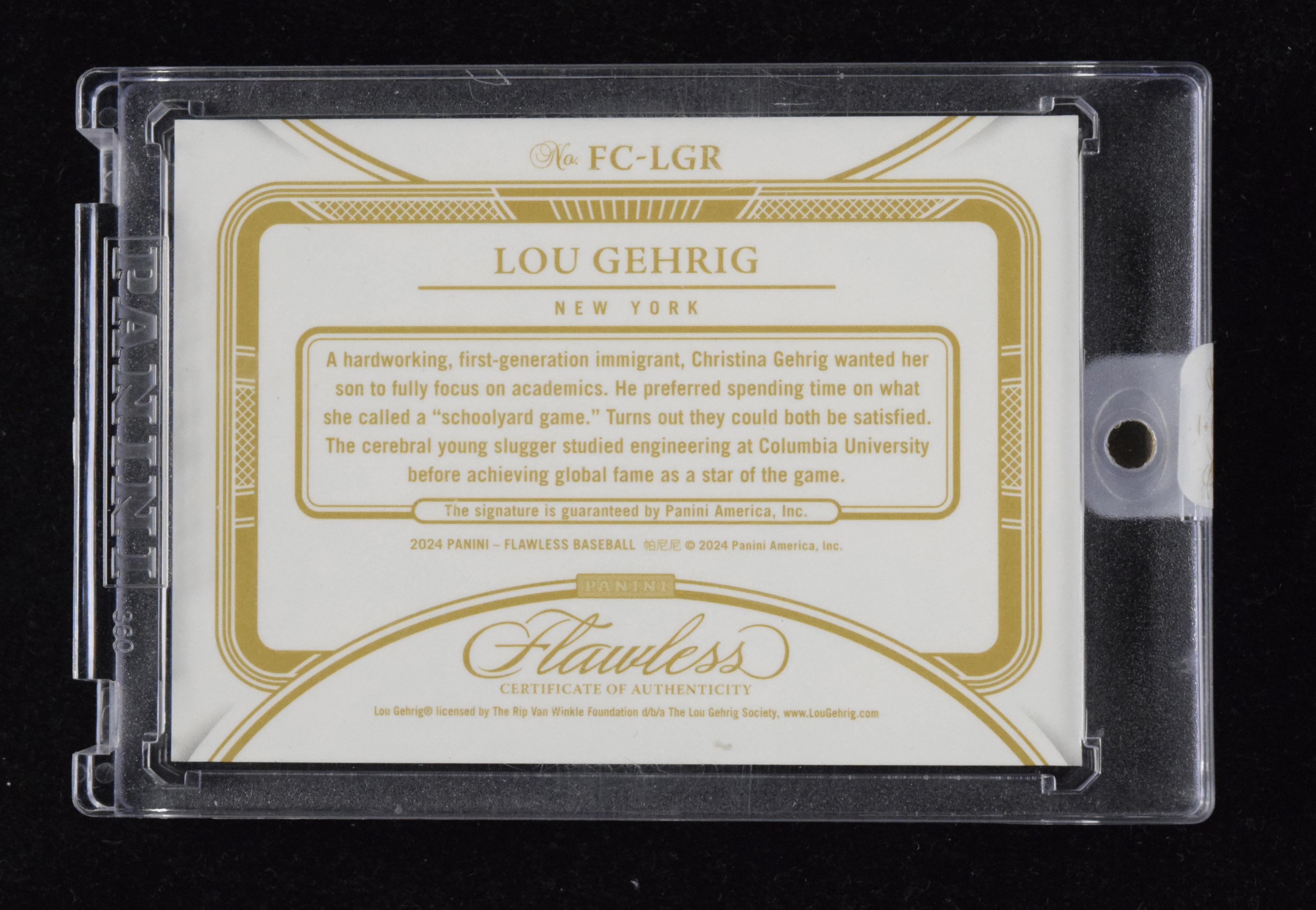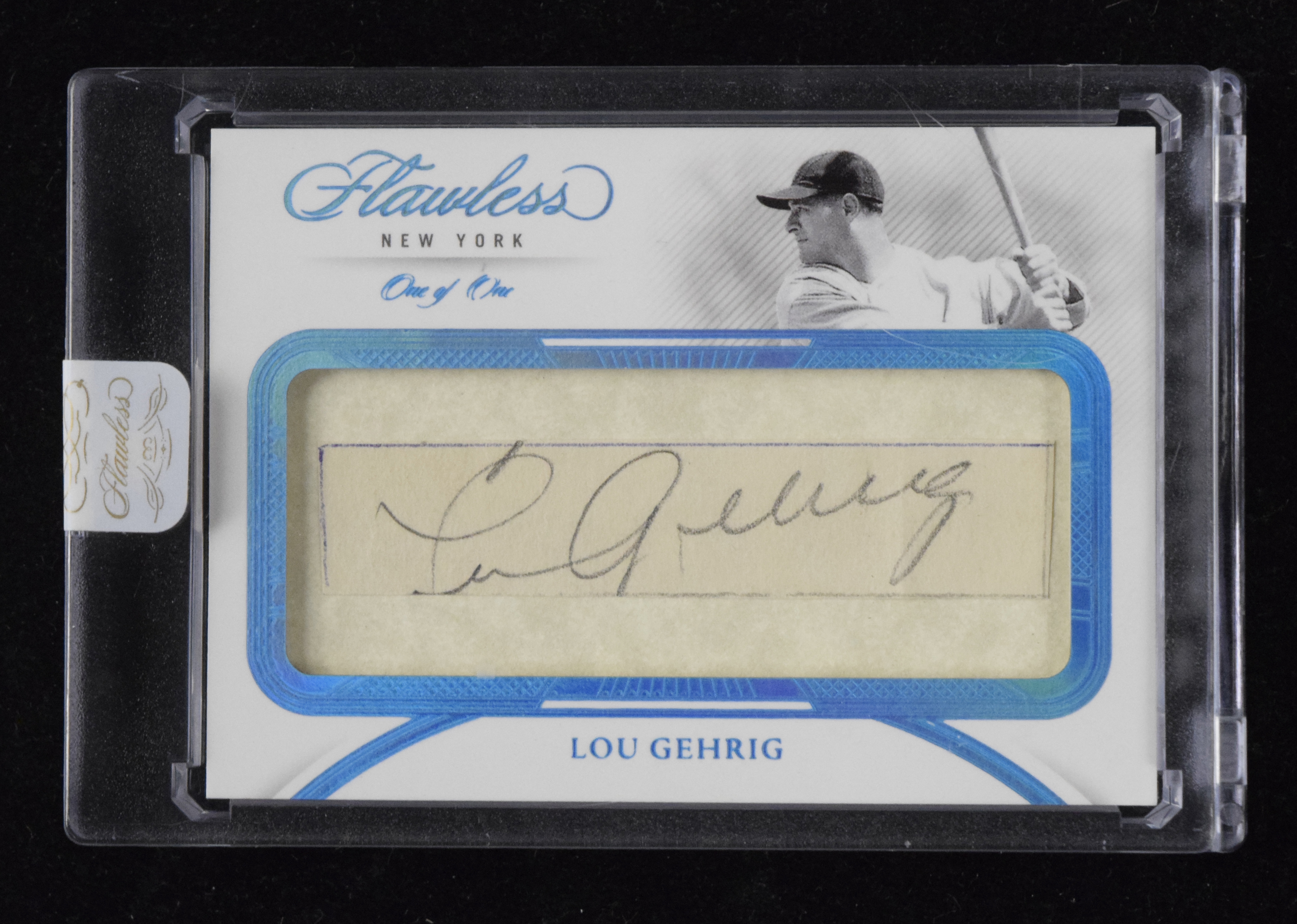 Description:Rare 2024 Panini Flawless Lou Gehrig (1/1) cut signature card (Sig. NM; Card: EX/MT-NM). Ultra-rare pull from 2024 Panini Flawless combines the modern aesthetic of a premium brand with the rarity of a vintage signature from one of the game's all-time greats, Lou Gehrig. Roughly 1/4" thick card #FC-LGR is encased in its original Panini acrylic holder with factory seal intact. Well-executed signature in pencil rates 7/8 out of 10, with lower part of "L" slightly obscured due to the signature's orientation within the card. Card, numbered "One of One" on the front, is perfectly centered with just the slightest hints of wear to a couple of corners and a tiny area on the top edge. Front and back surfaces are clean: EX/MT-NM. ($10,000-$20,000)