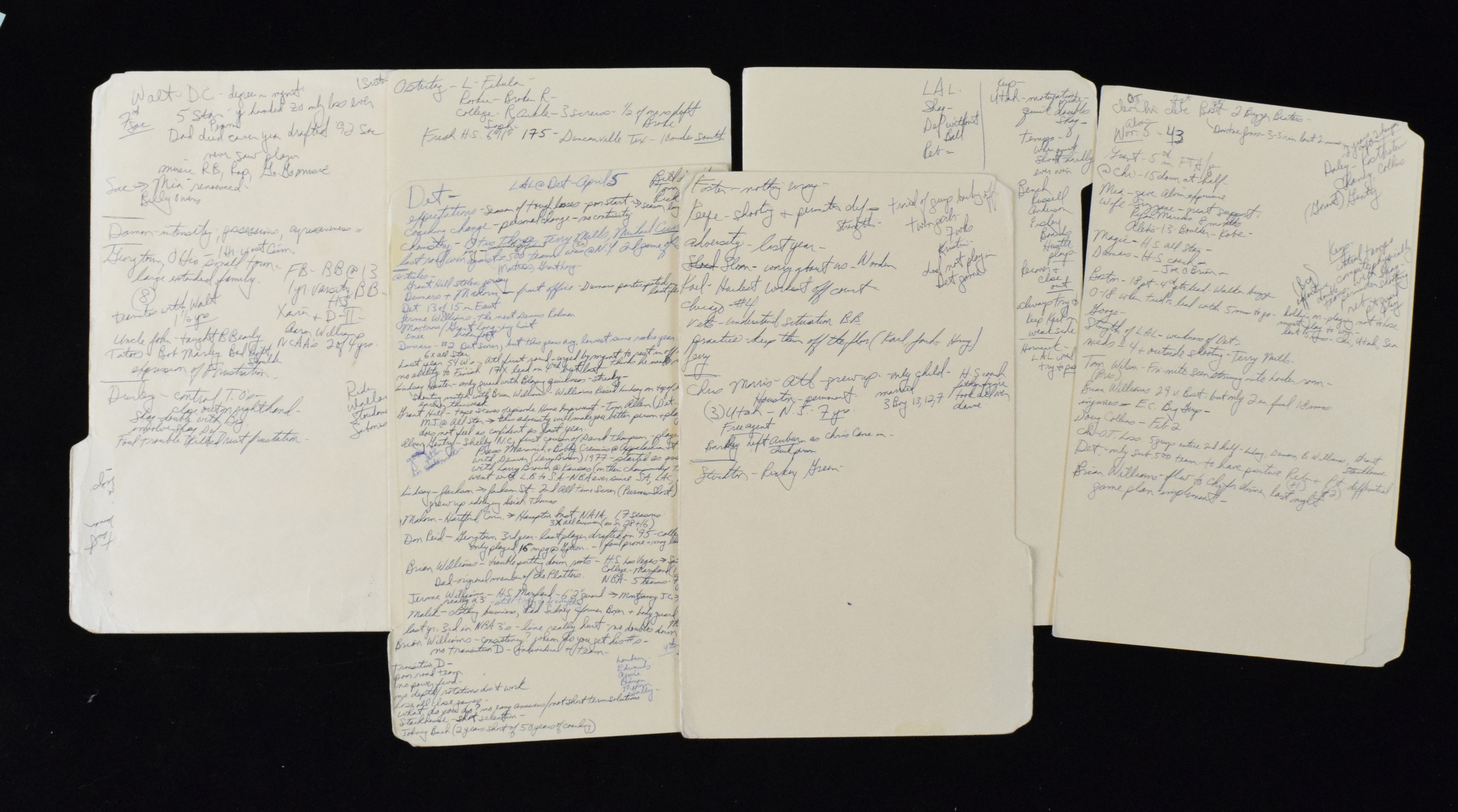 Description:Lot of Bill Walton handwritten NBA game notes (VG-EX/MT). Includes (7) 9.5"x14.5" folders/pages with Walton's broadcasting notes from various games. Walton mentions Michael Jordan and the triple post offense, Jerry West, Kobe Bryant, Shaquille O'Neal, Grant Hill, Joe Dumars, John Stockton, Gary Payton, Karl Malone, Jerry Sloan, and others. Includes certificate of provenance from Walton Family: VG-EX/MT
