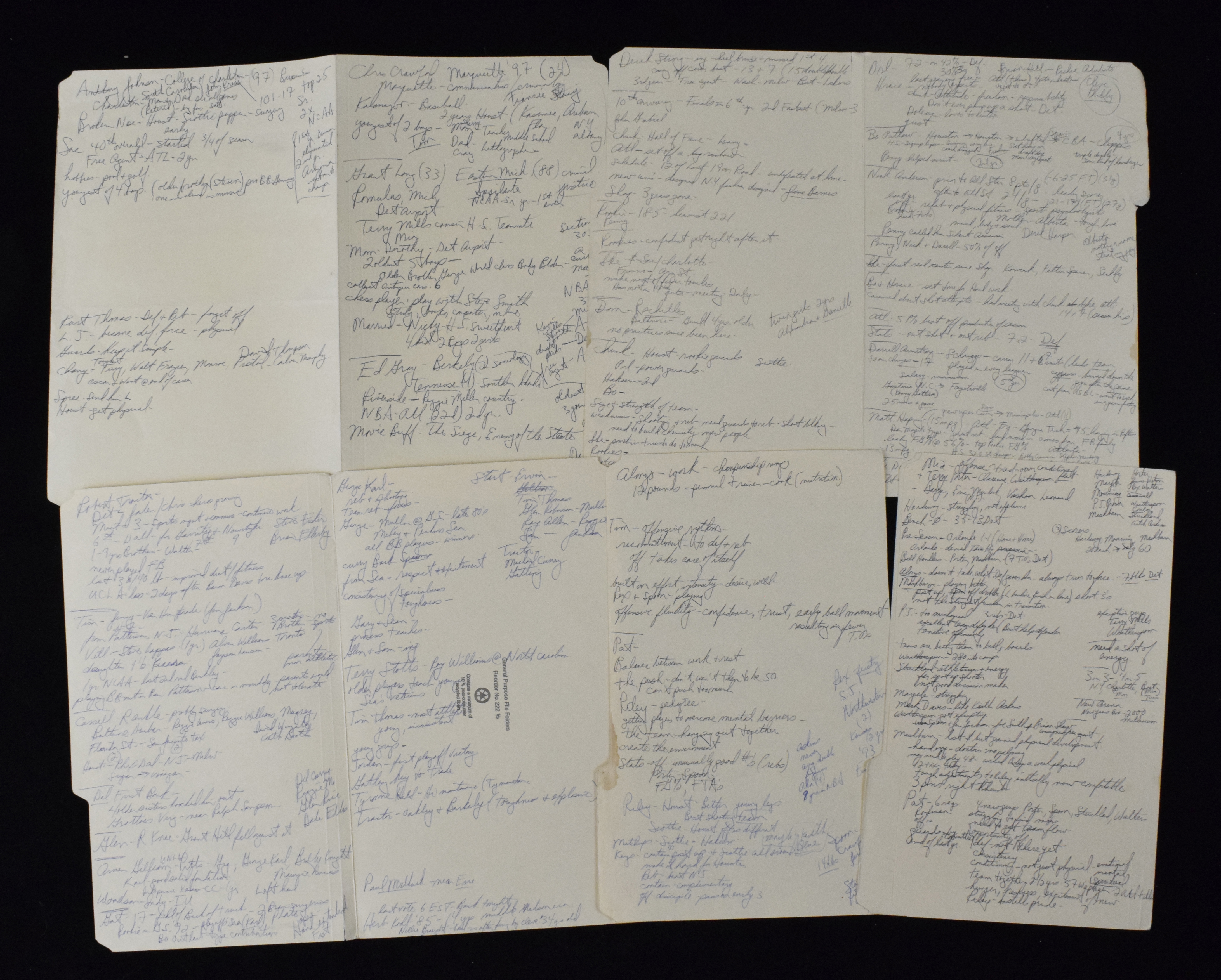 Description:Lot of Bill Walton handwritten NBA game notes (VG-EX/MT). Includes (9) 9.5"x14.5" folders/pages with Walton's broadcasting notes from various games. Walton mentions Allen Iverson, Larry Brown, Pat Riley, Alonzo Mourning, Hakeem Olajuwon, Rudy Tomjanovich, Scottie Pippen, Tim Duncan, Gary Payton, Shaquille O'Neal, Karl Malone, Tim Hardaway, George Karl, Ray Allen, and others. Includes certificate of provenance from Walton Family: VG-EX/MT