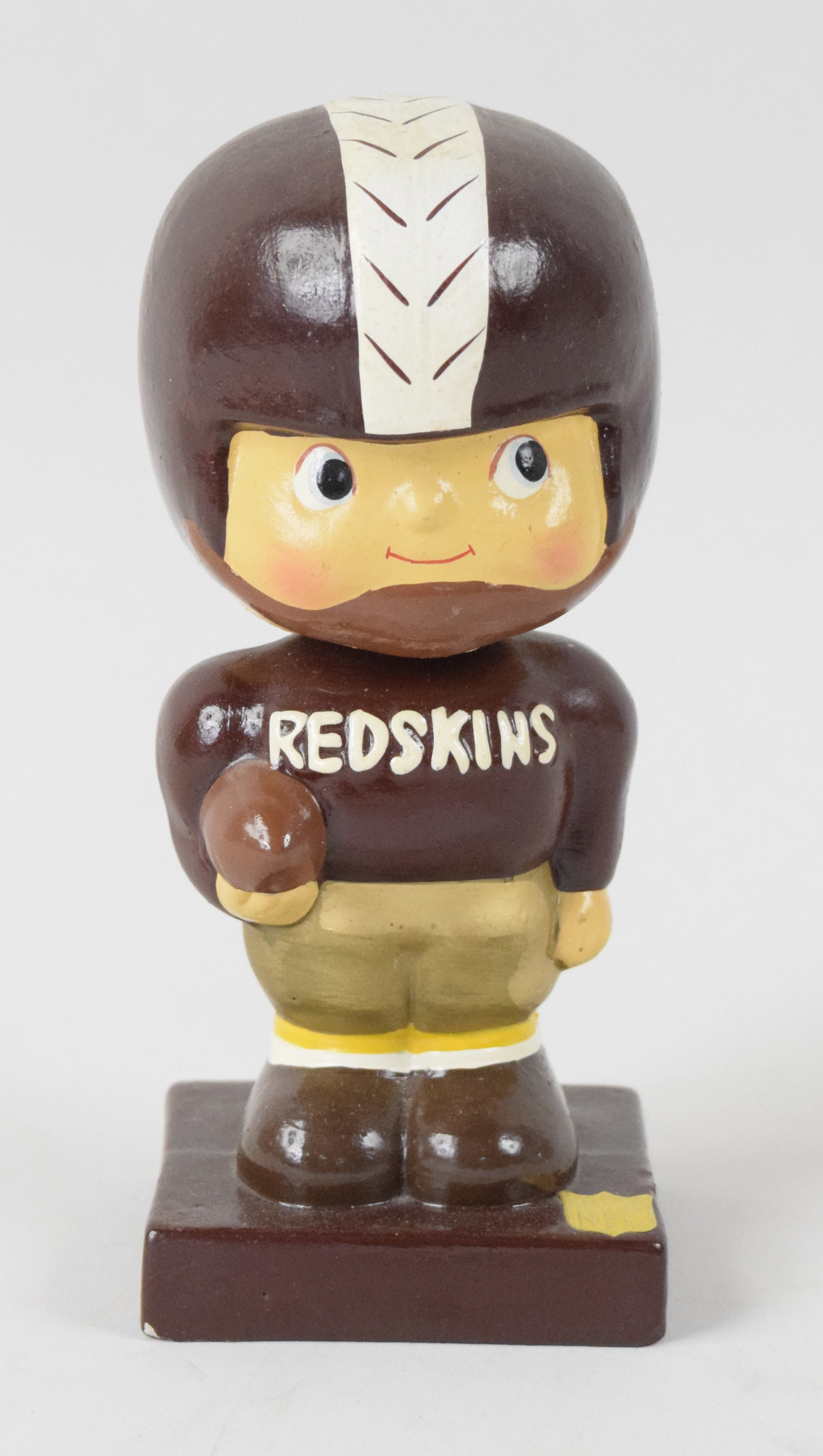 Description:Washington Redskins vintage nodder, c.1960-63 (EX/MT). Square wood base Redskins nodder with NFL decal variation. Only very minor wear, with some possible paint touch-ups: EX/MT