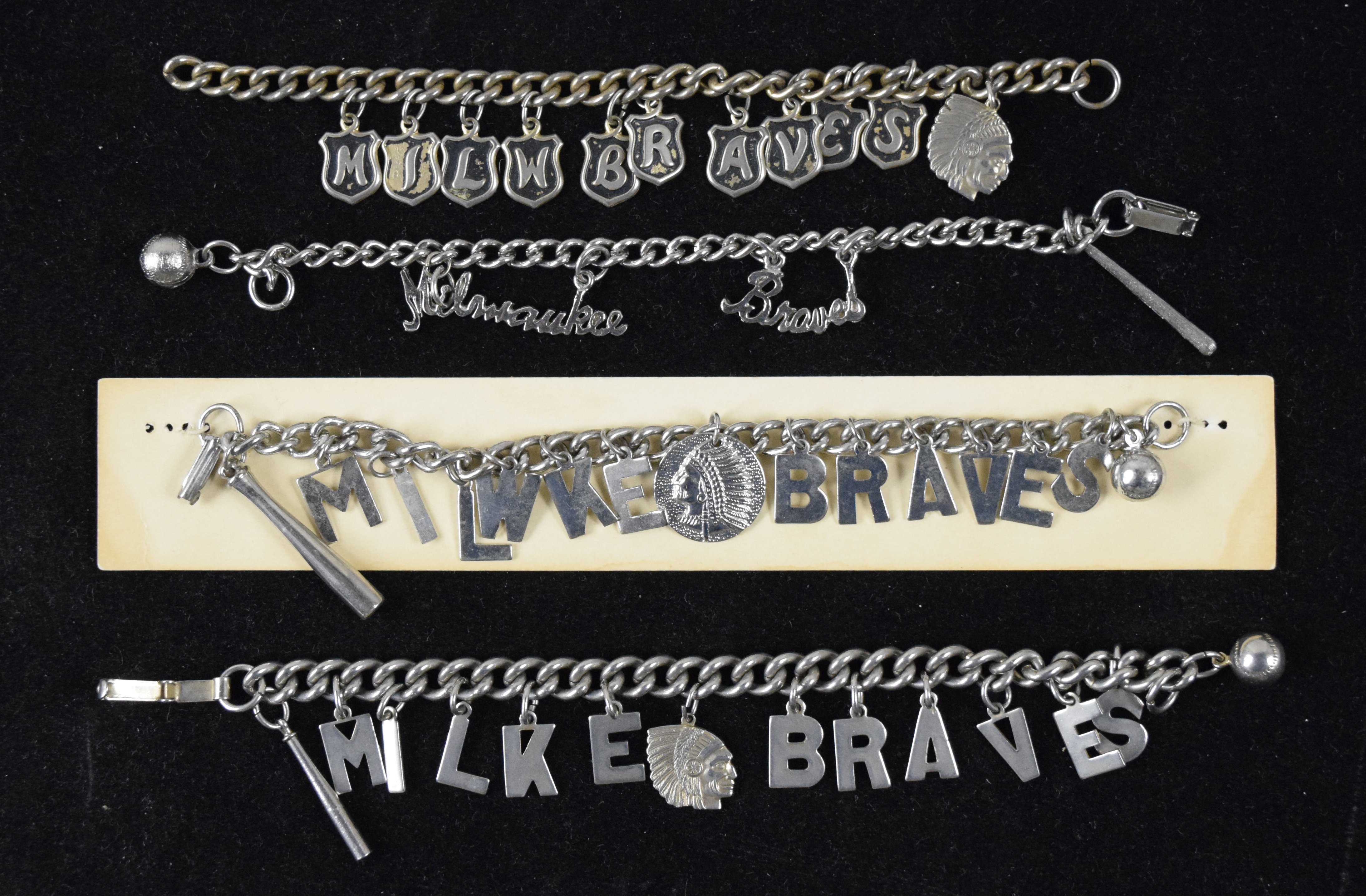 Description:Lot of (6) vintage Milwaukee Braves charm bracelets, c.1950s-60s (EX-NM). One shows some where, but most appear only lightly worn (if at all), including one still attached to its backing: EX-NM