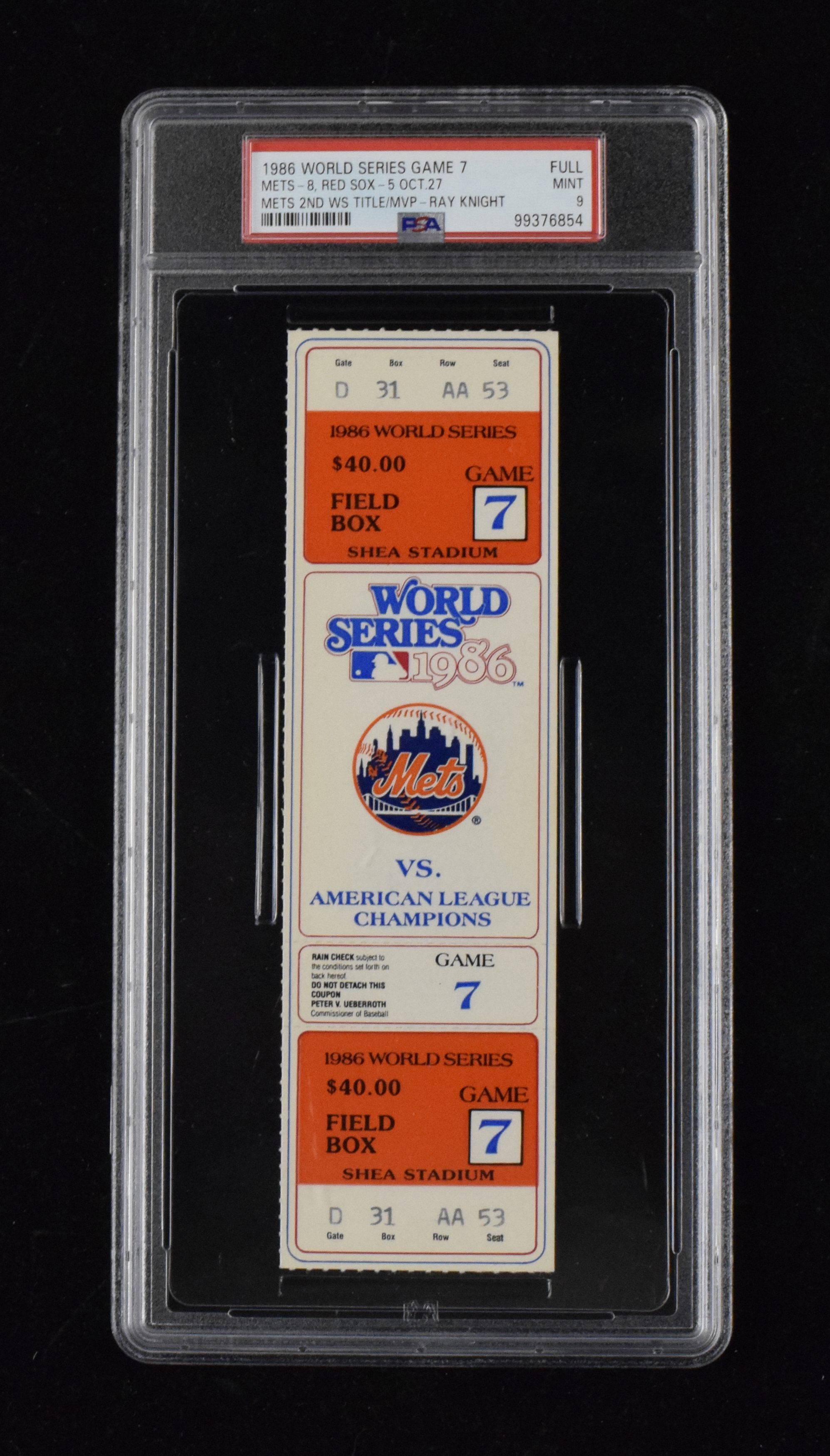 Description:1986 World Series Game 7 full ticket - New York Mets win WS (PSA 9 MT - Pop 5 with none graded higher). Highly desirable full unused Shea Stadium ticket issued for the clinching game played at Shea Stadium. Little to no mentionable wear: PSA 9 MINT ($1,500-$3,000)