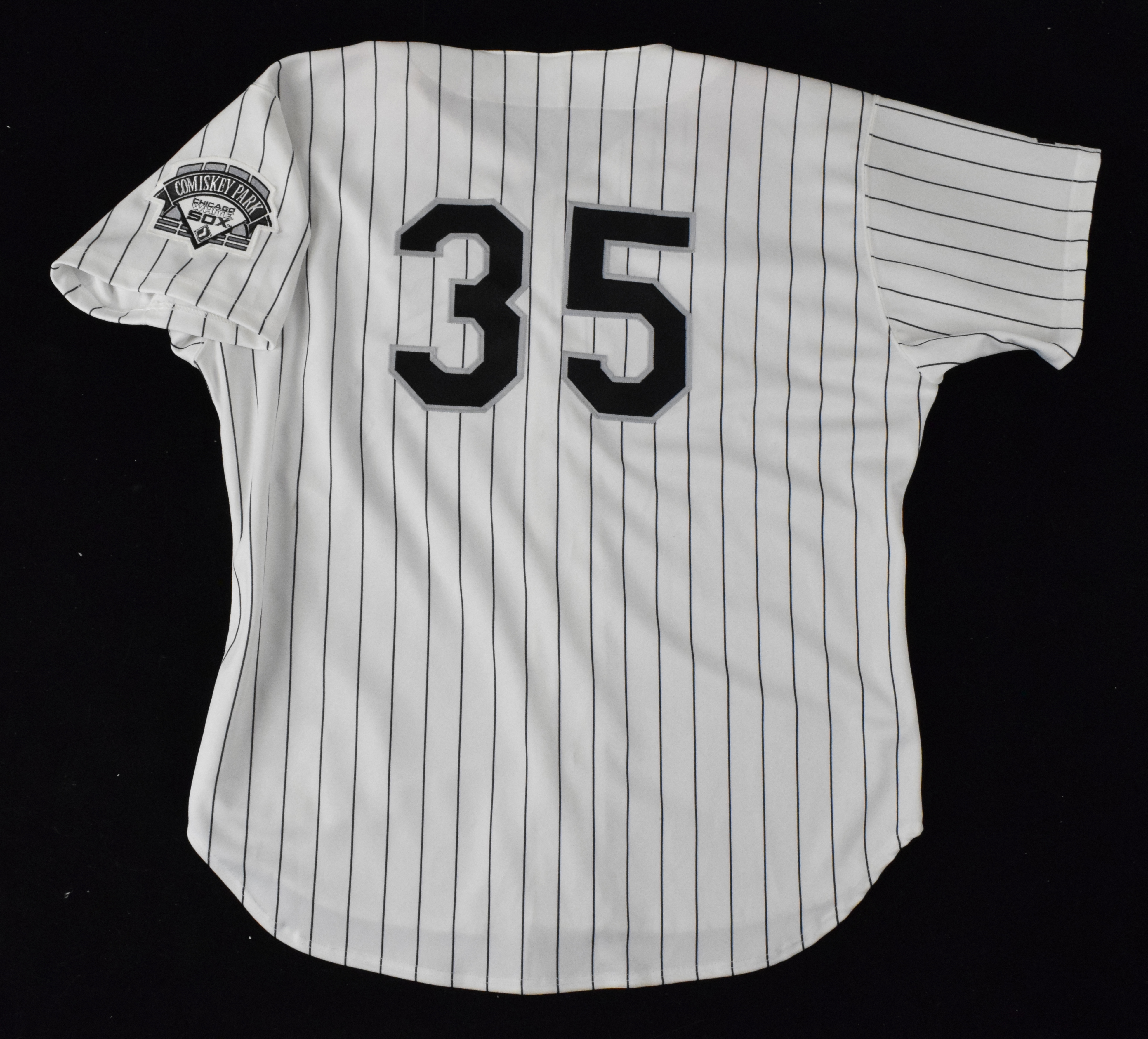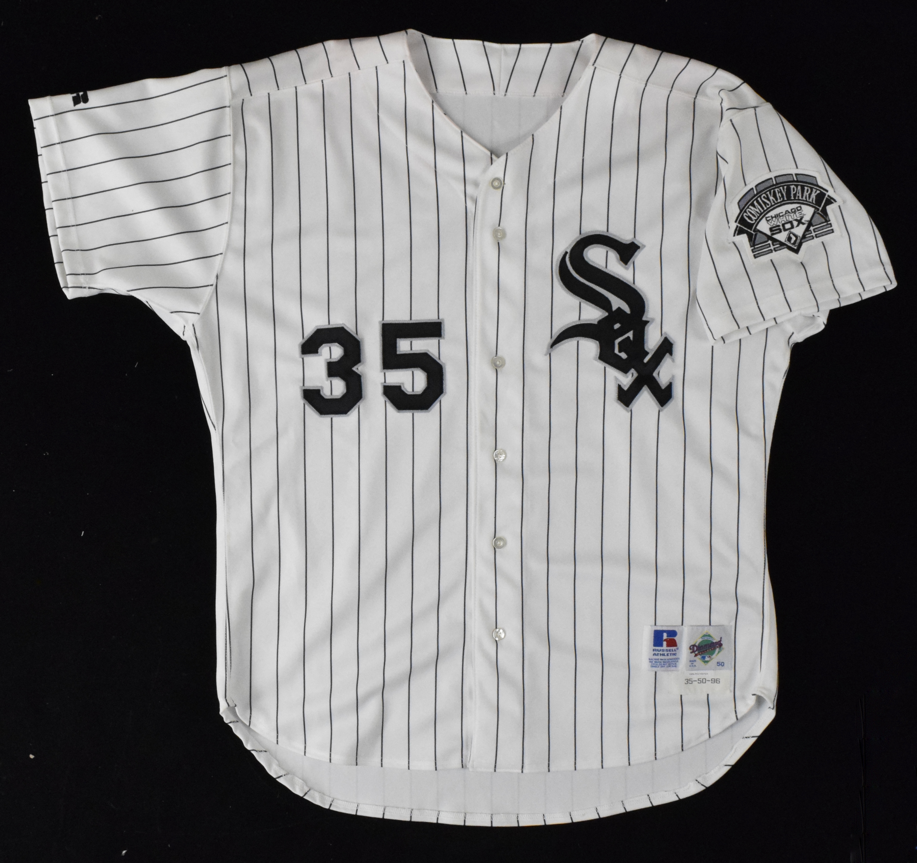 Description:1996 Frank Thomas professional model Chicago White Sox jersey (EX). Russell Athletic MLB Authentic Collection size 50 white home jersey with "SOX" logo and #35 sewn on the front, Comiskey Park patch sewn on the left sleeve, and #35 sewn on the back. "35-50-96" strip tag is sewn below the Russel Athletic tagging on the front tail which has "100% Polyester" flag tag attached. Staining around the collar/shoulder area mainly of a pinkish color: EX ($1,500-$3,000)