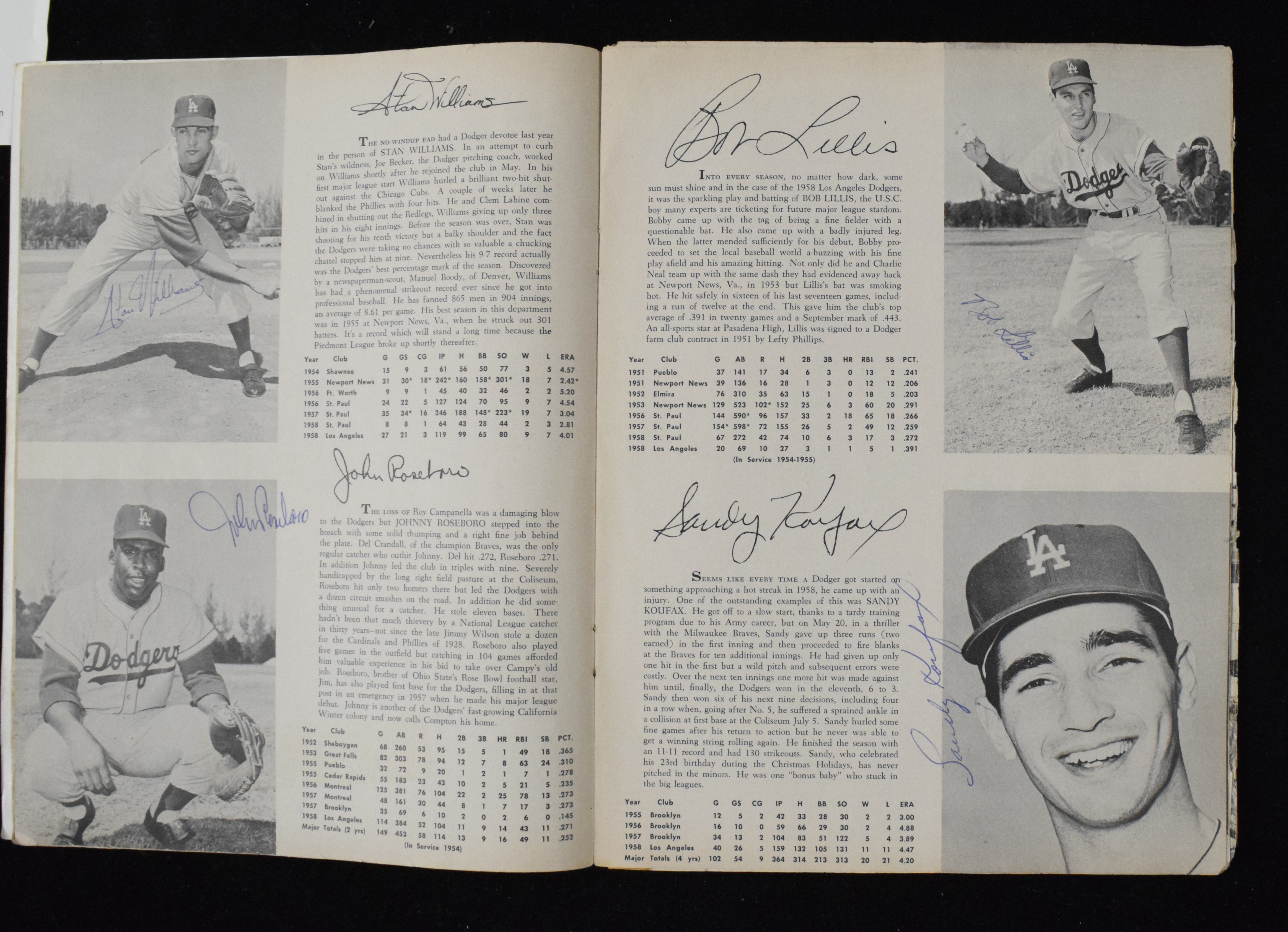 Description:1959 World Series champion Los Angeles Dodgers team signed yearbook with (34) autos including Scully & HOFers - JSA (VG). Signed throughout the interior by Vin Scully, Walt Alston, Duke Snider, Don Drysdale, Gil Hodges (signed twice), Sandy Koufax, Walter O'Malley, Buzzie Bavasi, Frank Howard, Don Zimmer, Jim Gilliam, Tommy Davis, Clem Labine, Johnny Podres, Wally Moon, Charlie Neal, John Roseboro, Joe Pignatano, Norm Larker, Roger Craig, Don Demeter, Danny McDevitt, Norm Sherry, Larry Sherry, Frank Finch, and others. Signatures rate 6/7 to 10 (avg 8/9) out of 10. Includes full LOA from JSA. The interior has some loose pages, with some vintage tape strips at those edges: VG ($750-$1,500)