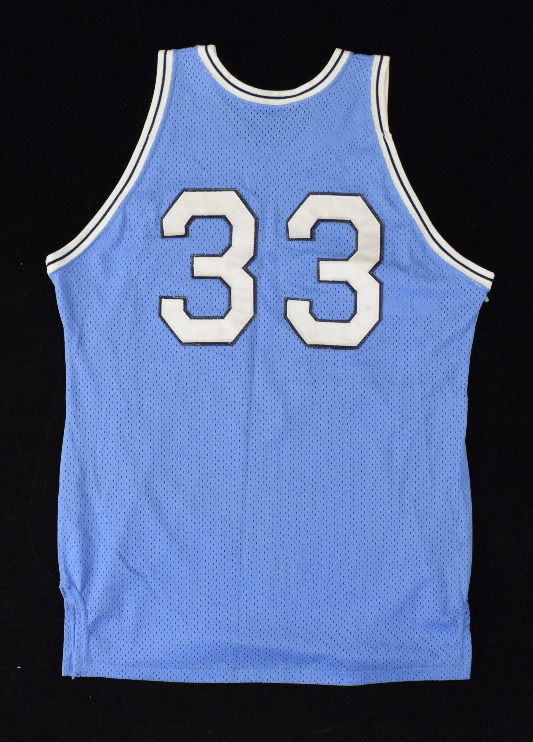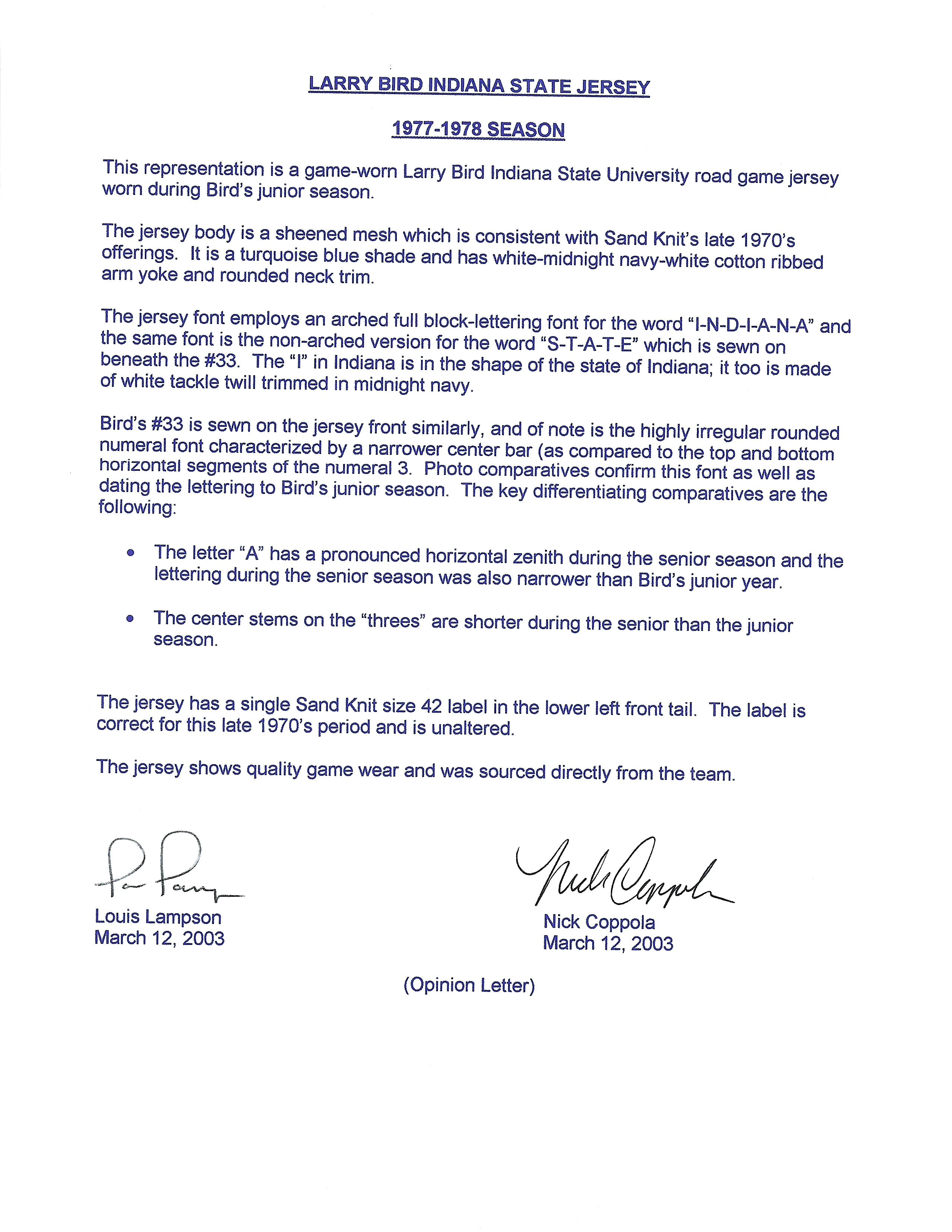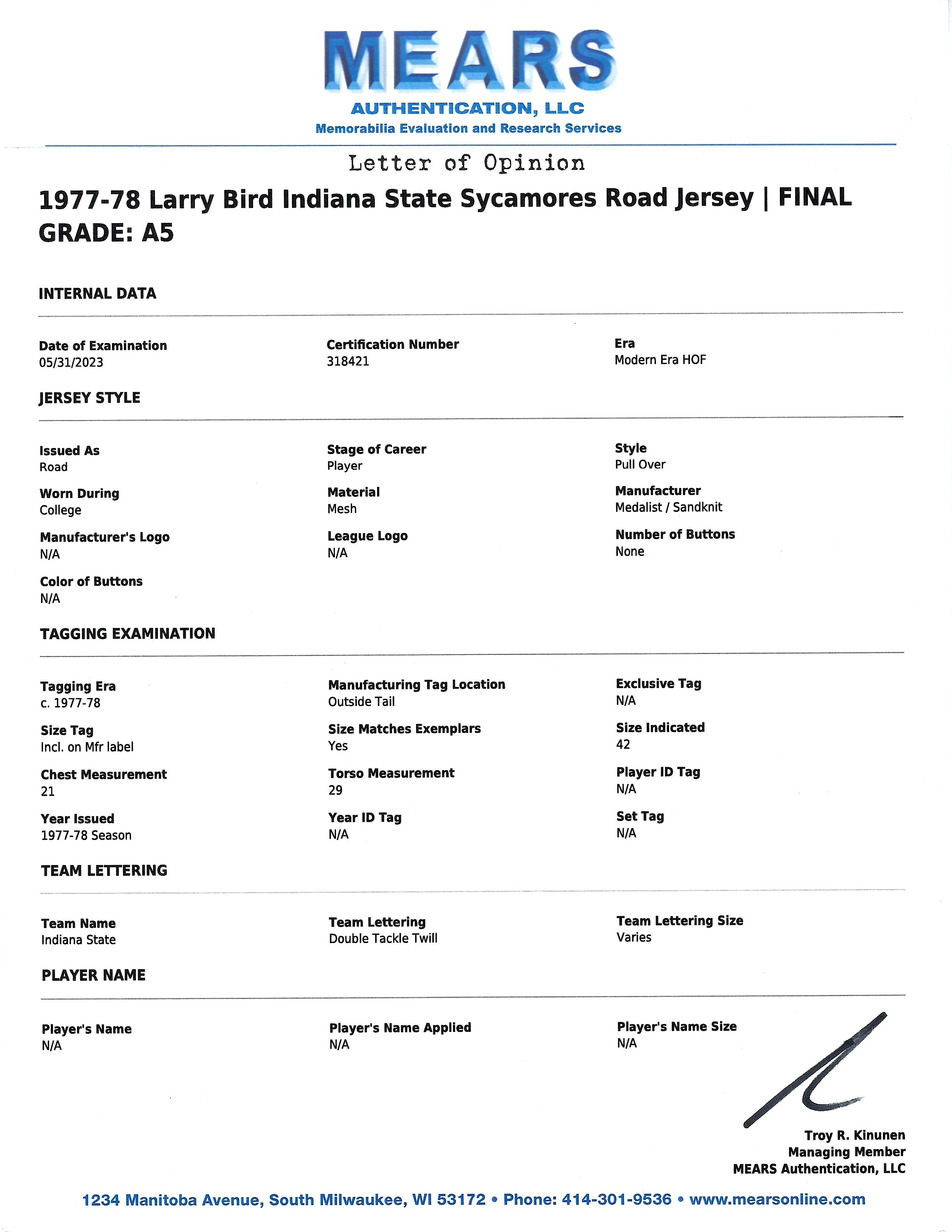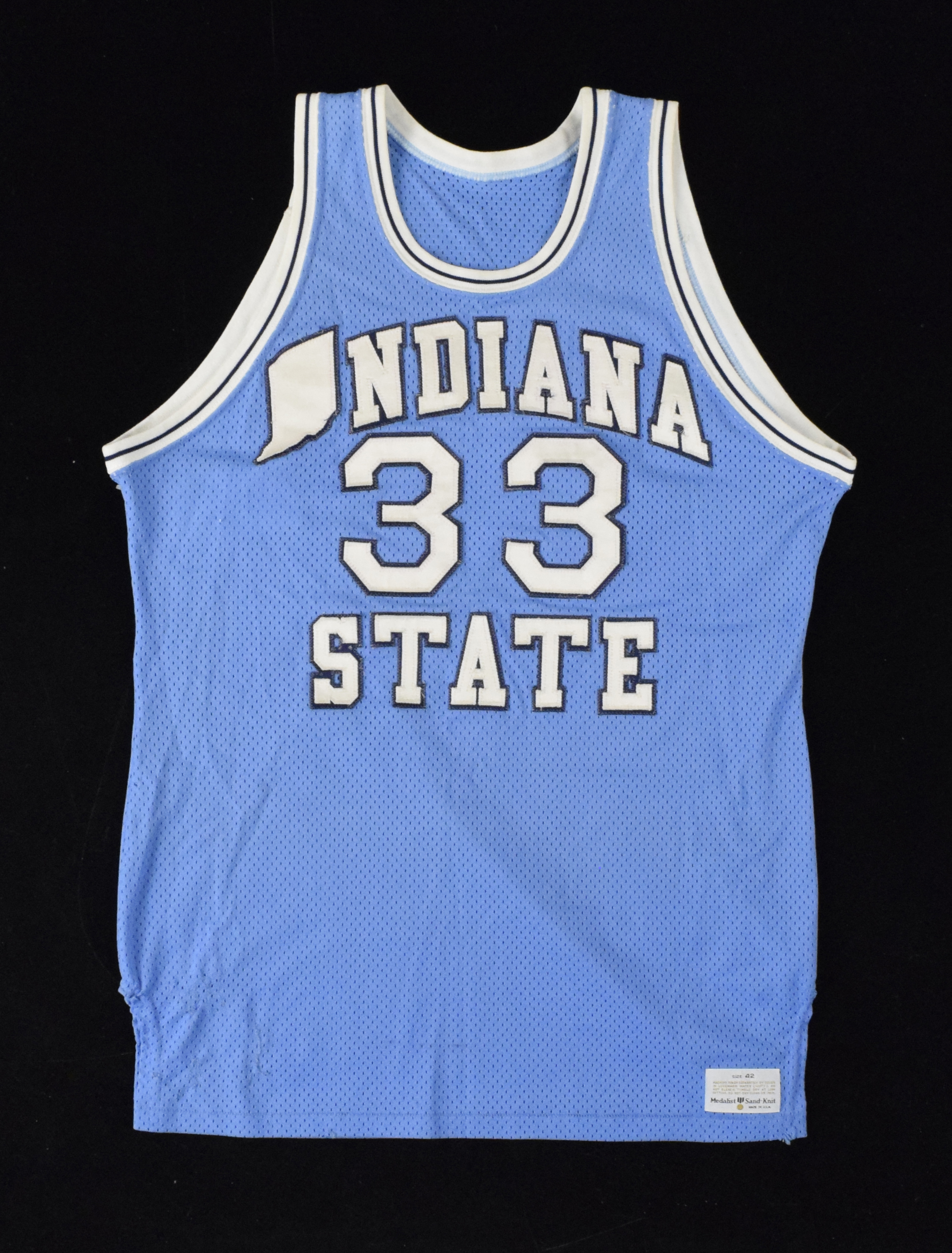 Description:1977-78 Larry Bird junior year Indiana State Sycamores jersey - MEARS (EX multiple team repairs). Medalist Sand-Knit size 42 Indiana State #33 Larry Bird road jersey with 1977-78 tagging along with fonts matching his junior season. Includes LOA from MEARS (serial #318421) with a grade of A5 and notes the size match to other examples, moderate use (appears more than moderate), and team repairs (multiple are visible on both the front and back): MEARS A5 ($1,000-$2,000)