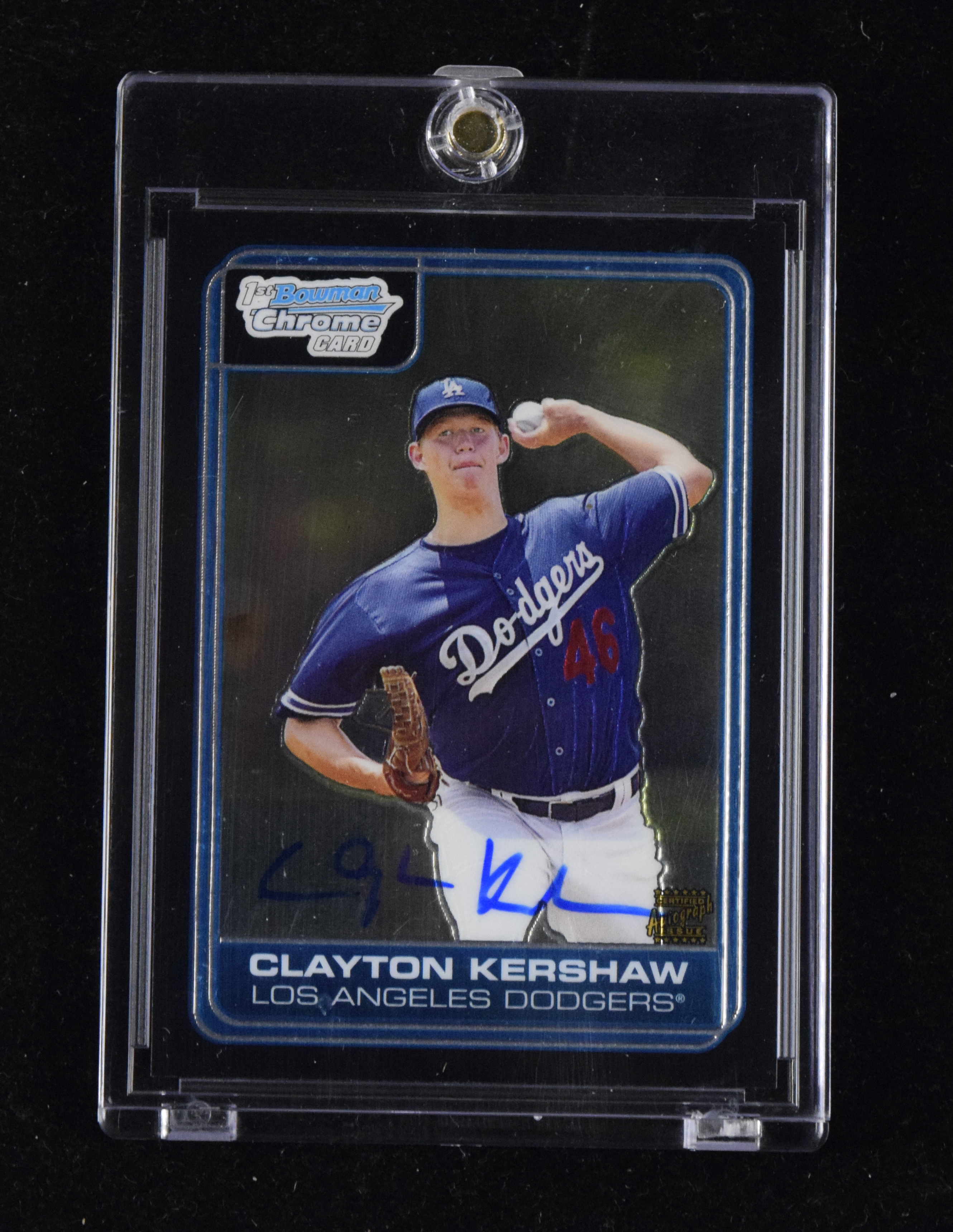Description:Clayton Kershaw signed 2006 Bowman Draft Picks & Prospects rookie insert card (NM/MT). 2006 Bowman Draft Picks & Prospects "Chrome Draft Picks" #DP84 signed by Kershaw in blue marker. Signature rates 9 out of 10. Topps serial #ed hologram sticker is on the back of the card: NM/MT ($500-$750)