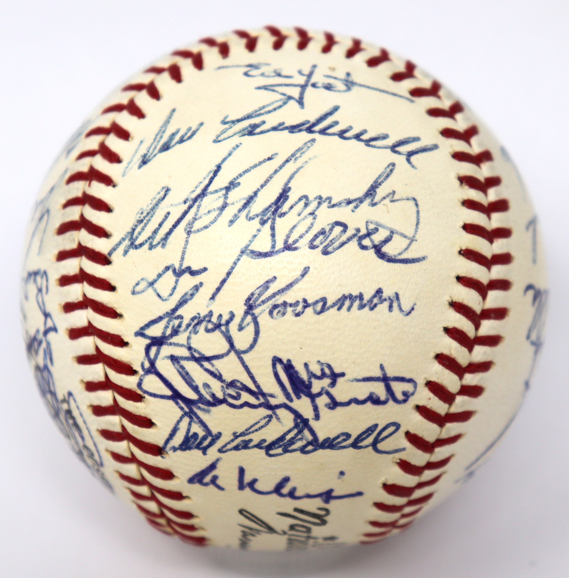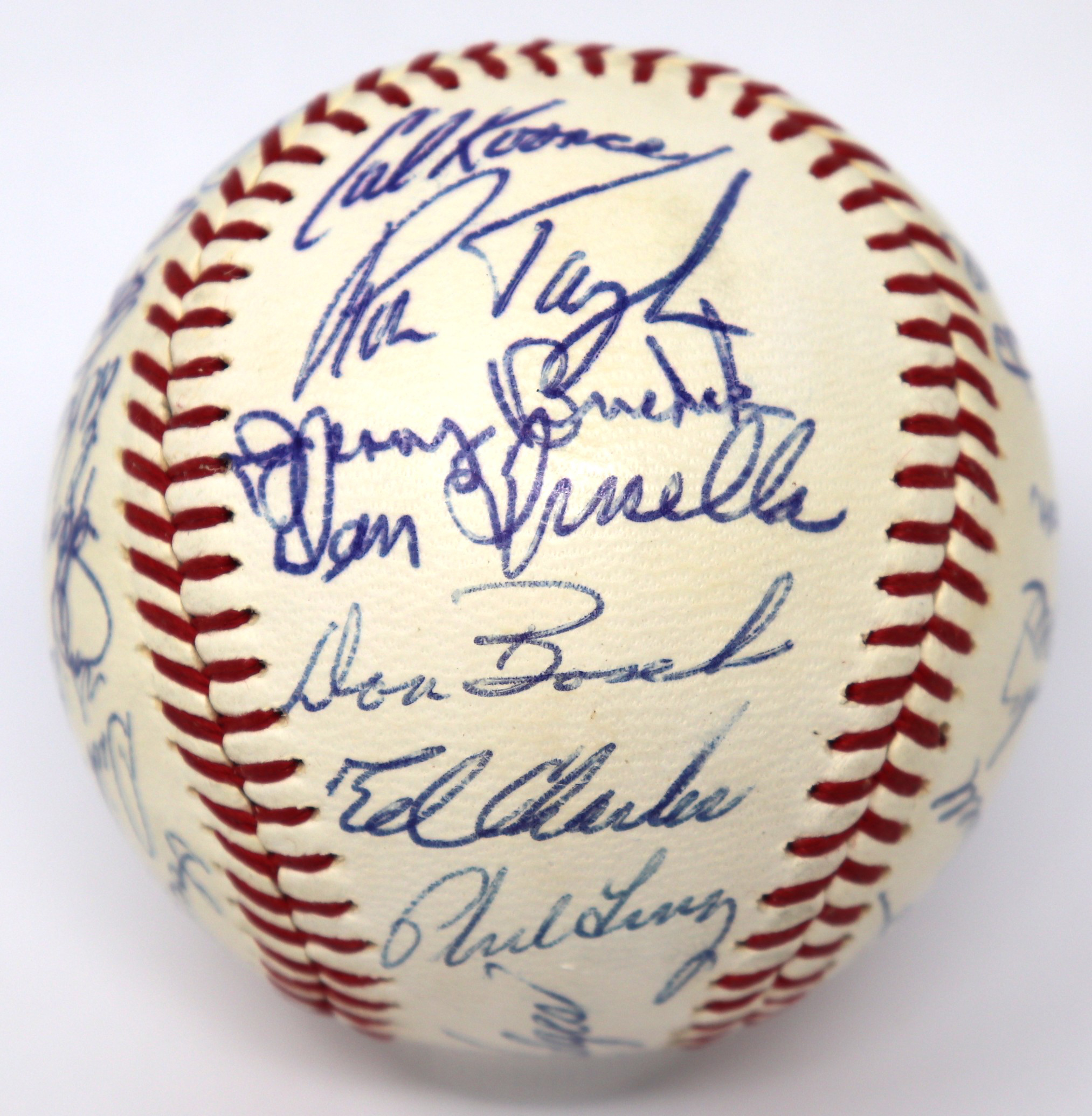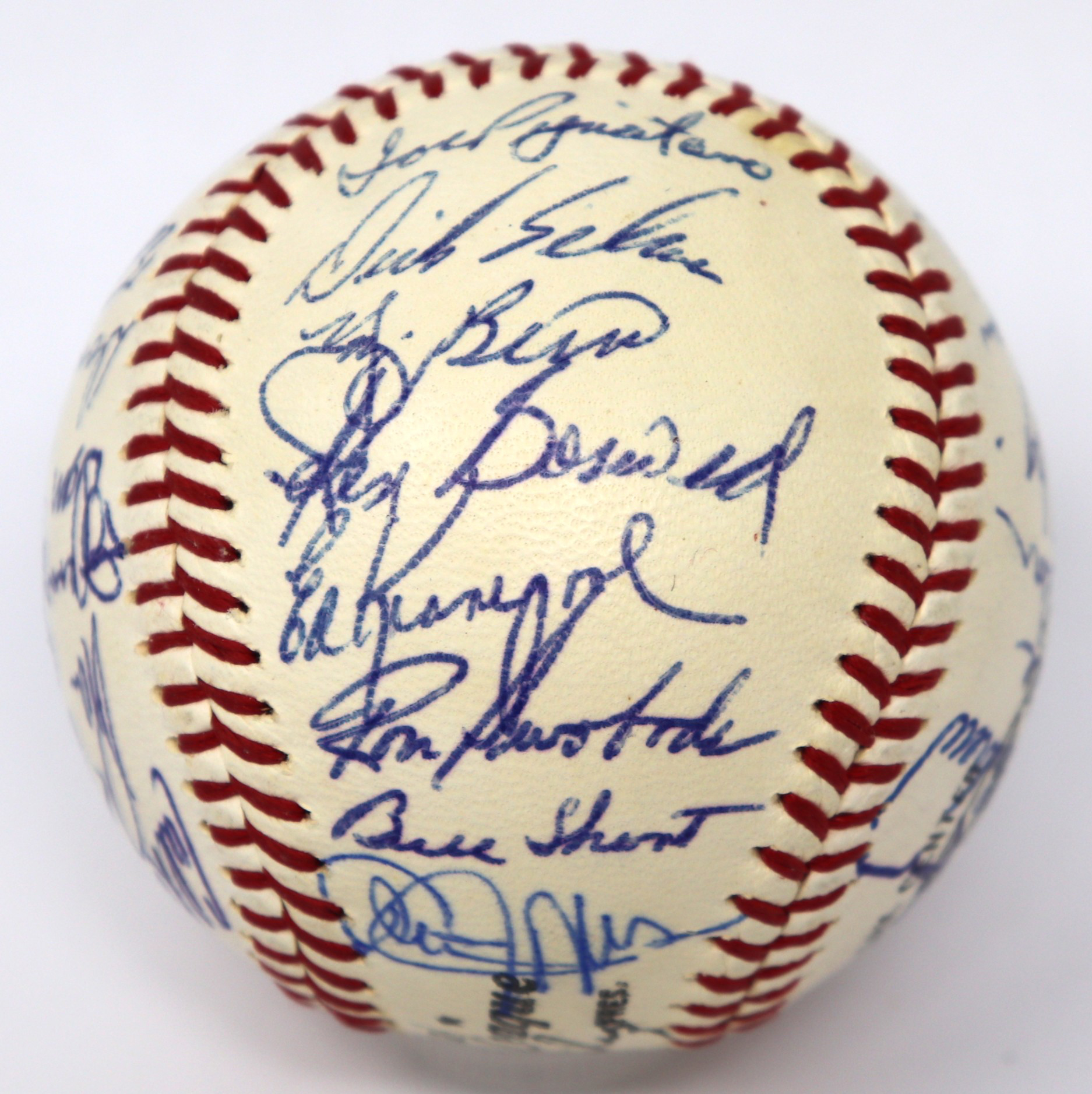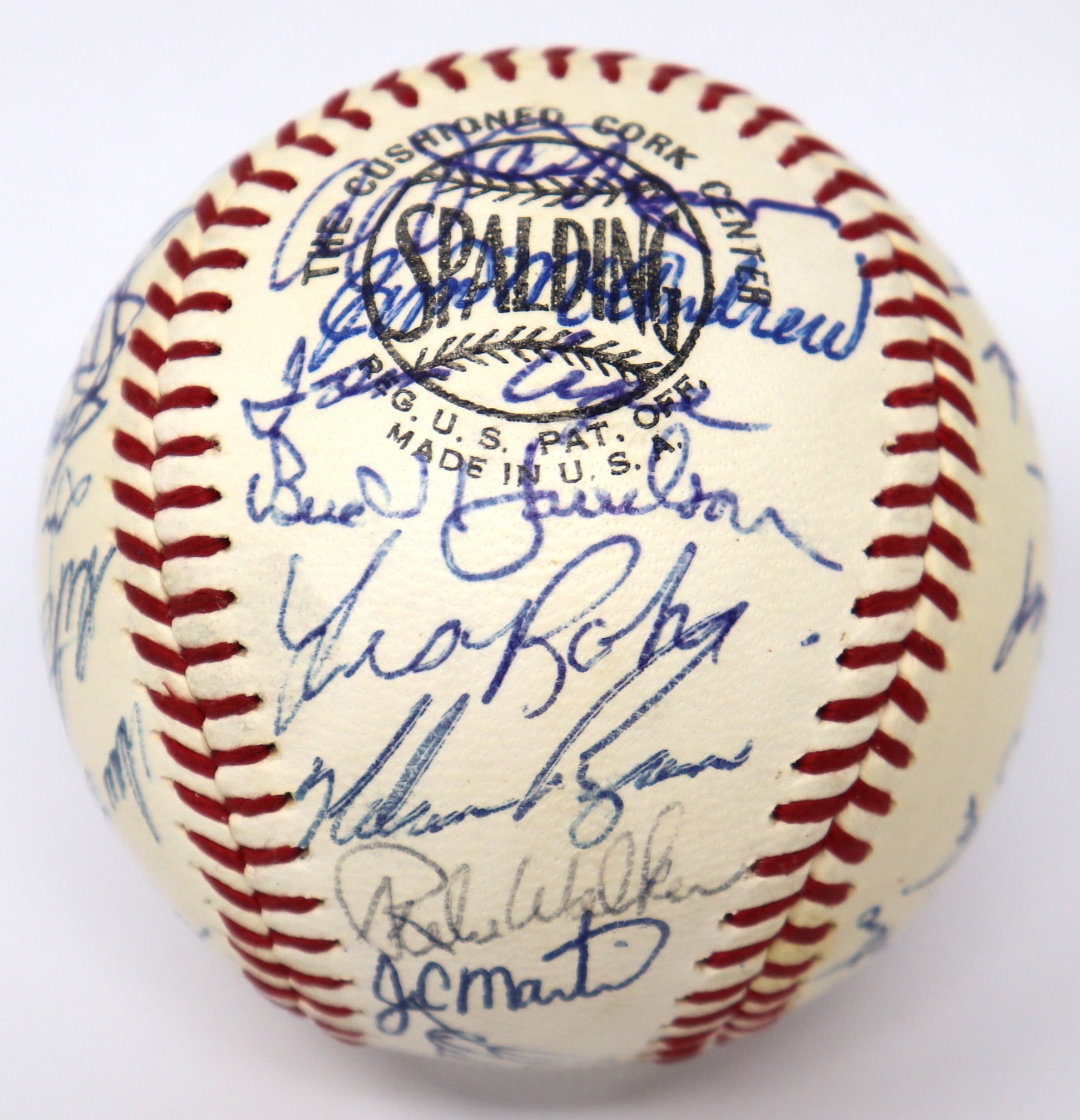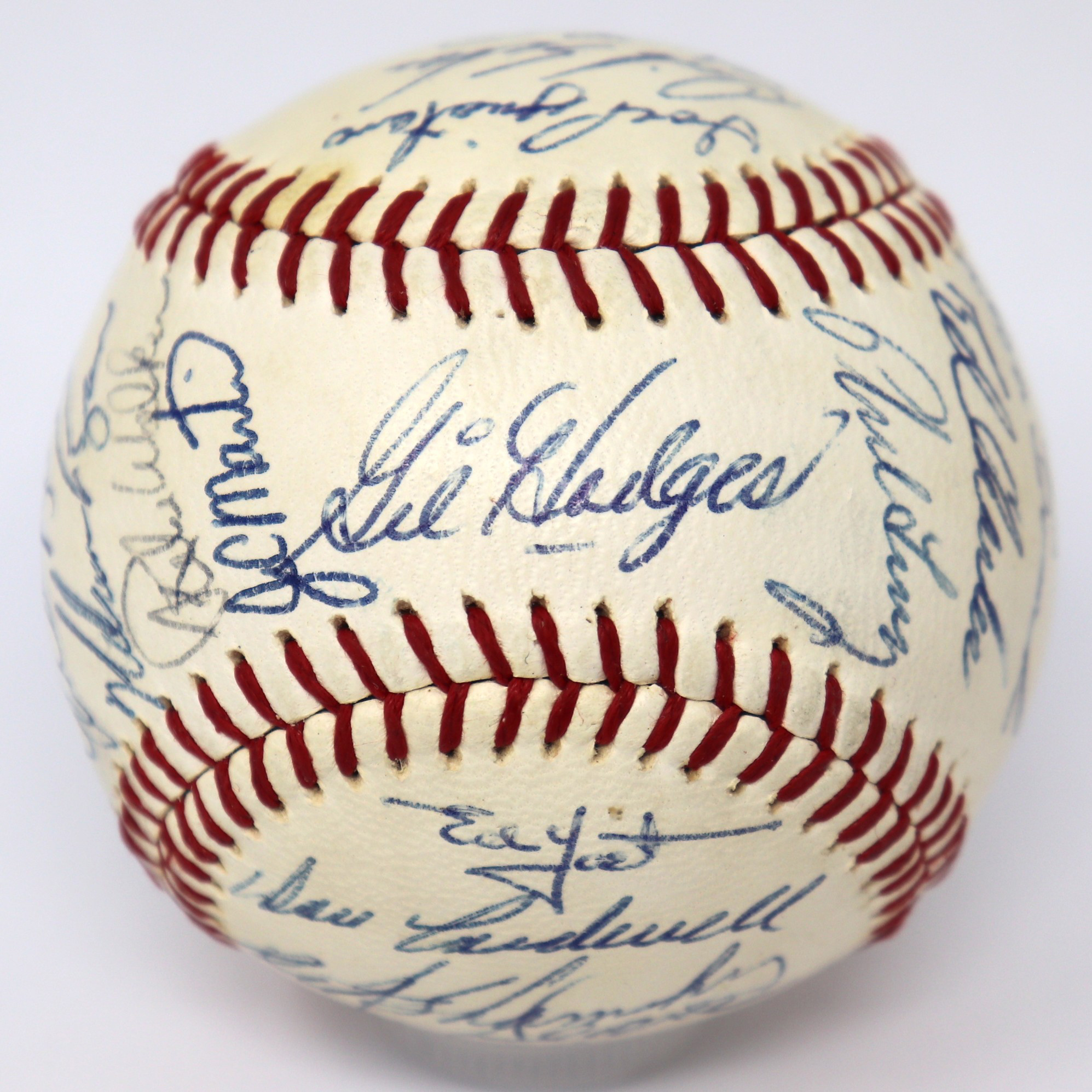 Description:High grade 1968 New York Mets team signed baseball (NM). W.Giles NL ball signed by (32) members of the 1968 Mets including Gil Hodges, Yogi Berra, Tom Seaver, Nolan Ryan, Jerry Koosman, Ed Charles, Cleon Jones (signed twice), Ron Swoboda, Jerry Grote, Cal Koonce, Ken Boswell, Dick Selma, Jim McAndrew, Art Shamsky, Tom Agee, Ed Kranepool, Bud Harrelson, Al Weis, and others. Signatures rate 7 to 9/10 (avg 8/9) out of 10: NM ($500-$750)