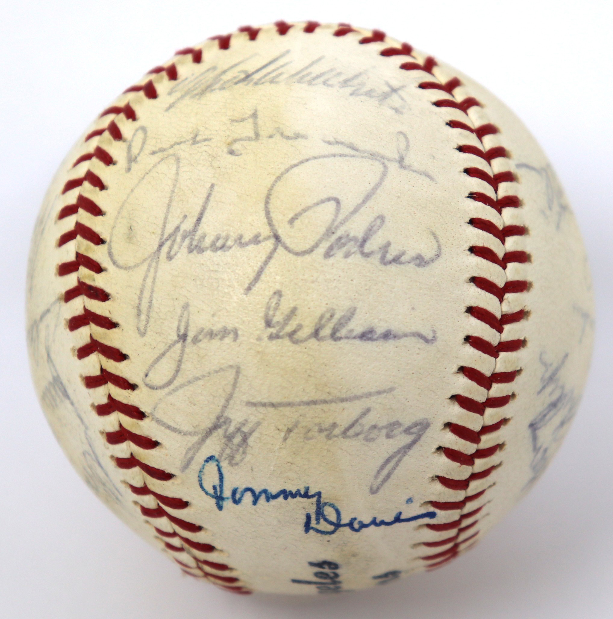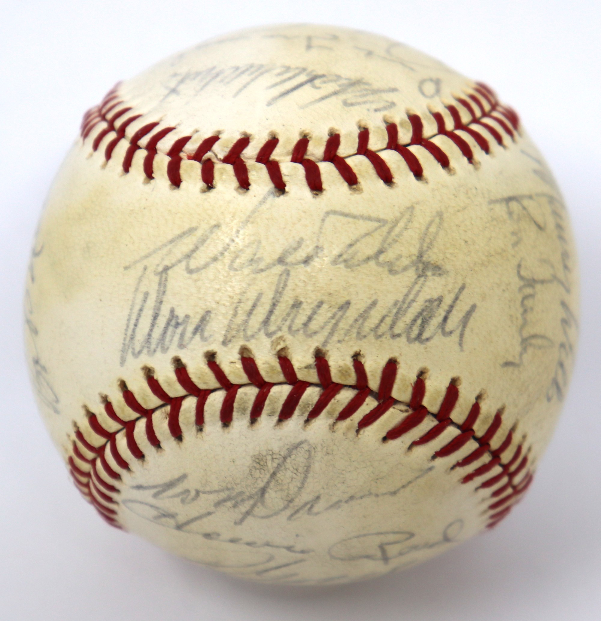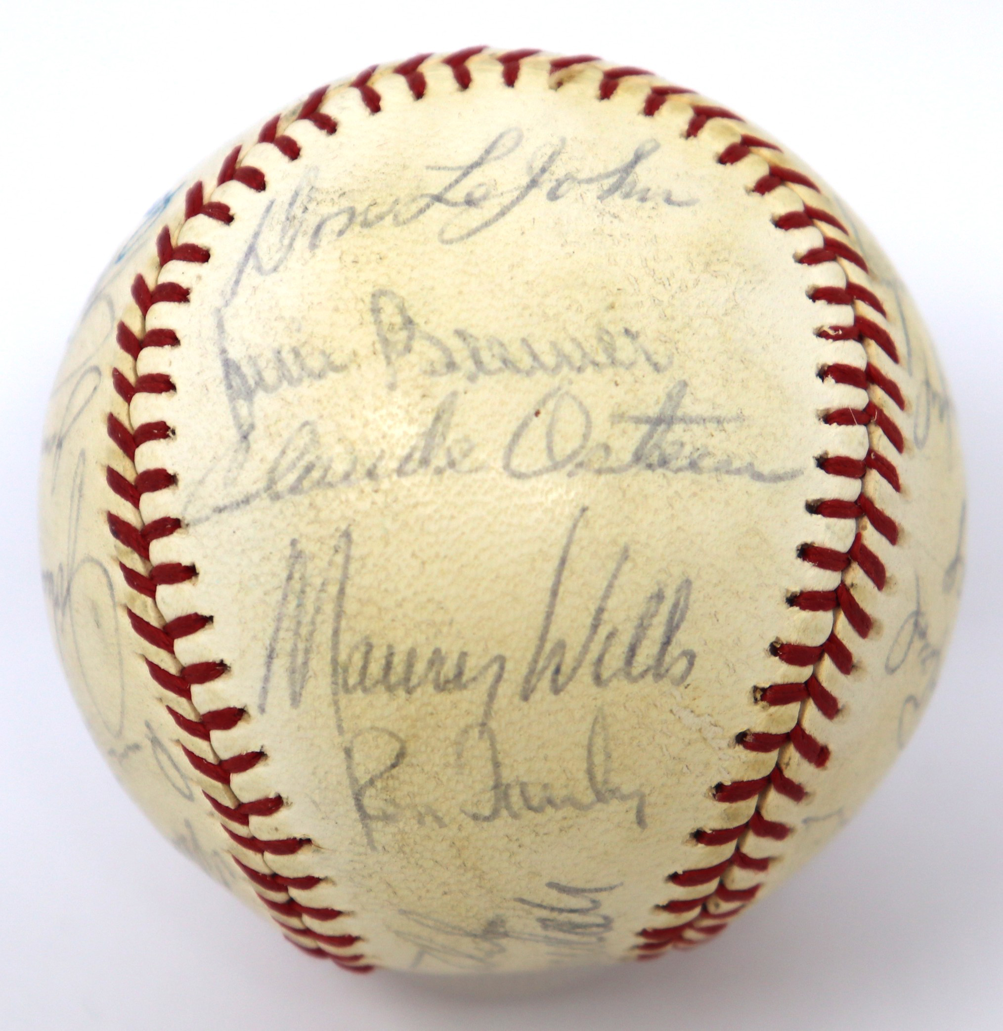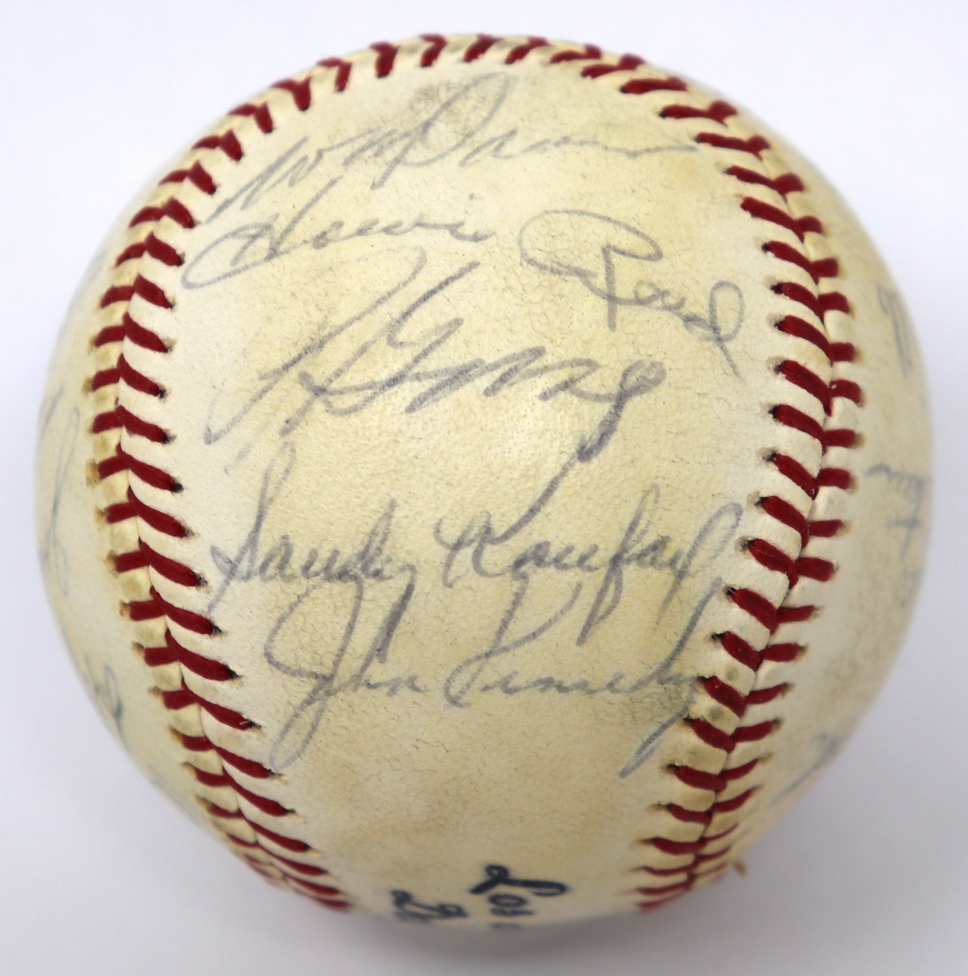 Description:1965 World Series champion Los Angeles Dodgers team signed baseball (EX). "Los Angeles Dodgers" ball signed by (23) members of the 1965 Dodgers including Walt Alston, Don Drysdale, Sandy Koufax, Maury Wills, Claude Osteen, Ron Fairly, Jim Gilliam, Ron Perranoski, Willie Davis, John Kennedy, Dick Tracewski, Bob Miller, and others. Signatures rate 6/7 to 8/9 out of 10. Areas of light to moderate toning on each panel: EX ($500-$750)