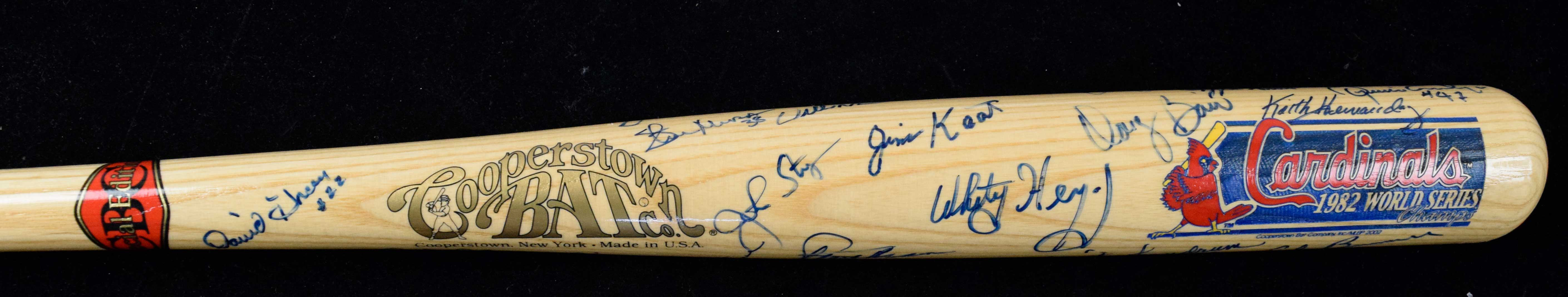 Description:1982 World Series champion St. Louis Cardinals team signed baseball bat (NM). 34" Cooperstown Bat Co. 1982 Cardinals commemorative bat signed by (28) members of the 1982 Cardinals including Whitey Herzog, Red Schoendienst, Bruce Sutter, Ozzie Smith, Jim Kaat, Keith Hernandez, Willie McGee, Lonnie Smith, Joaquin Andujar, Tom Herr, Ken Oberkfell, Bob Forsch, Gene Tenace, Doug Bair, John Stuper, George Hendrick, David Green, Mike Ramsey, Dane Iorg, Tito Landrum, and others. Signatures rate 7 to 9 (avg 9) out of 10: NM ($750-$1,500)