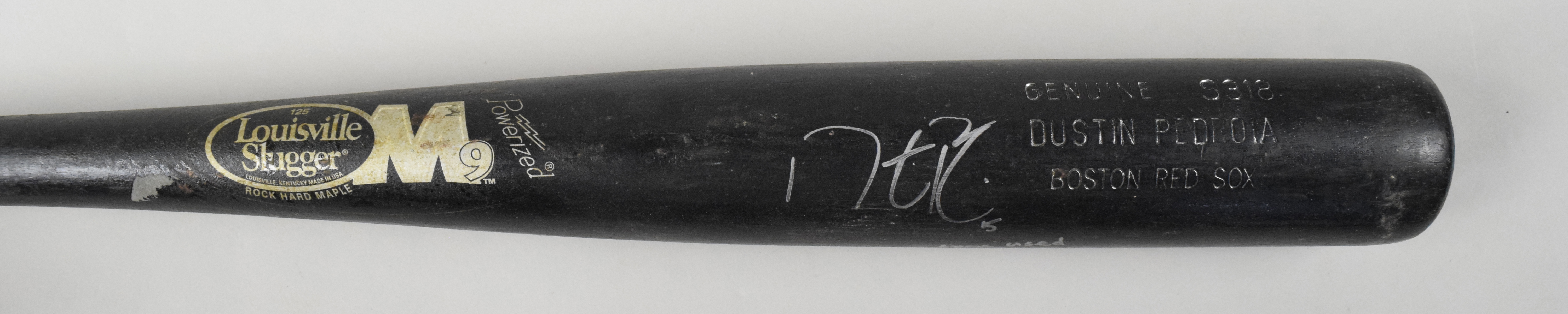 Description:Early career Dustin Pedroia signed & inscribed "Game Used" baseball bat, c.2007-08 - ROY/MVP era (EX great use). 33.75" Louisville Slugger S318 Dustin Pedroia model bat with his #15 written on the knob and cupped end. Pedroia signed the bat in silver marker and added "Game Used" inscription. Signature rates 8/9 out of 10. Marvelous use with ball marks, grain swelling, and heavy pine tar residue caked on the handle: EX ($500-$750)