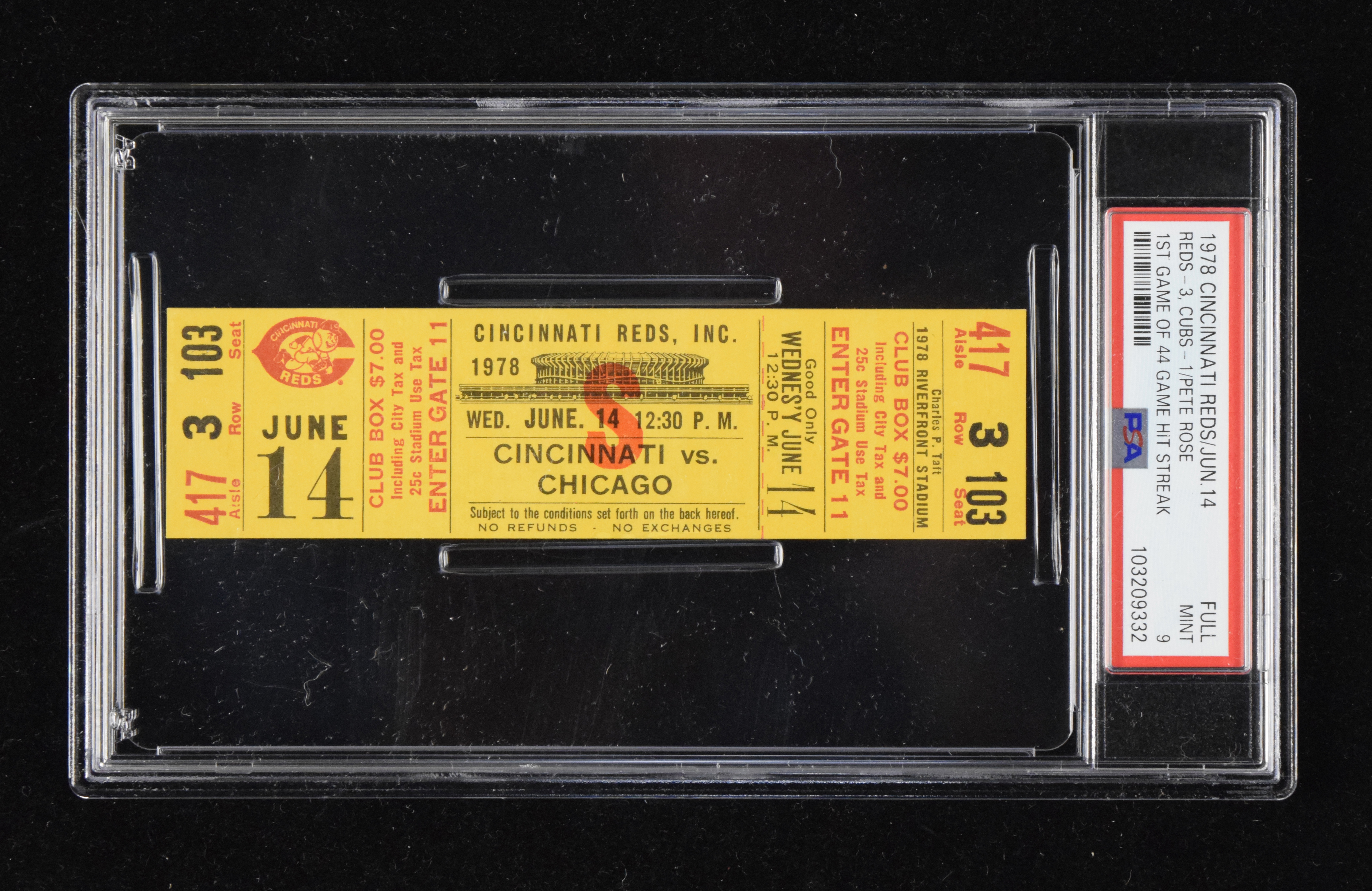 Description:1978 Pete Rose 1st game of 44-game hit streak full ticket graded PSA 9 - Pop 1 (MT). 6/14/1978 Chicago Cubs at Cincinnati Reds full ticket for game in which Rose went 2-4 to begin what would become a National League record 44-game hitting streak. Graded PSA 9, and their population report show it as being the only graded example: MT ($500-$750)