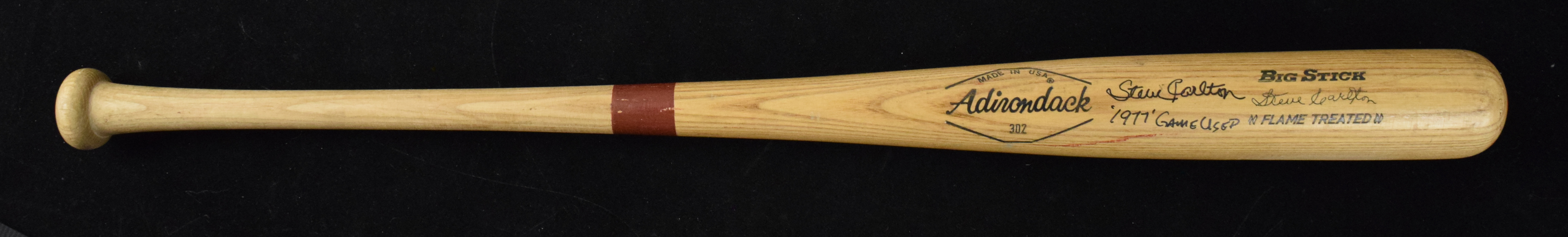 Description:Steve Carlton signed & inscribed "1977 Game Used" corked baseball bat - PSA/Taube (EX). 35" Adirondack 241A Steve Carlton model bat weighing 33.7-oz. with his #32 written on the knob. Carlton signed the bat in black marker and added "1977 Game Used" inscription. Signature rates 8/9 out of 10. Includes a John Taube LOA from PSA confirming the 1977 year, stating that the bat remains uncracked and game ready, and noting that the bat appears to be corked. Matching serial #1B37876 sticker is on the bat. Scattered surface wear including red rack marks: EX ($1,000-$2,000)