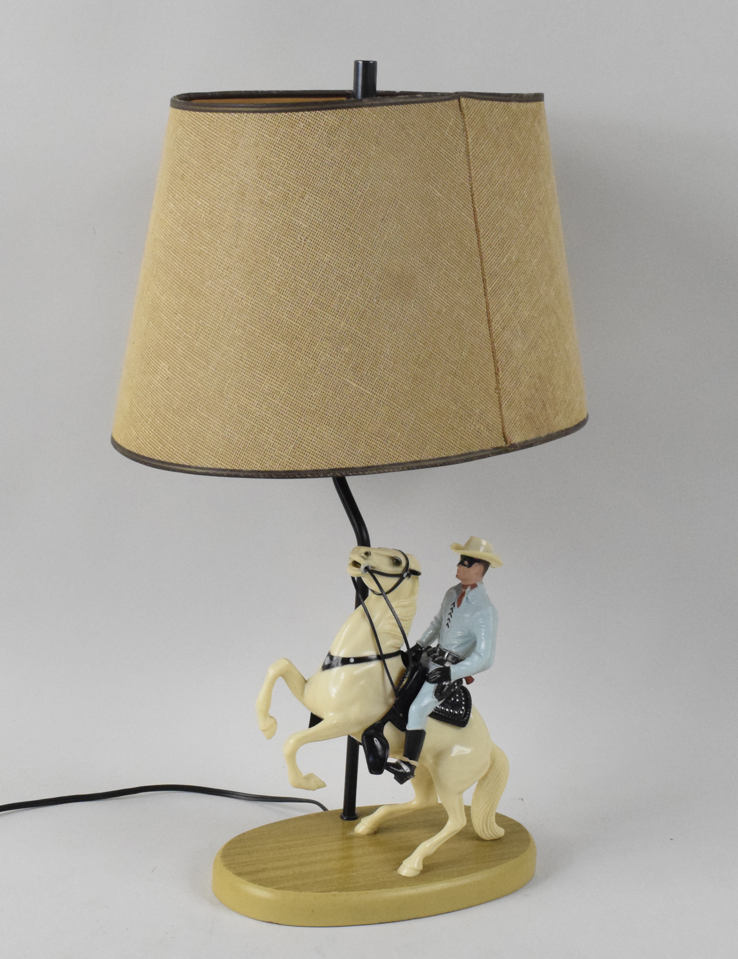 Description:Lone Ranger vintage Hartland lamp, c.1950s (EX/MT). Rare item produced by Hartland featuring a Lone Ranger statue sitting atop Silver mounted to the wooden base. Both guns are still in holsters. Measures approx. 22" tall from the bottom of the base to the top of the shade. Still in working order, with some light natural age wear: EX/MT ($500-$750)
