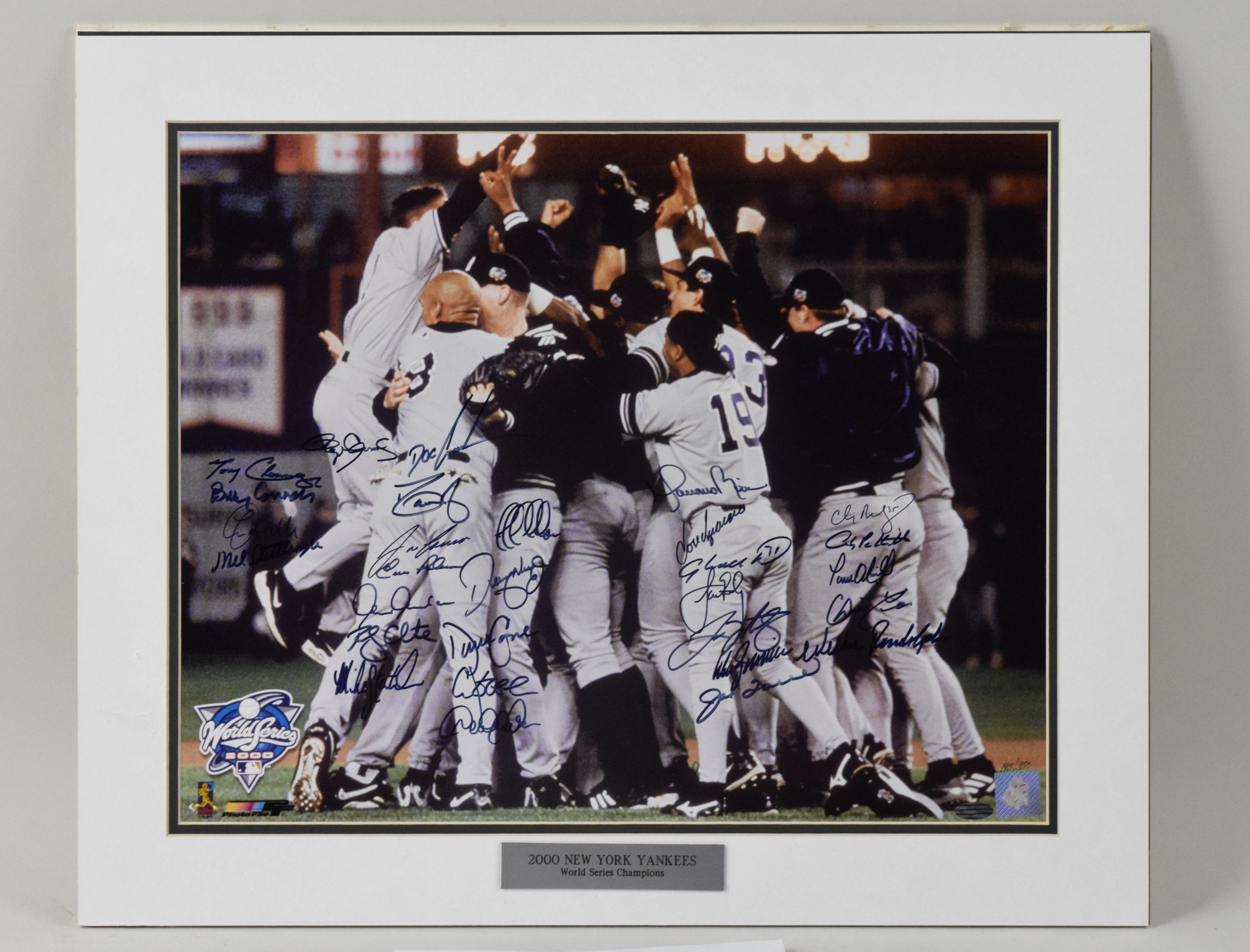 Description:2000 New York Yankees team signed oversize matted photograph - Steiner (NM). Matting measures approx. 20"x24". The photo is signed by (29) members of the 2000 World Series champion Yankees including Joe Torre, Mariano Rivera, Derek Jeter, Roger Clemens, Andy Pettitte, Dave Justice, Doc Gooden, Tino Martinez, Paul O'Neill, Jose Canseco, Dave Cone, Jeff Nelson, Glenallen Hill, Chuck Knoblauch, and others. Signatures rate 7/8 to 10 (avg 8/9) out of 10. Steiner hologram sticker is on the photo (COA not present). Due to matting, complete condition of back and edges unknown (wear around edges of matting likely from frame removal), but visible surface of the photo appears NM. ($400-$600)