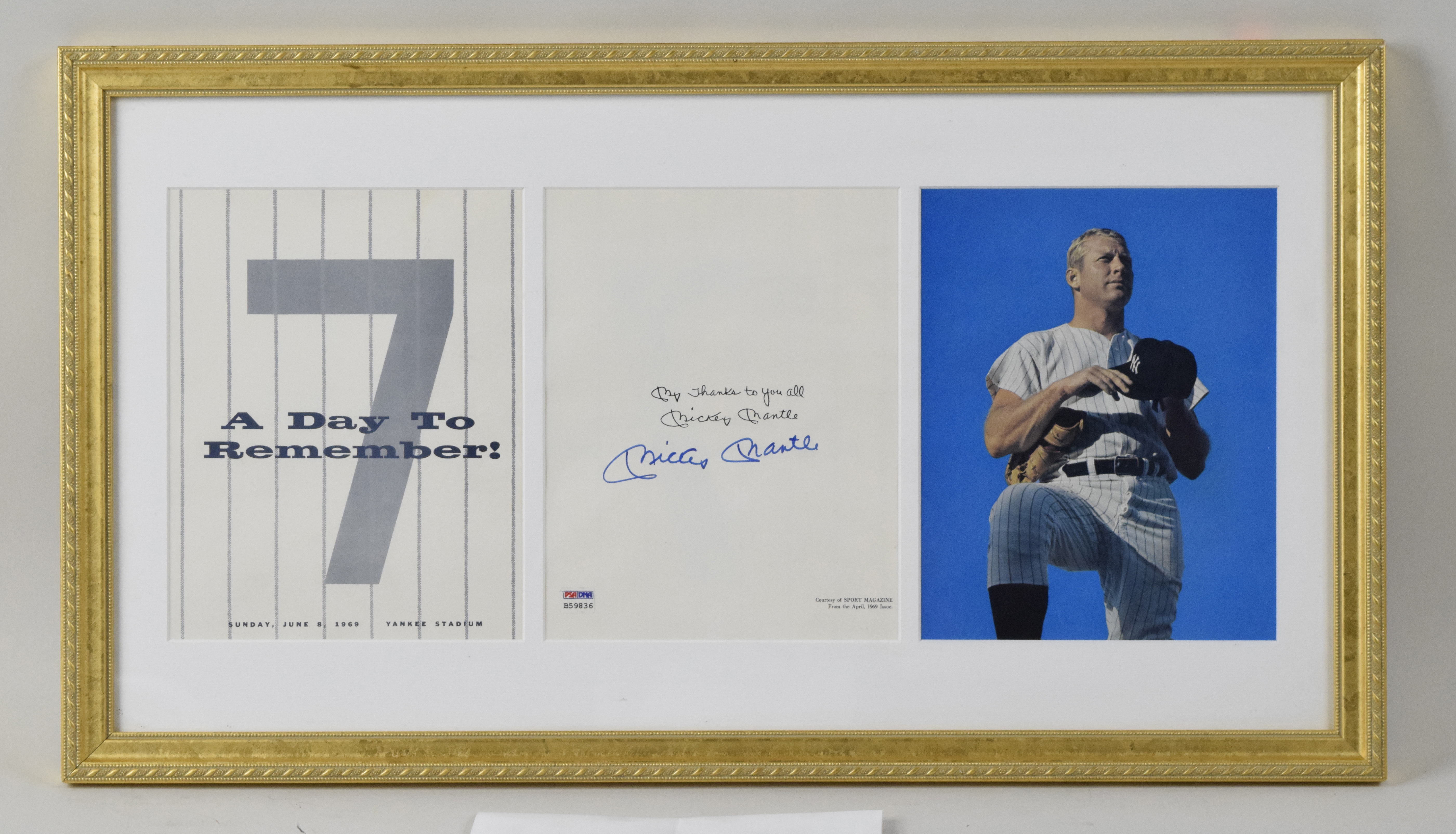 Description:Mickey Mantle signed 1969 Mickey Mantle Day framed stadium giveaway - PSA/DNA (EX/MT-NM). Approx. 16"x28.5" framed 6/8/1969 fold-open handout signed by Mantle in blue marker. Signature rates 9/10 out of 10. PSA/DNA serial #ed sticker is on the autographed page. Due to framing, complete condition is unknown: EX/MT-NM appearance ($400-$600)