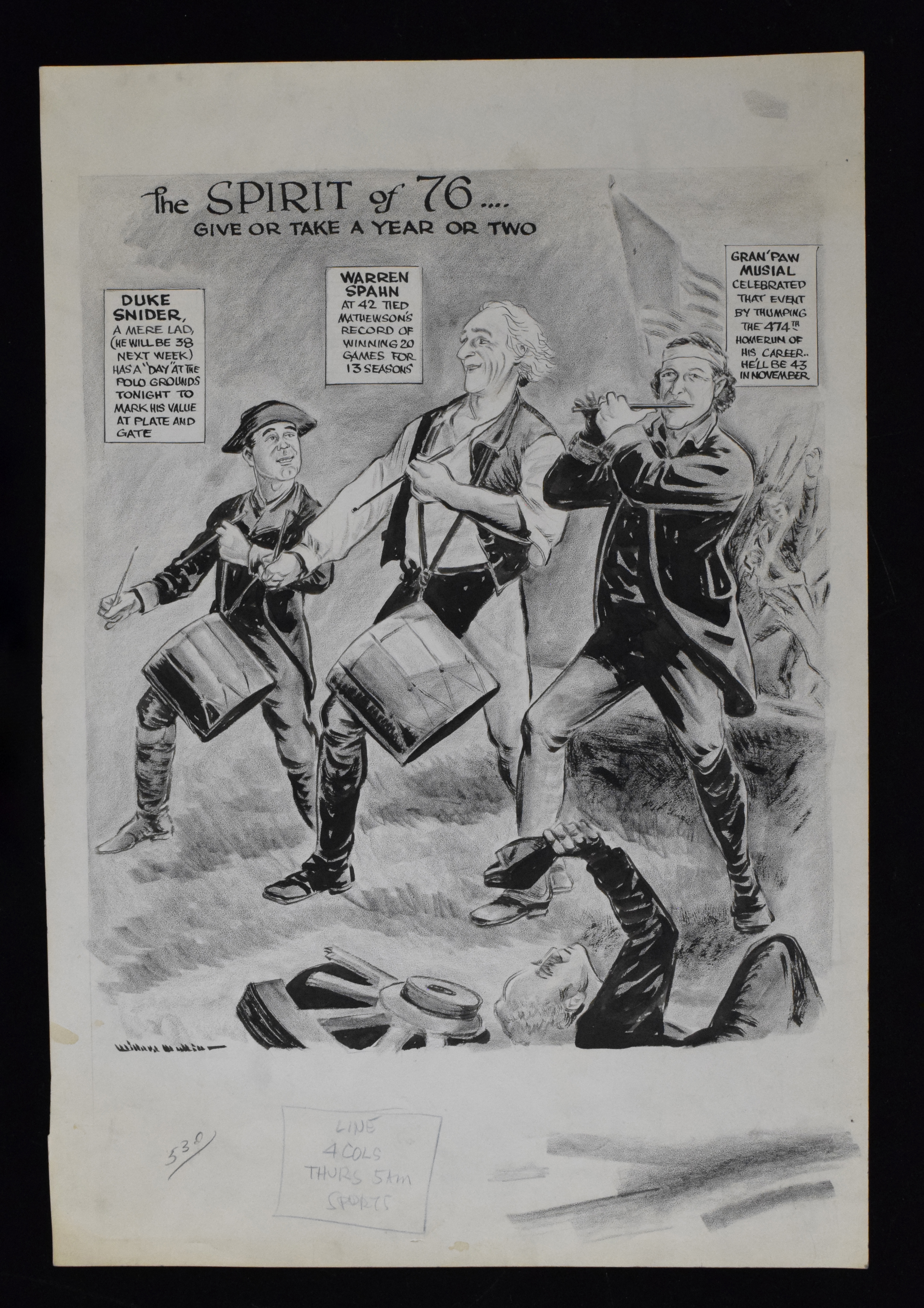 Description:1963 Willard Mullin original artwork depicting Musial, Snider, and Spahn (EX). Approx. 15"x22" "The Spirit of 76" drawing which depicts Stan Musial, Duke Snider, and Warren Spahn as members of an American revolutionary band. Mullin signed the bottom left corner in black ink. Signature rates 8/9 out of 10. Normal handling wear: EX ($300-$500)