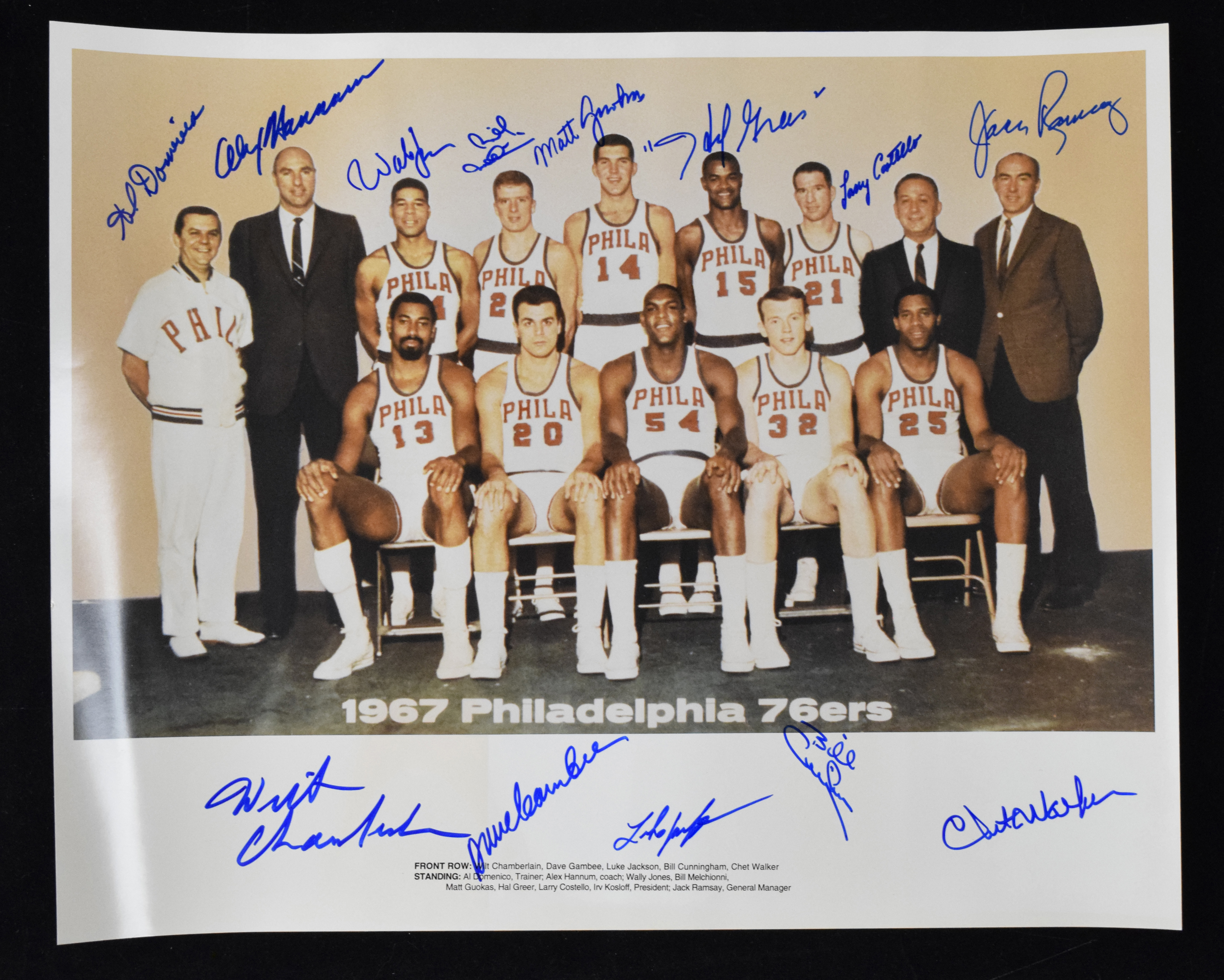 Description:1966-67 Philadelphia 76ers team signed 16"x20" photograph - NBA Champions (NM). Signed by (13) including Jack Ramsay, Alex Hannum, Wilt Chamberlain, Hal Greer, Chet Walker, Larry Costello, Billy Cunningham, Luke Jackson, Wali Jones, Dave Gambee, Matt Guokas, Bill Melchionni, and trainer Al Domenico. Signatures rate 8 to 10 out of 10: NM ($750-$1,500)