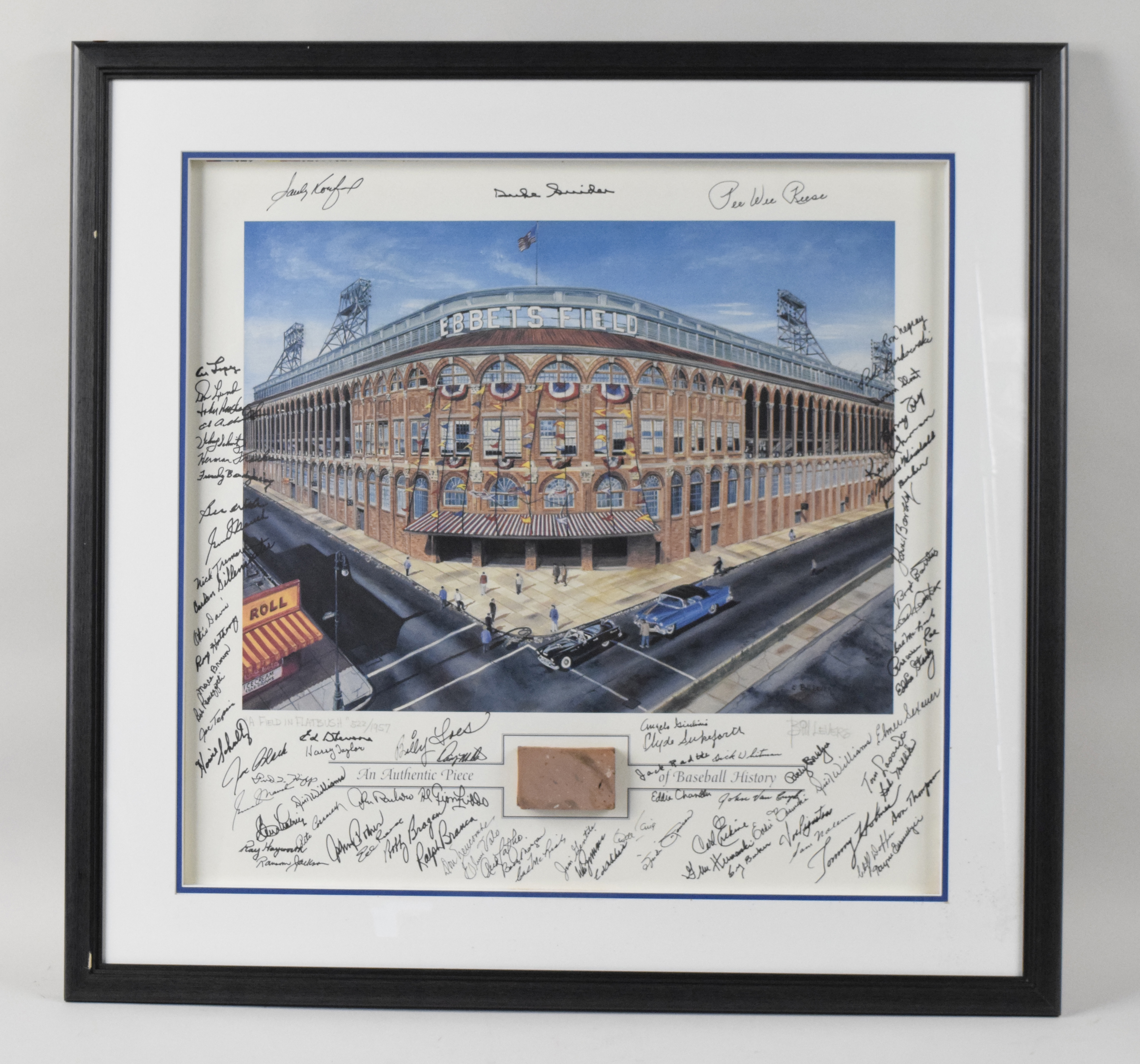 Description:Impressive Ebbets Field framed lithograph with (50+) Dodger signatures, including Koufax, Snider & Reese (Sigs. MT). Attractive "A Field Flatbush" lithograph by artist Bill Levers is numbered 522/1957 and includes a piece of brick attributed to Ebbets Field mounted in the frame. Litho has been signed in black marker by more than (50) Dodgers, including Sandy Koufax, Duke Snider and Pee Wee Reese in the top margin. Other notable signers include Tommy Lasorda, Ralph Branca, Johnny Podres, Carl Erskine, Al Giofriddo, Don Newcombe, Joe Black, Jim Gentile, Preacher Roe, Andy Pafko, Eddie Stanky, Don Zimmer, Eddie Stanky and many more. Signatures rate 9/10 out of 10. Piece has been professionally framed and matted to approx. 35"x34" and appears EX/MT. ($500-$750)
