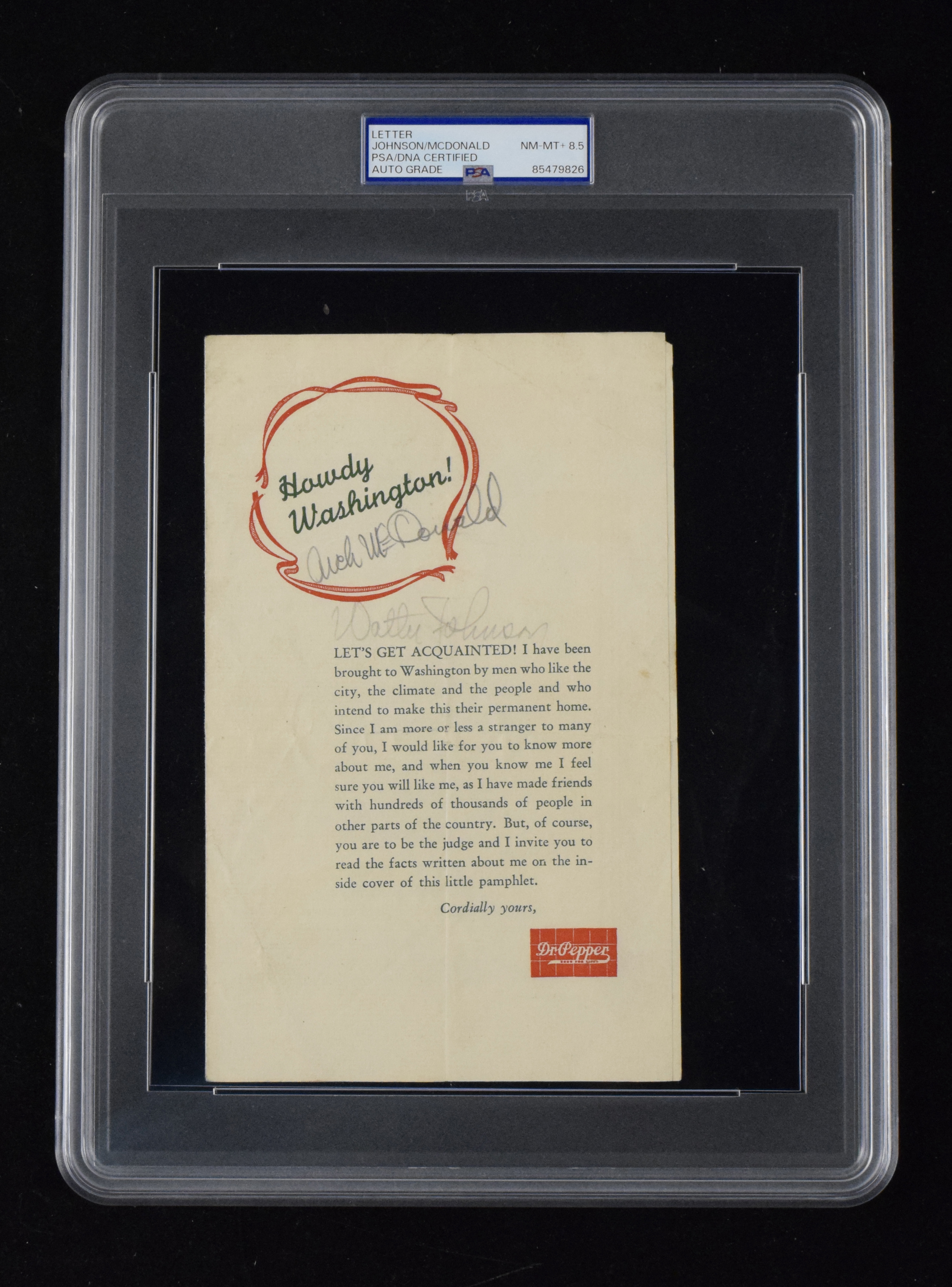 Description:Walter Johnson & sportscaster Arch McDonald signed Dr. Pepper pamphlet, c.late 1930s (autos graded PSA 8.5 NM/MT+). Approx. 5.5"x8.5" Dr. Pepper Bottling Co. pamphlet promoting their new location in Washington. Signed on the front by both Walter Johnson and Arch McDonald in pencil. Authenticted and encapsulated by PSA/DNA with autographs graded 8.5 NM/MT+. Fold creases and handling wear visible (mainly on the back): VG ($750-$1,500)
