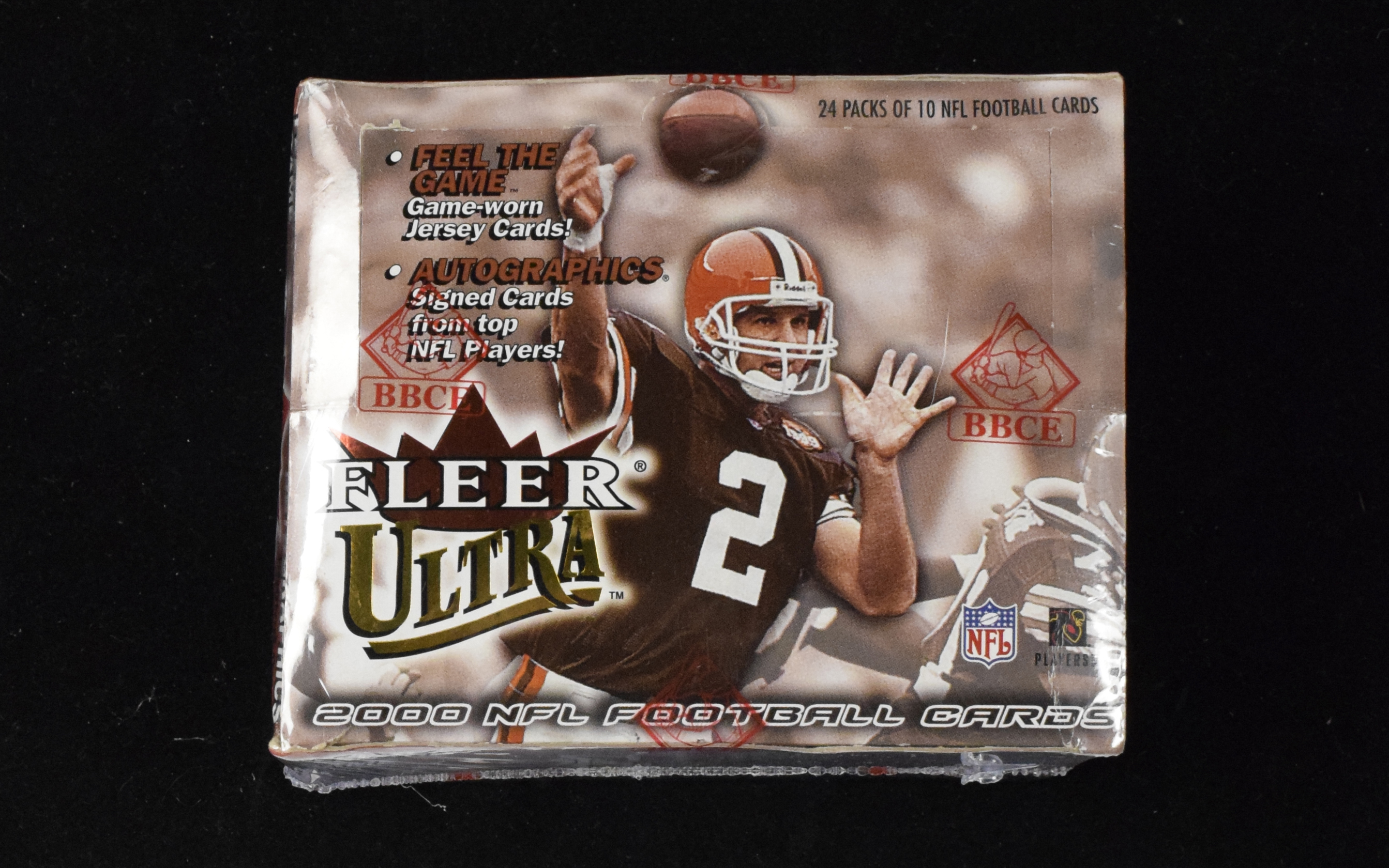 Description:2000 Fleer Ultra FB hobby box (24 packs); Tom Brady RC possible (BBCE authenticated; NM). 2000 Fleer hobby box contains (24) unopened packs, offering chances at the rookie card of 7-time Super Bowl champion Tom Brady and others. Box is not sealed in its original factory shrink-wrapping, but has been authenticated and sealed by the Baseball Card Exchange, which verified the unsealed box contains (24) unopened packs. Box has light shelf wear: NM. ($750-$1,250)