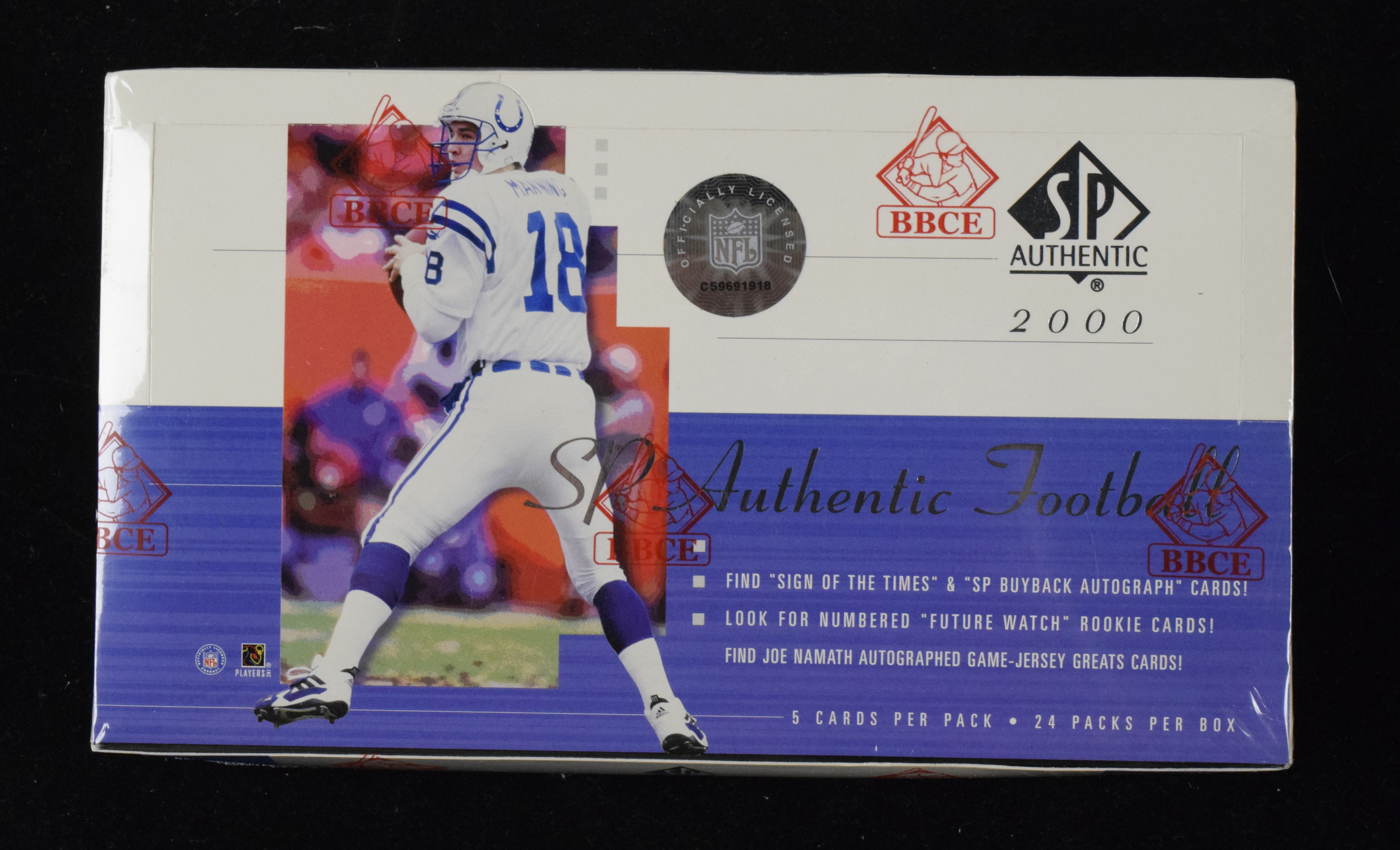 Description:2000 Upper Deck SP Authentic FB hobby box (24 packs); Tom Brady RC possible (BBCE authenticated; NM). 2000 SP Authentic hobby box contains (24) unopened packs, offering chances at the rookie card of 7-time Super Bowl champion Tom Brady and others. Box is not sealed in its original factory shrink-wrapping, but has been authenticated and sealed by the Baseball Card Exchange, which verified the unsealed box contains (24) unopened packs. Box has light shelf wear: NM. ($2,000-$3,000)