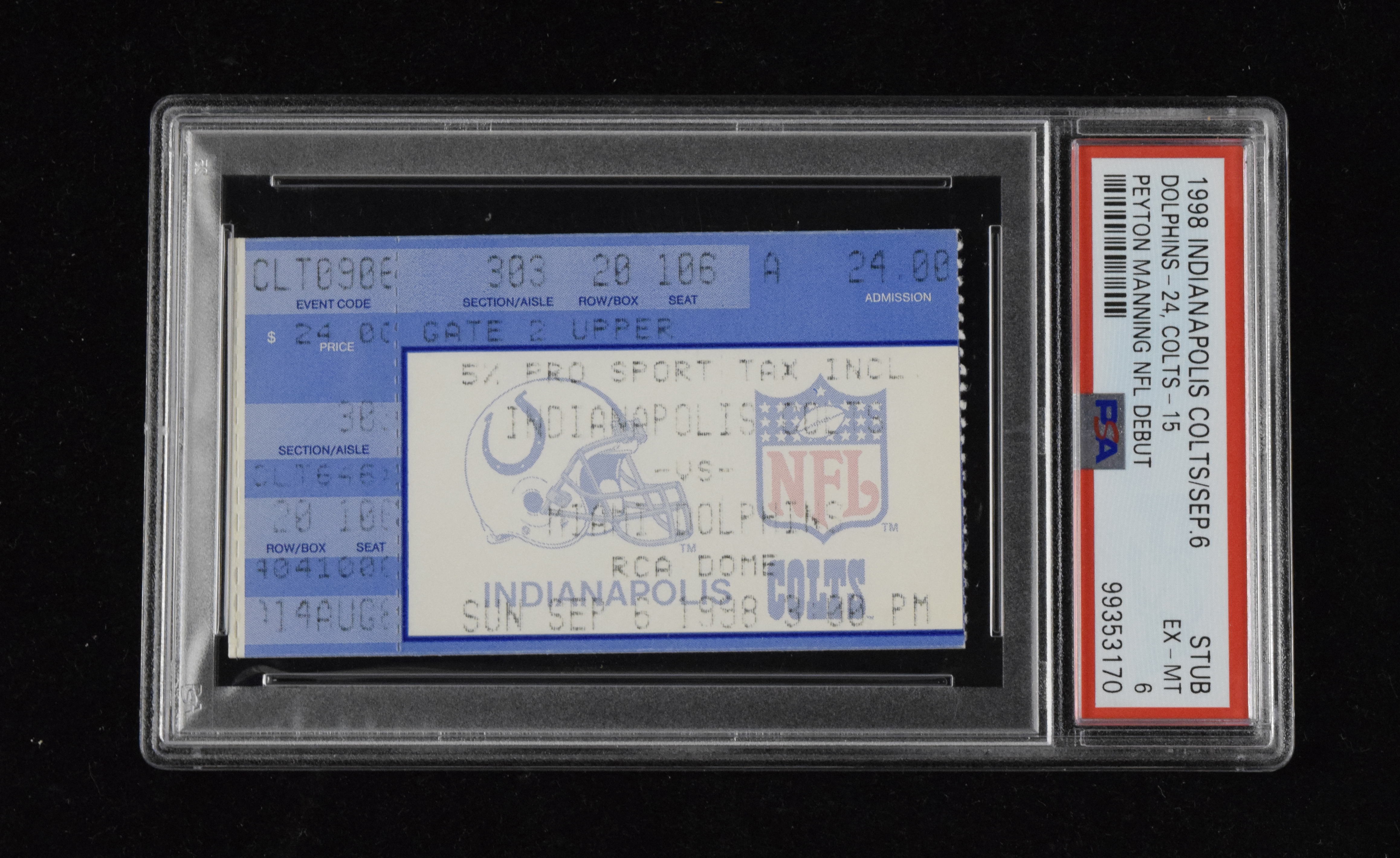 Description:1998 Peyton Manning NFL Debut ticket stub (PSA 6 EX/MT; highest graded). Outstanding original ticket stub from Peyton Manning's NFL Debut game on Sept. 6, 1998 at the RCA Dome in Indianapolis. Though the Colts lost the game to the Dolphins 24-16, Manning would go on to a Hall of Fame career highlighted by two Super Bowl victories. Clean stub with an even tear-line has only minor hints of corner wear, and is the highest graded stub in PSA's registry: PSA 6 EX/MT. ($500-$1,000).