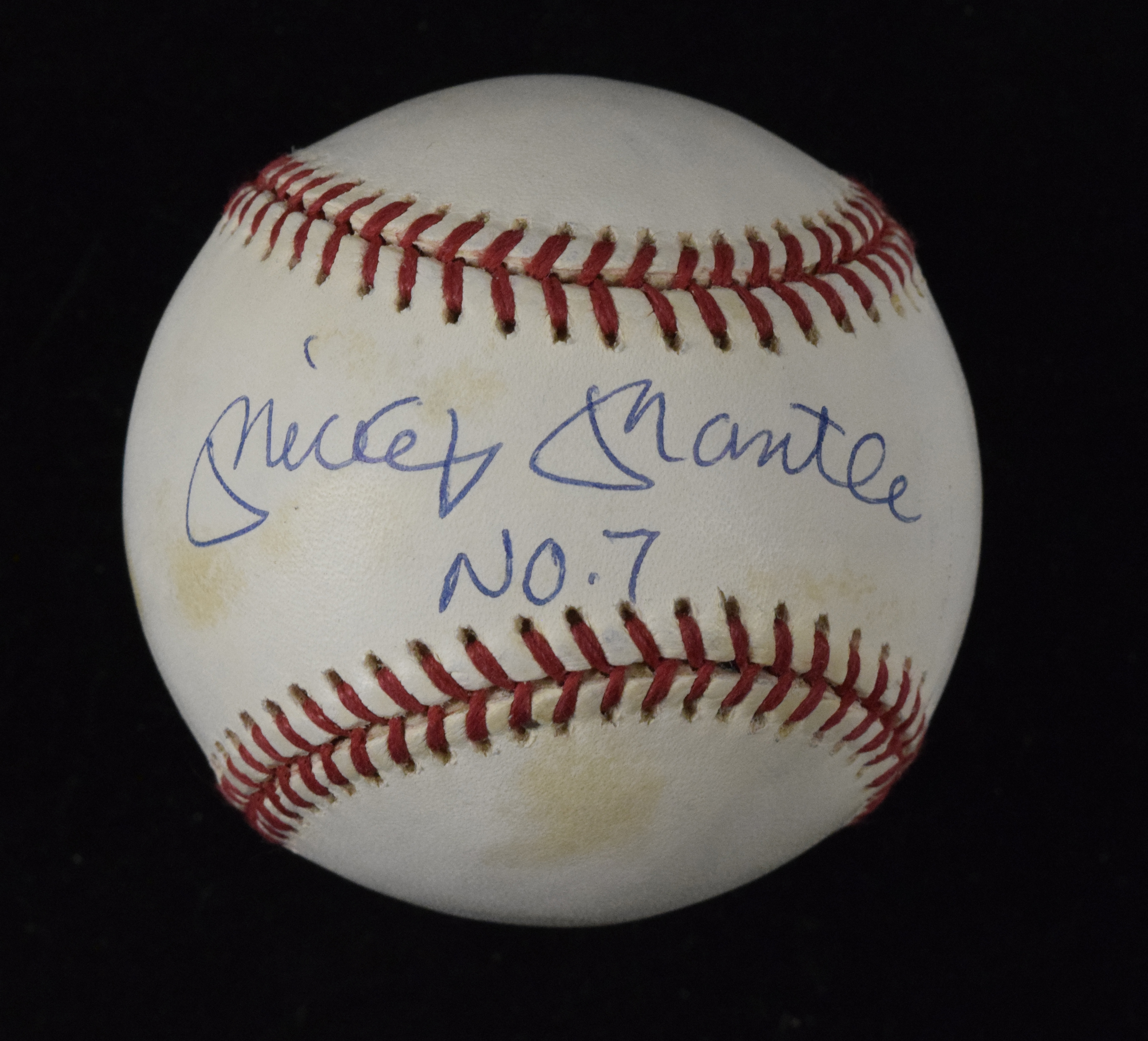 Description:Mickey Mantle autographed baseball with "No. 7" inscription (Sig. MT; Upper Deck Authenticated). B. Brown A.L. baseball has been signed on the sweet spot by Mickey Mantle with "No. 7" inscription, rating 9 out of 10. An Upper Deck Authenticated hologram is affixed to the ball, and an UDA pouch, basic cert and original box are also included. Ball is off-white with some areas of more pronounced toning/spotting: EX. ($1,000-$1,500)