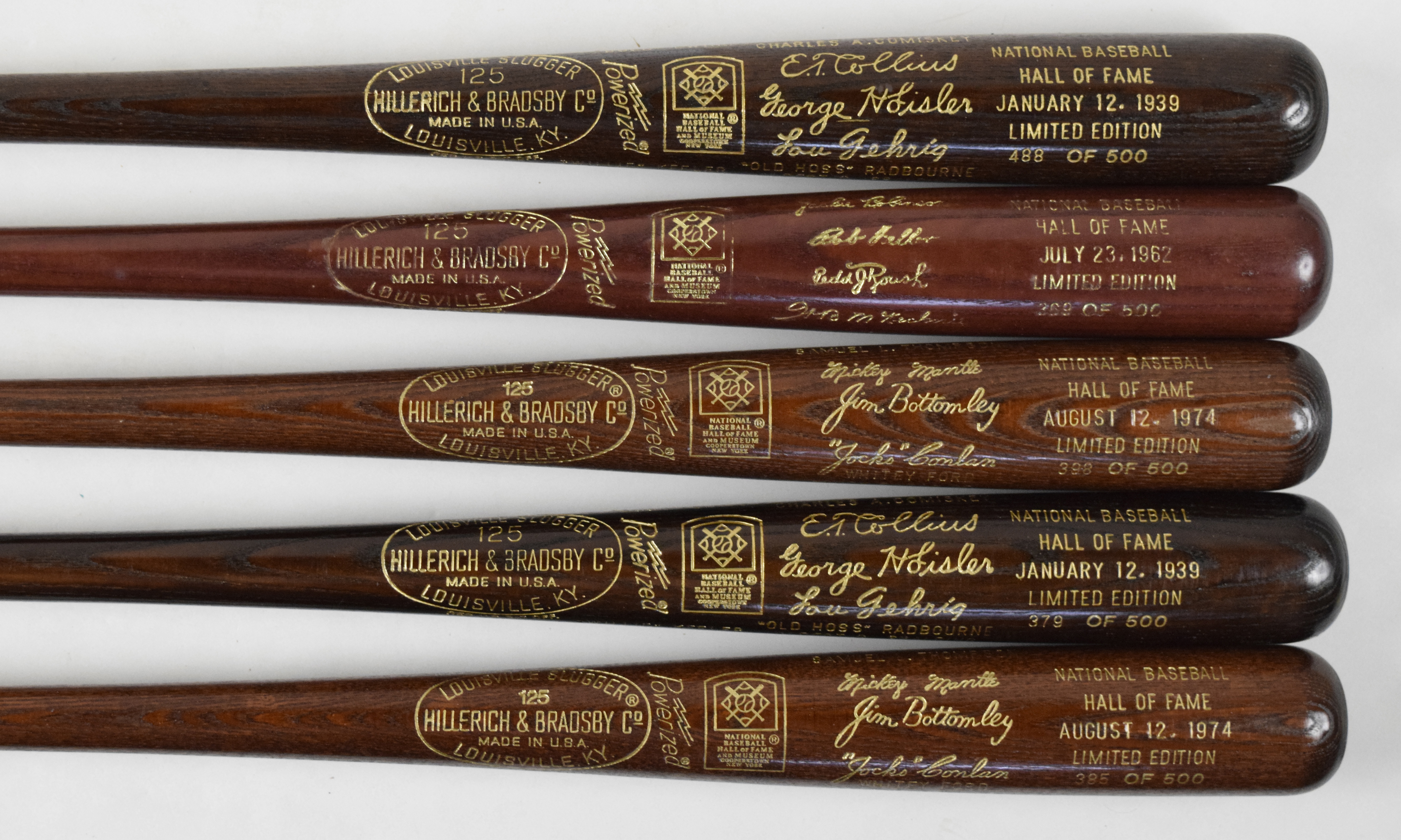 Description:Lot of (39) Baseball HOF Induction limited edition commemorative brown bats with (3) 1974/Mantle (EX-NM). Large lot of limited edition baseball bats (with heavy duplication) were done to commemorate the Hall of Fame Induction classes. Includes (4) 1939 (Lou Gehrig), (3) 1942, (3) 1946, (1) 1949, (3) 1952, (1) 1962 (Jackie Robinson), (5) 1966, (3) 1968, (2) 1969, (3) 1974 (Mickey Mantle), (3) 1975, (2) 1989, (1) 1990, (4) 1992 and (1) 1993. Light wear to a few pieces mentioned largely for accuracy, with most on the higher end of the grading scale: EX-NM. ($1,000-$2,000)