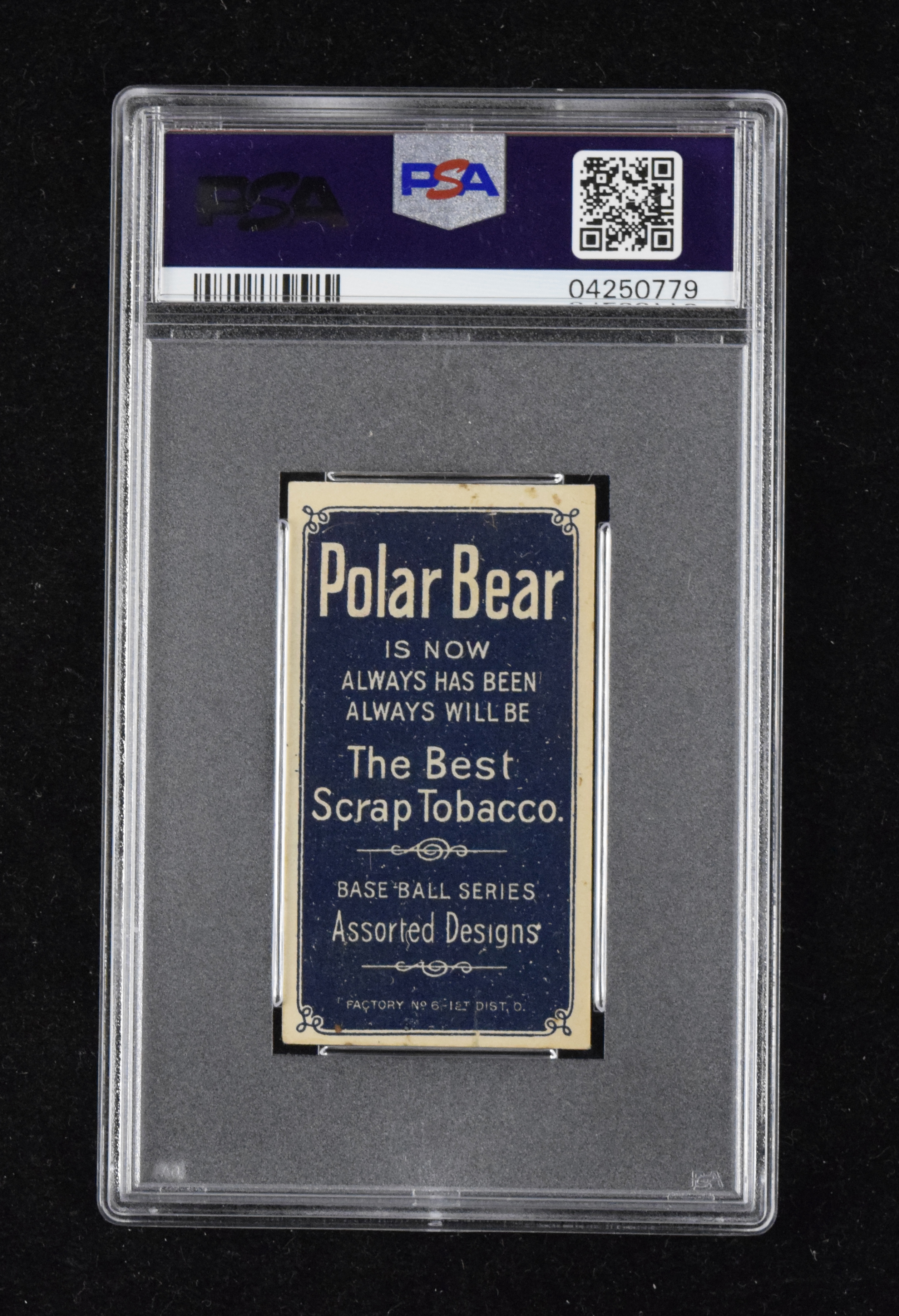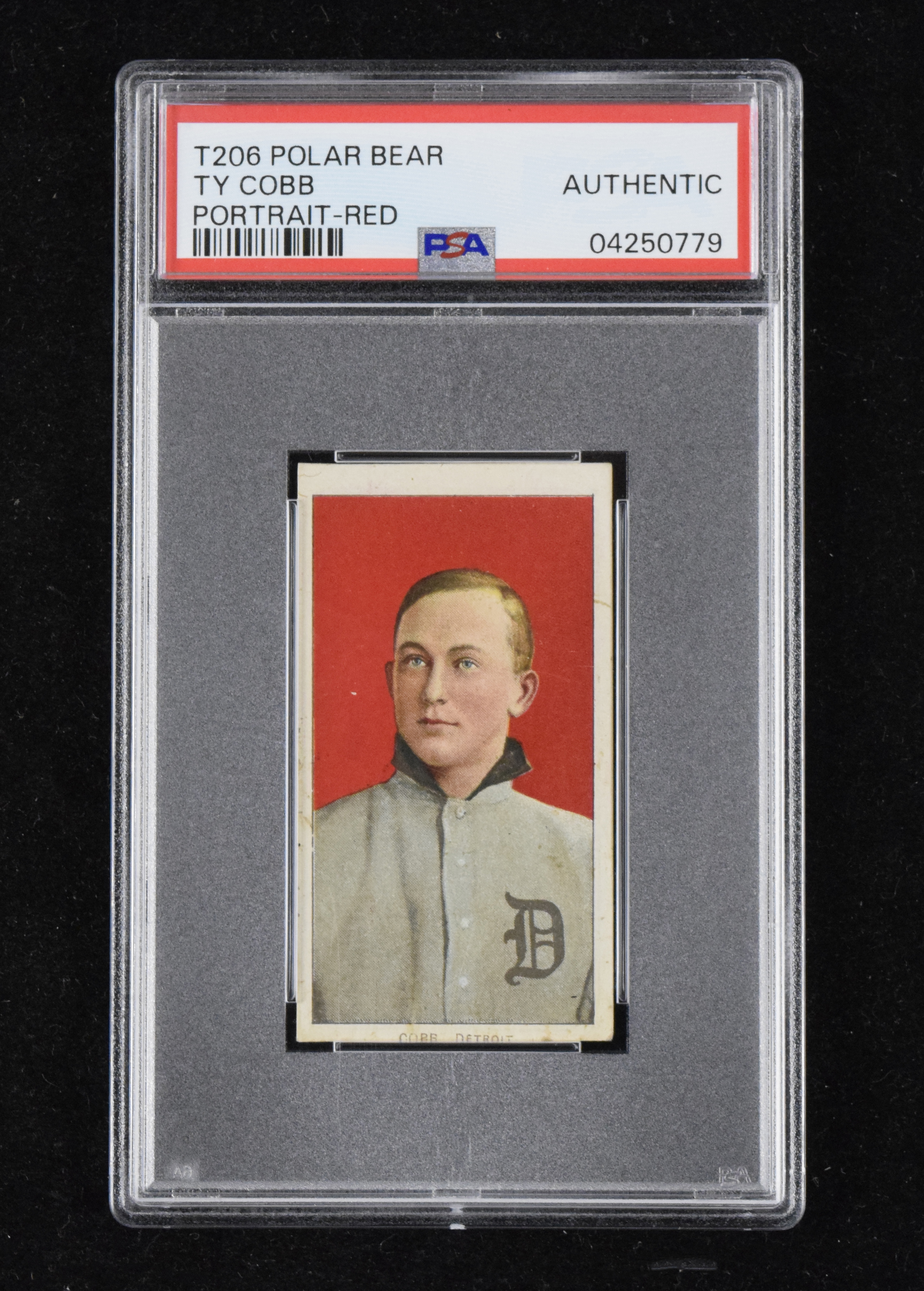 Description:1909-11 T206 Ty Cobb Portrait red background, Polar Bear back (PSA Authentic). Highly desirable portrait card of Cobb with a vibrant red background is centered to the bottom with light staining/spotting on the borders, also visible on the reverse. Less-common Polar Bear back appears to have a folded-over corner in the upper right, likely accounting for the PSA Authentic grade. Card is crease-free and still retains very nice eye appeal: PSA Authentic. ($2,000-$3,000)