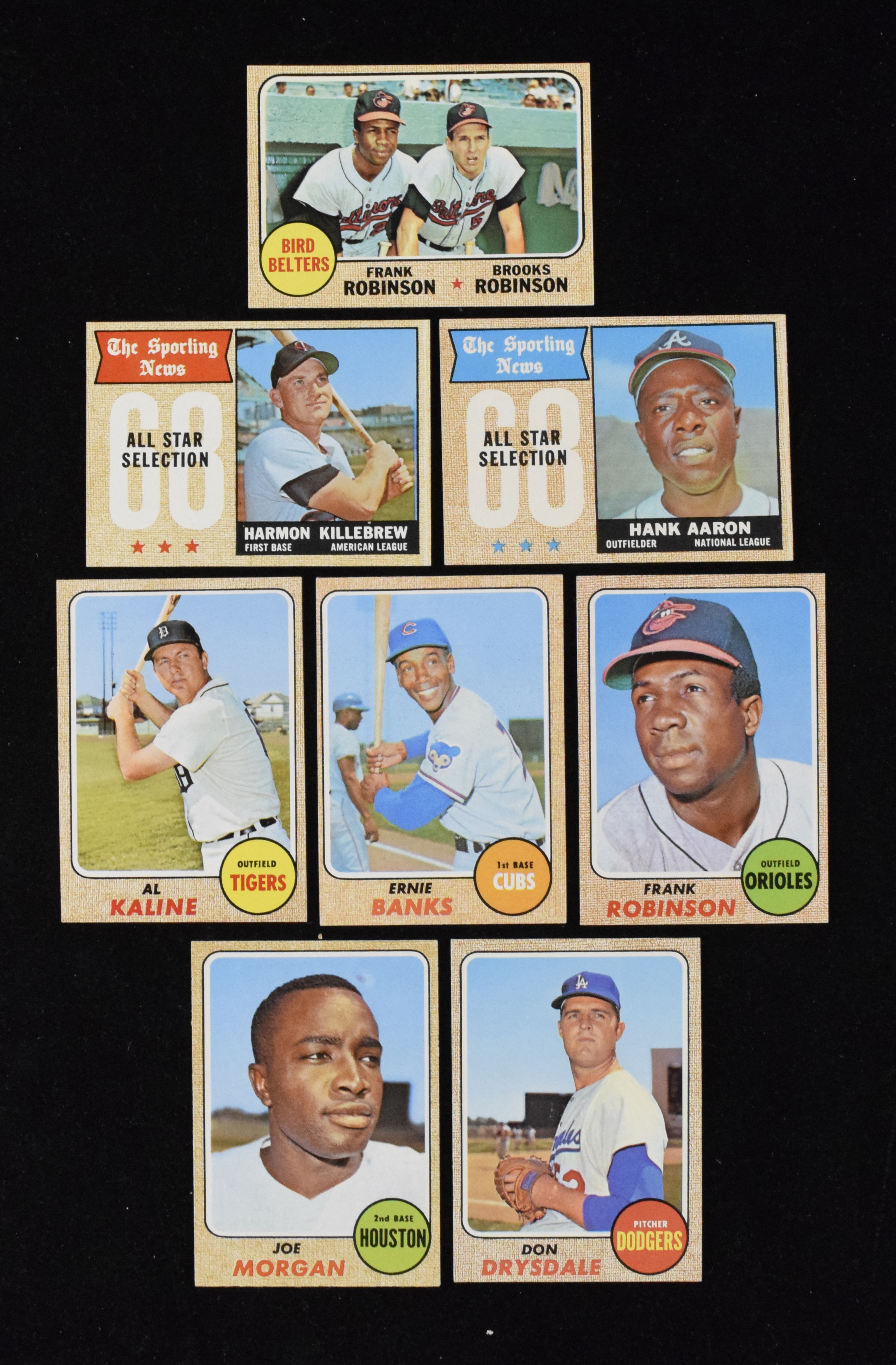Description:High-grade 1968 Topps partial set approx. (550/598) with HOFers (EX/MT-NM/MT overall). Crisp partial set of approx. 550 different cards is missing most of its major stars and rookies, though many Hall of Famers and most of the high numbers do remain. Lot is in strong condition overall (though some stars appear slightly lesser than most commons), and could be useful for thouse seeking to complete a high-grade 1968 set. Overall, it appears great care was taken in selecting cards with sharp corners and nice centering (with some exceptions). Highlights include #s 58 Eddie Mathews, 85 Gaylord Perry, 103 Don Sutton, 144 Joe Morgan, 145 Don Drysdale, 240 Al Kaline, 290 Willie McCovey, 350 Hoyt Wilhelm, 355 Ernie Banks, (18) All-Star cards, including # 370 Hank Aaron, 361 Harmon Killebrew, 363 Rod Carew, 365 Brooks Robinson, 373 Frank Robinson, 378 Bob Gibson and others, 410 Fergie Jenkins, 500 Frank Robinson, 530 Frank Robinson/Brooks Robinson, (11) League Leader cards and others. Most cards, housed in pages and a binder, appear EX/MT-NM/MT overall with some lesser here and there. Range: VG-MT. ($750-$1,500)