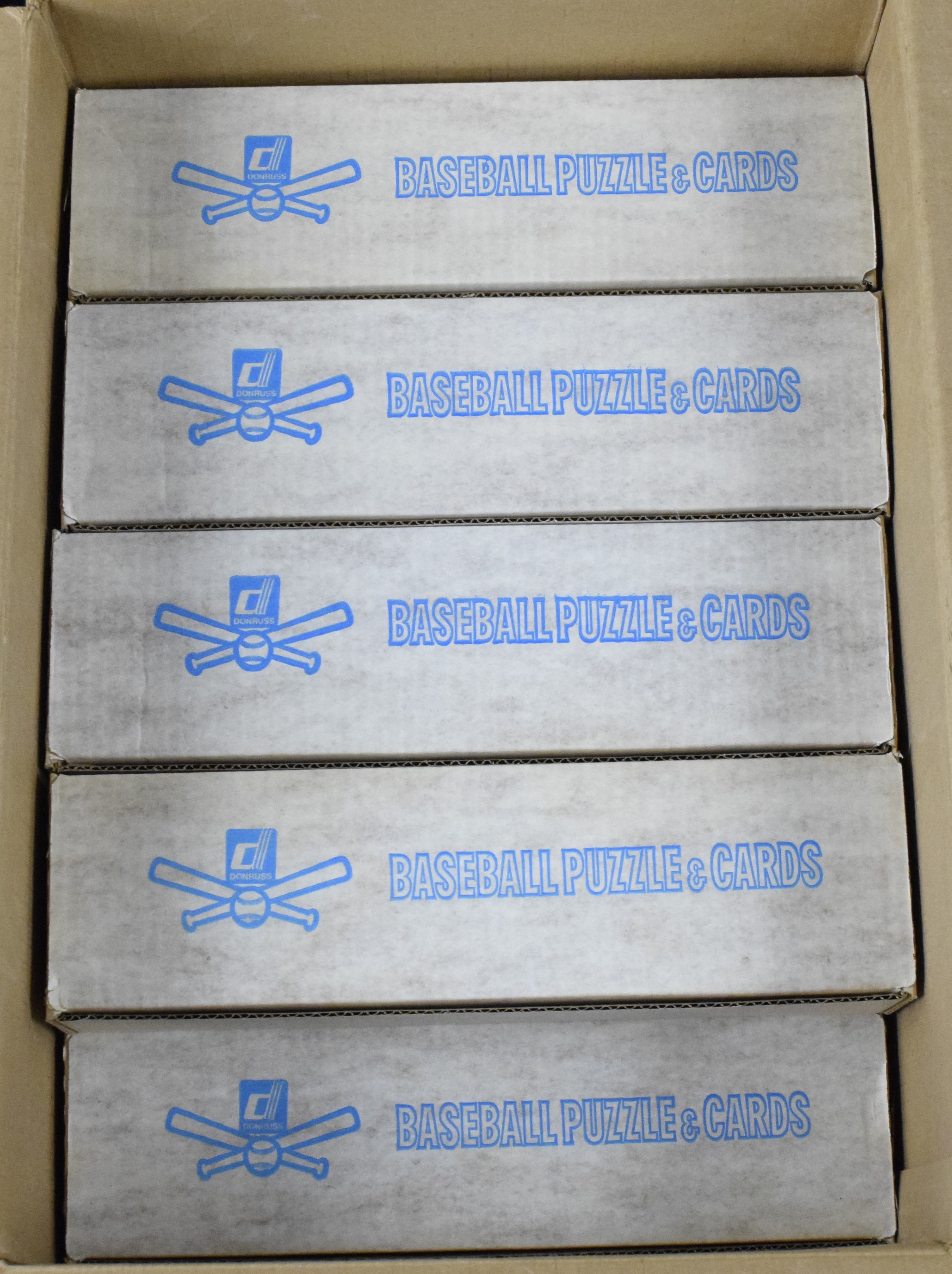 Description:1983 Donruss partial factory set case (9 factory sets) with Gwynn, Sandberg and Boggs RCs (Sets: NM/MT). Original 1983 Donruss case is open on top, and inside are (9) complete factory sets, with all cards remaining in untouched factory boxes with sealed blocks of cards (and puzzle cards) inside. Each set has the rookie cards of three Hall of Famers: Tony Gwynn, Wade Boggs and Ryne Sandberg. Factory boxes are close to pristine with little mentionable wear: NM/MT. Case has shelf wear and is retaped on the bottom: EX. ($750-$1,250)