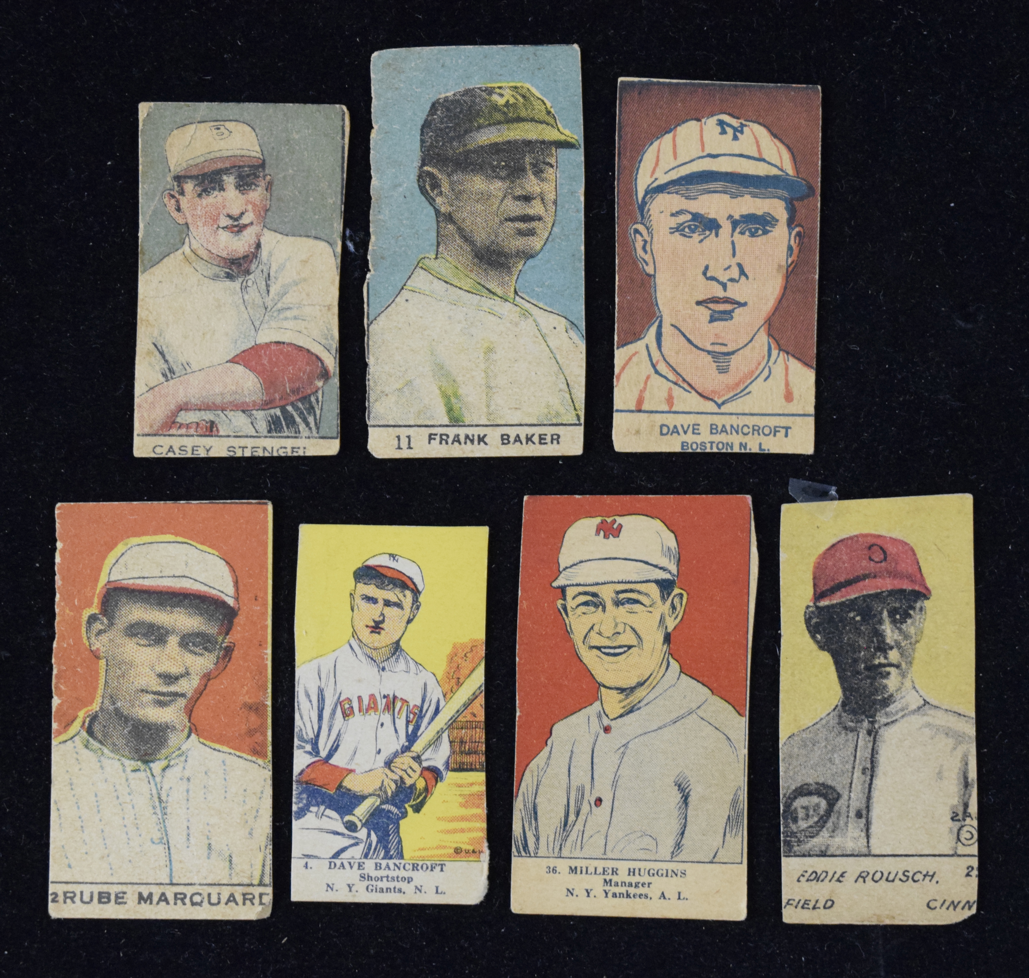 Description:Collection of (34) 1920s hand-cut strip cards with HOFers, including Frisch, Marquard and Huggins (Authentic). Outstanding quantity of original strip cards, with most cut well within the borders, and some with slightly irregular cuts. Lot includes a sampling of cards from various issues, including 1920 W522, 1923 W515-1, 1920 W520 and 1925 W590. Includes Rube Marquard,The Barnes Bros., Ed Roush, Miller Huggins, Frankie Frisch, Casey Stengel, Frank Baker, Everett Scott, (2) Dave Bancroft, Hughie Jennings, Earl Smith, Milton Stock, Leon Cadore, Aaron WardGuy Morton, Bob Veach, Wally Pipp, Hank Gowdy, Ed Hooper, Gavvy Cravath, Whitey Witt, George Uhle, Dazzy Vance, High McQuillen, Ray Schlak, Roger Peckingpaugh, Ernie Kreuger, Swede Risberg, Jim O'Connell, Johnny Griffith, Tom Griffith, Lee Meadows, Dutch Ruether and Babe Adams. Most graded Authentic due to severe cuts, with a GD-VG appearance. ($500-$1,000)